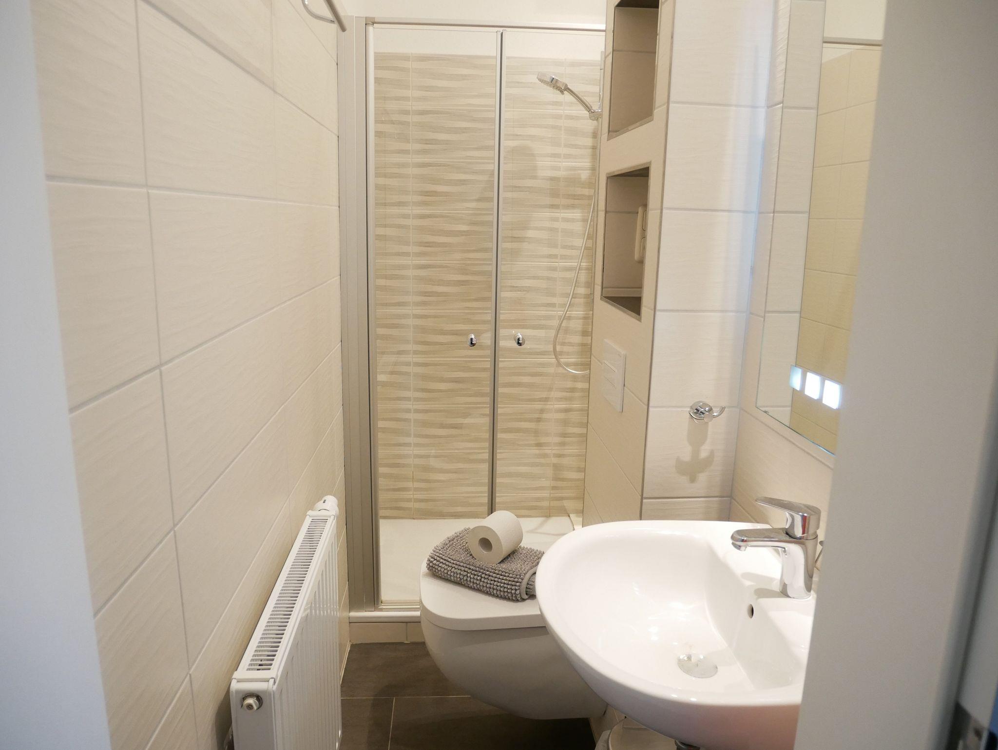 Ein Schlafzimmer ist mit zwei Einzelbetten und das andere Schlafzimmer mit einer neuen Schlafcouch ausgestattet. Die Wohnung verfügt über zwei moderne Badezimmer mit Dusche, Waschbecken und WC. Eines der Badezimmer ist mit einer ebenerdigen Dusche ausgestattet.