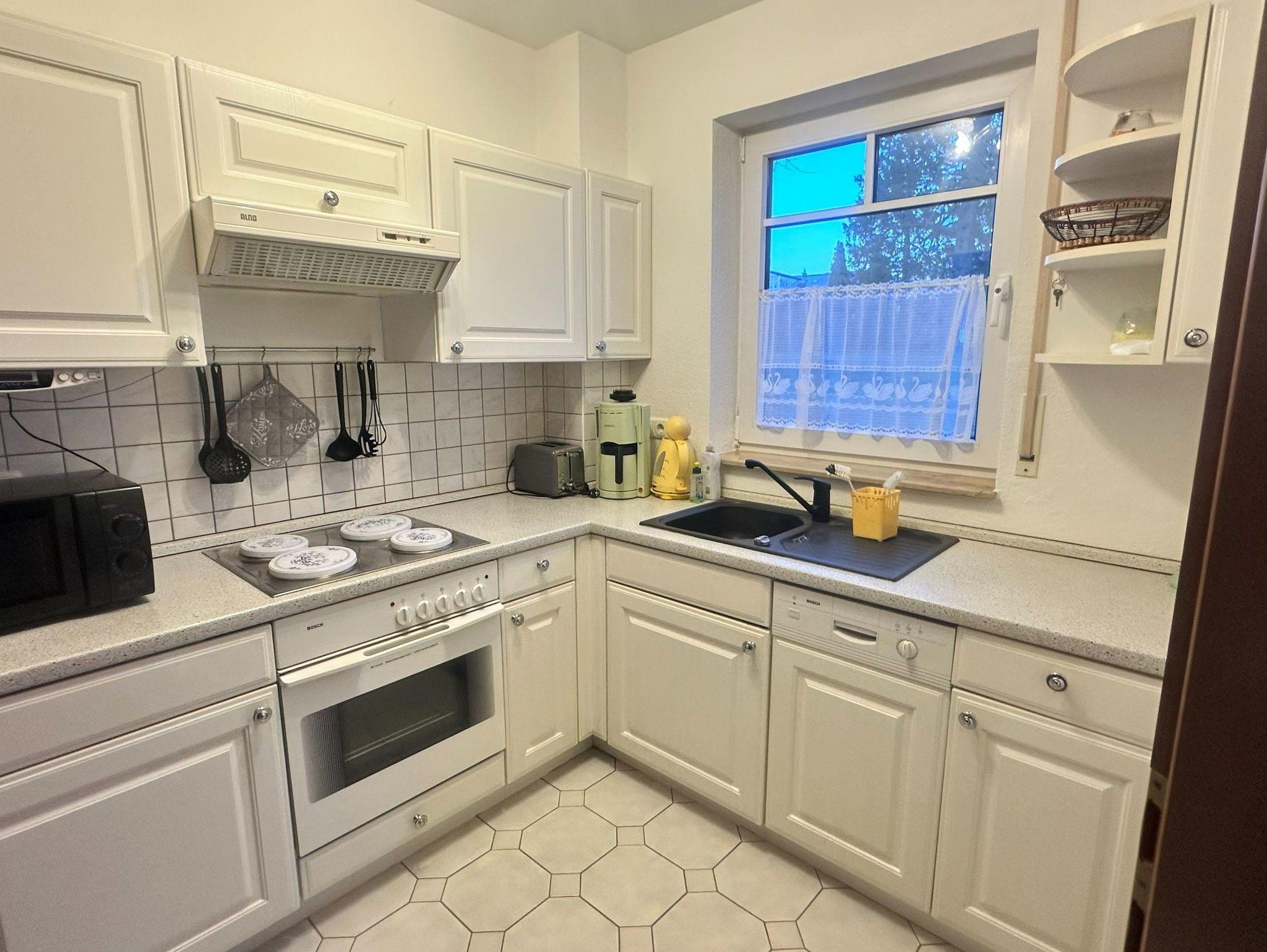 Die separate Küche ist komplett ausgestattet mit Herd, Backofen, Kühlschrank mit Tiefkühlfach, Mikrowelle, Geschirrspüler, Kaffeemaschine, Toaster, Wasserkocher und vielen weiteren praktischen Küchenhelfern. Im freundlichen Erkerzimmer genießen Sie Ihre Mahlzeiten am Essplatz; eine Auswahl an Gesellschaftsspielen sorgt hier für gesellige Stunden.