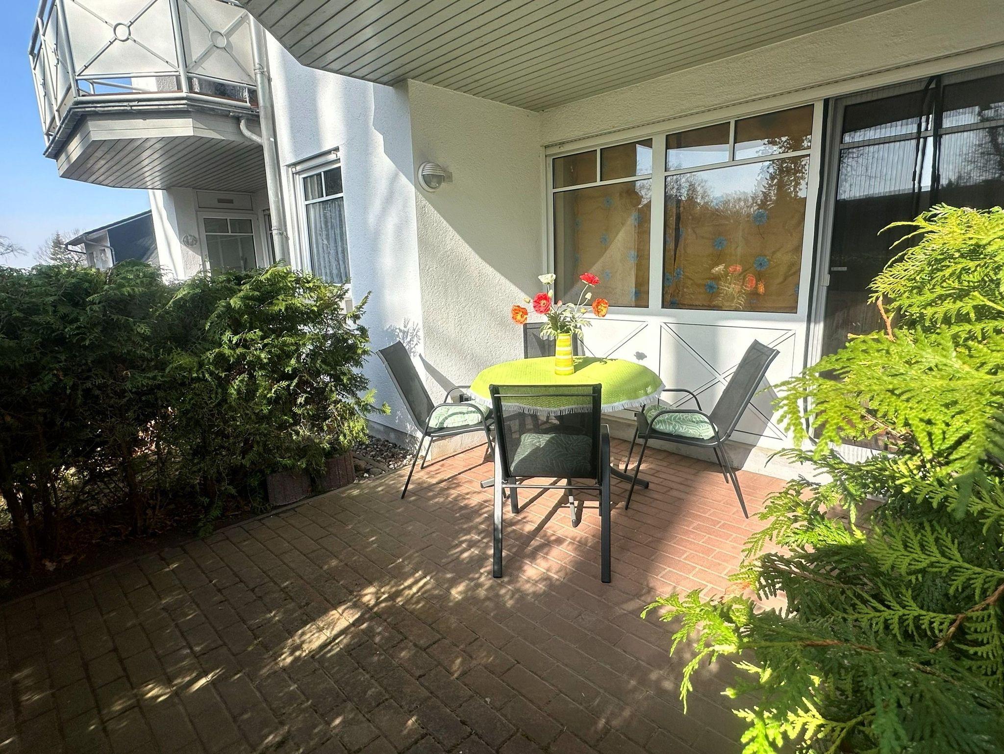Sie verfügt über über ein gemütliches Wohnzimmer, eine separate Küche, ein Essbereich im Runderker, ein separates Schlafzimmer, ein Duschbad (Waschmaschine gegen Gebühr nutzbar) und eine kleine Terrasse.