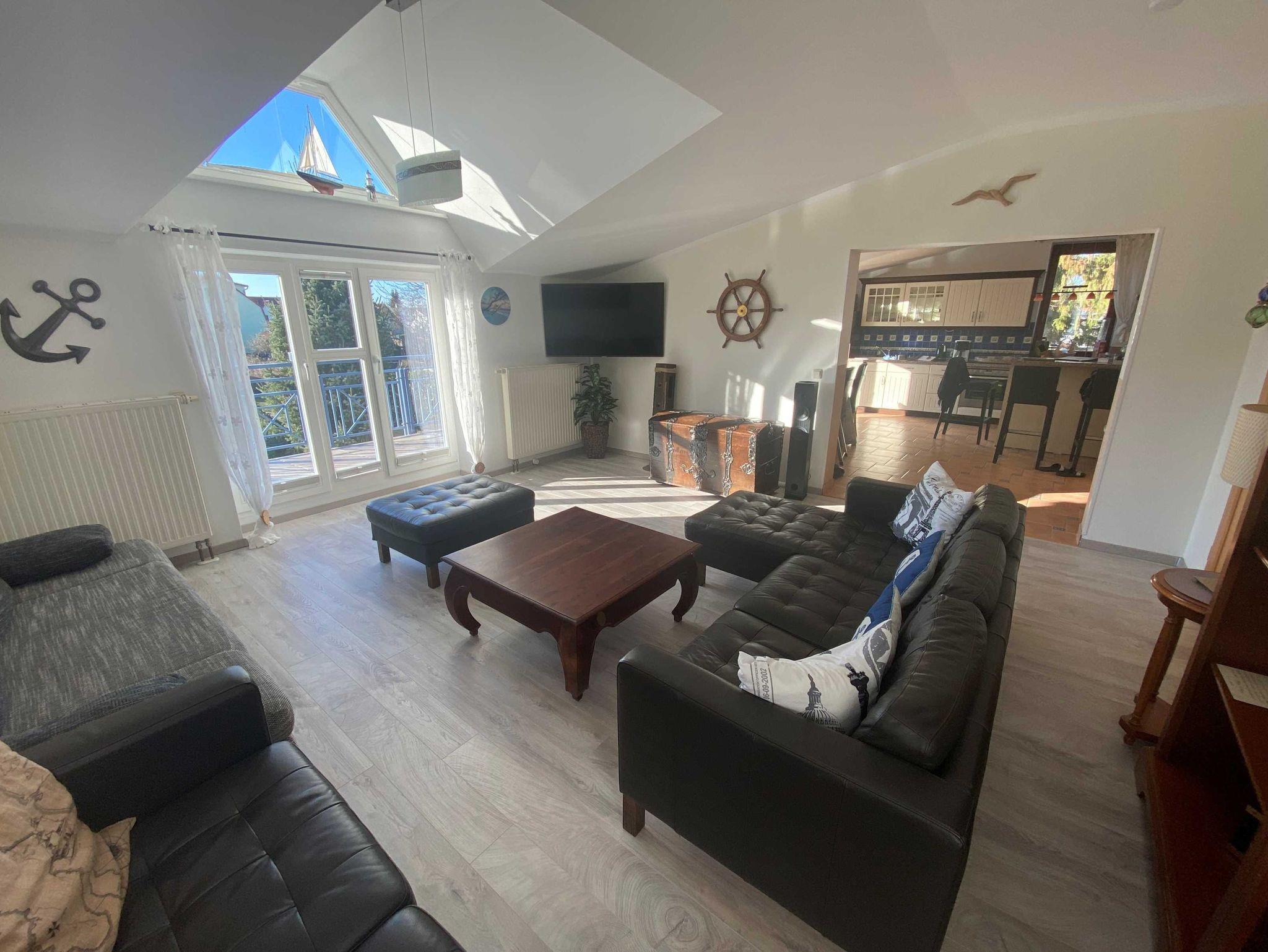 Die Ferienwohnung erstreckt sich über zwei Etagen. In der unteren Etage befindet sich der Eingangsbereich. Auf der zweiten Ebene befindet sich der Wohnbereich mit offener Küche und der Essbereich. Das große Wohnzimmer bietet genügend Platz für 6 Personen und verfügt über einen Flachbildfernseher und eine ausziehbare Couch. Die Küchenzeile ist voll ausgestattet mit einem Backofen, Kühlschrank, Mikrowelle und einer Spülmaschine.