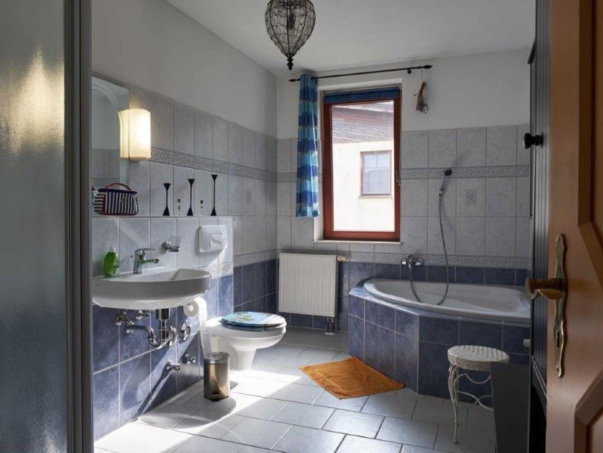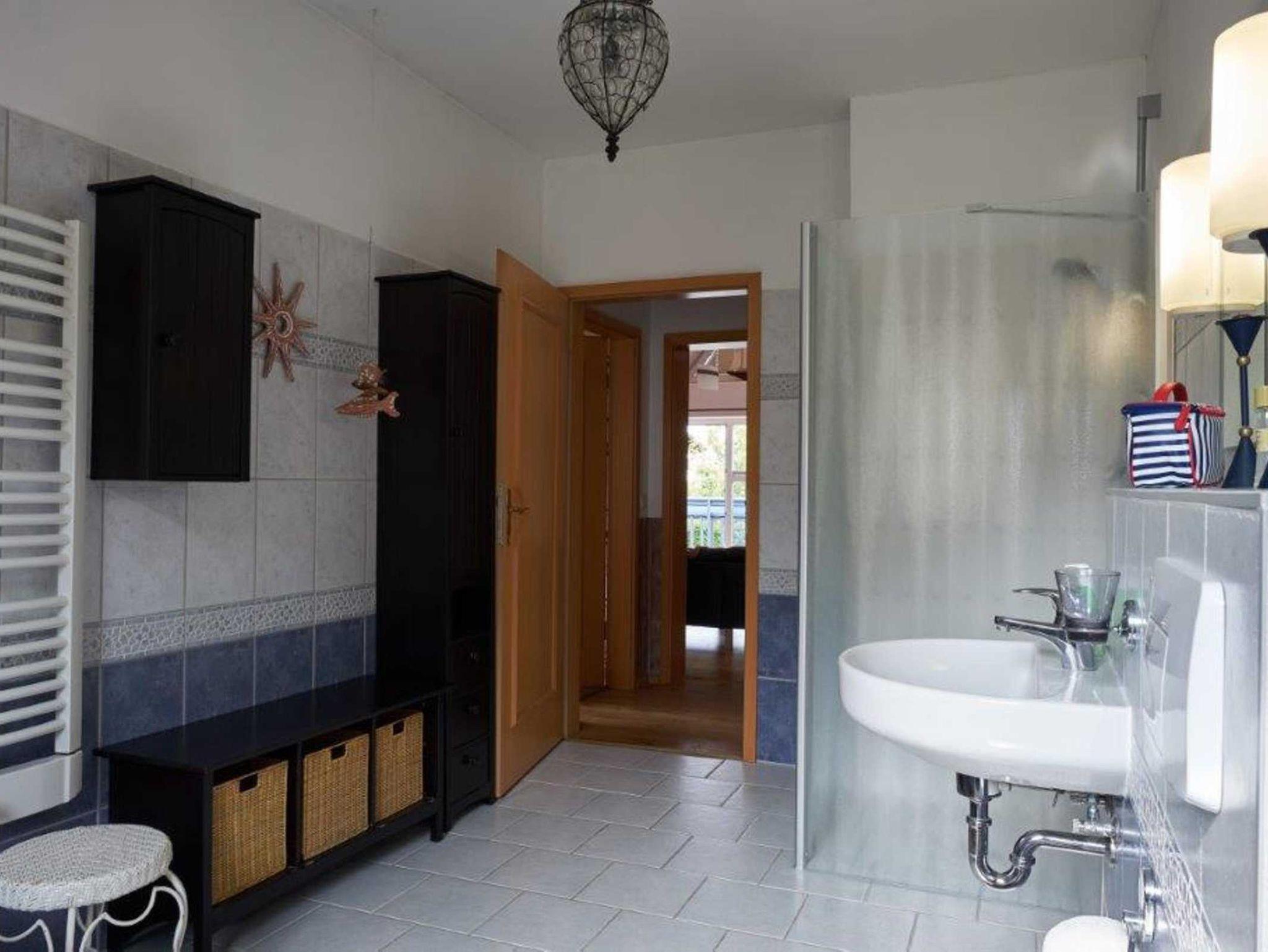 Das Badezimmer befindet sich ebenfalls im Obergeschoss und verfügt über eine große Eckbadewanne und über eine bodentiefe Dusche, sowie Waschbecken und WC. Ein Kinderbett und ein Hochstuhl sind in der Wohnung vorhanden.