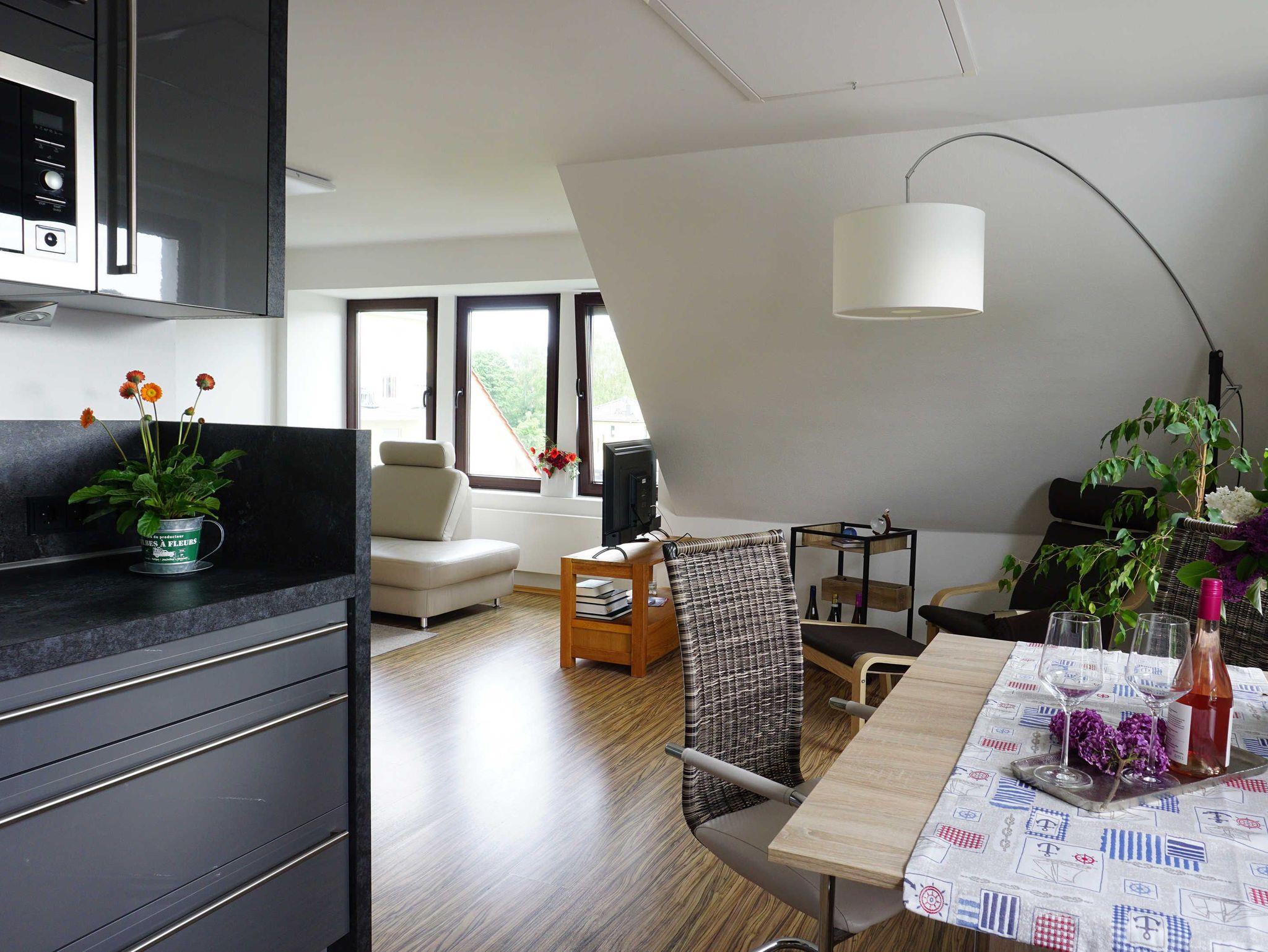 Die Ferienwohnung erstreckt sich über das gesamte erste OG. Das heißt, Sie können bei Bedarf den gesamten Tag den Sonnenschein genießen. Der offene Wohn- und Küchenbereich ist in Richtung Süden/Südwest gelegen. Die Wohnung ist also hell und freundlich, Sonnenschutzeinrichtungen sind vorhanden.