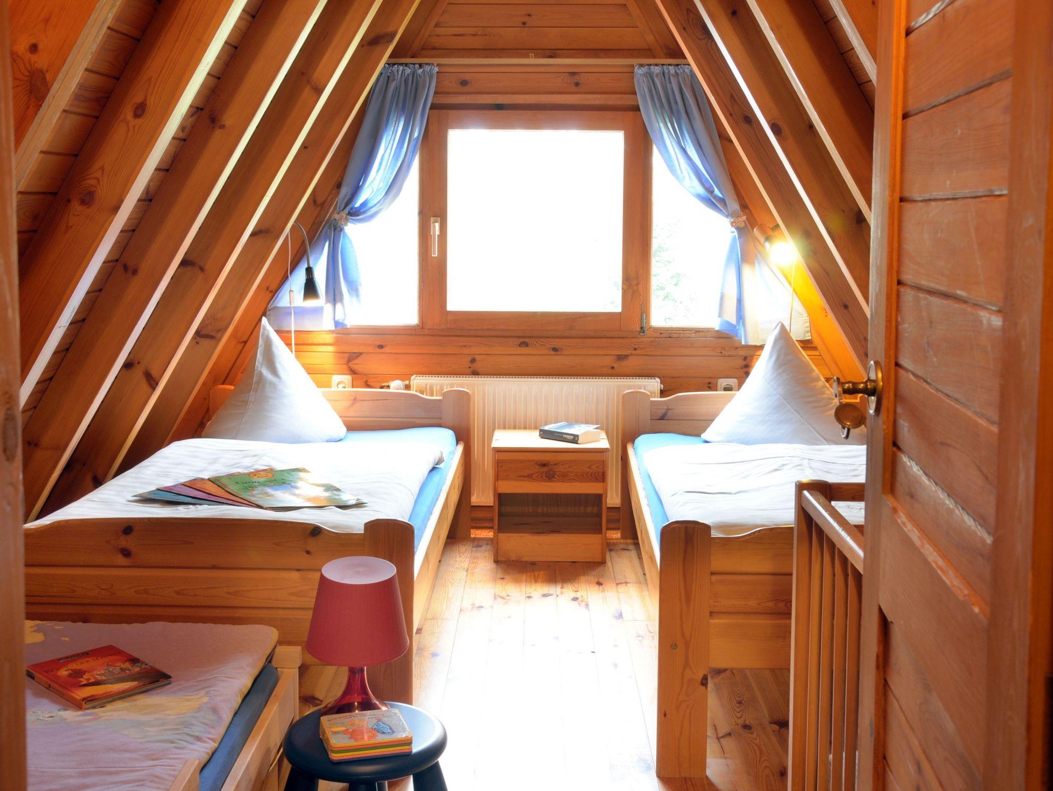 Schlafgelegenheiten im Obergeschoss mit 5 Einzelbetten, 1 Junior- und 1 Kinderbett.