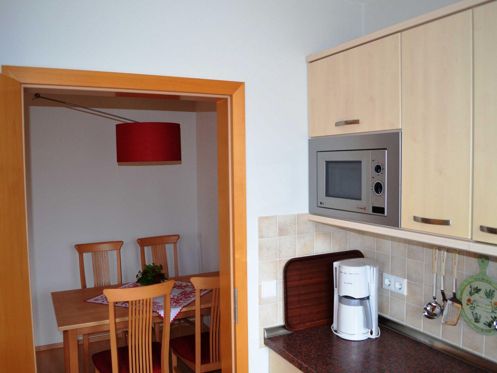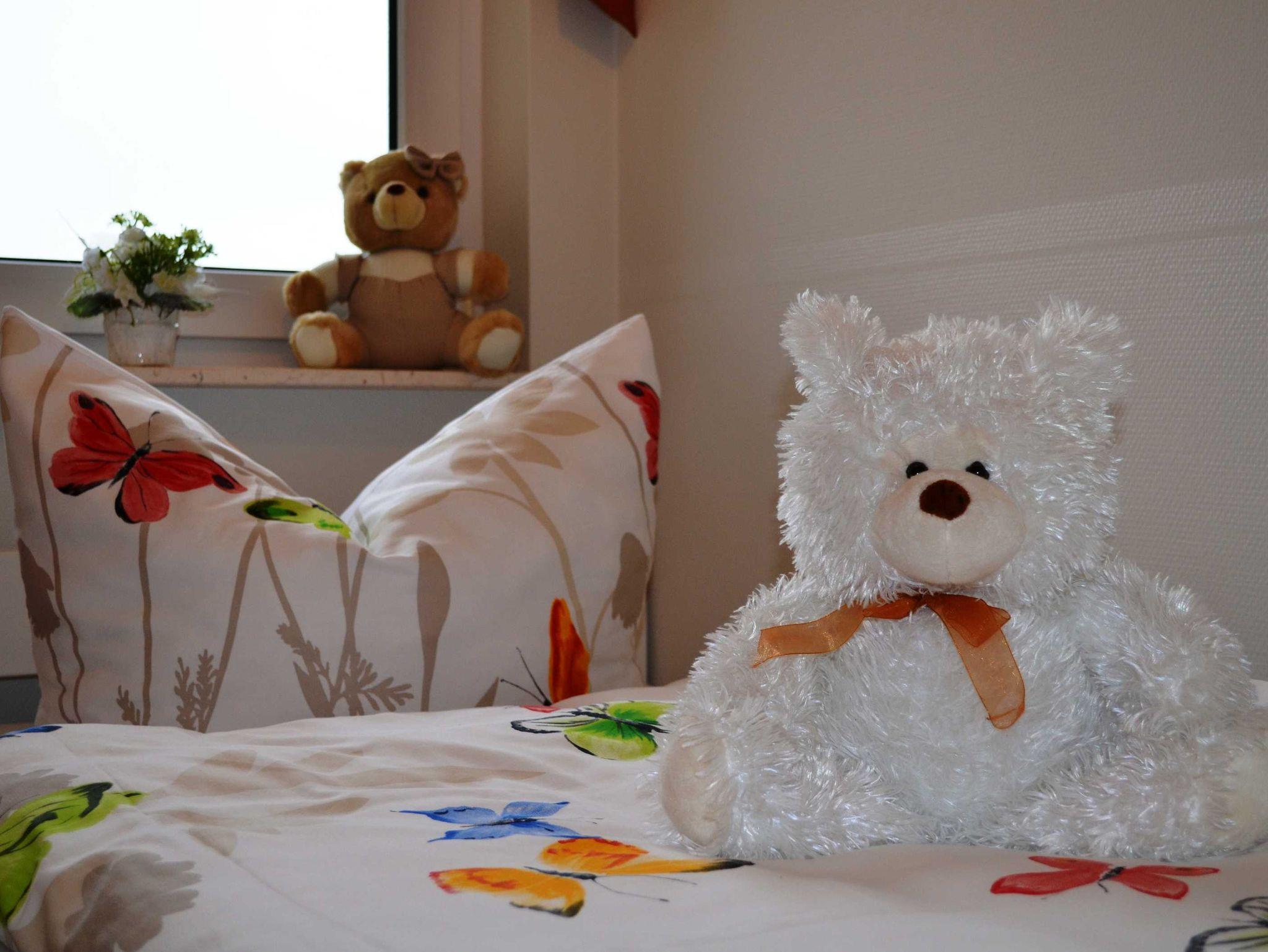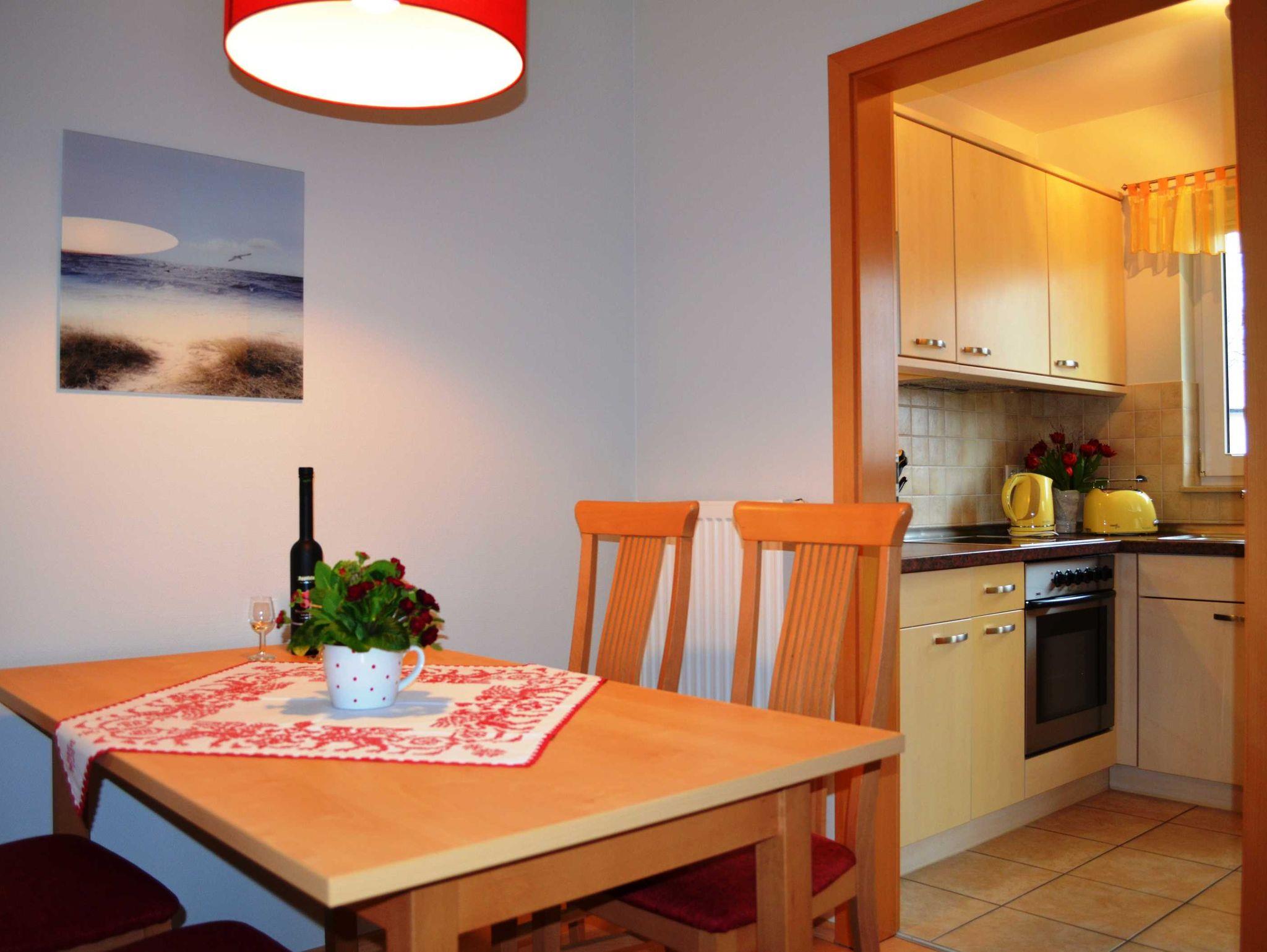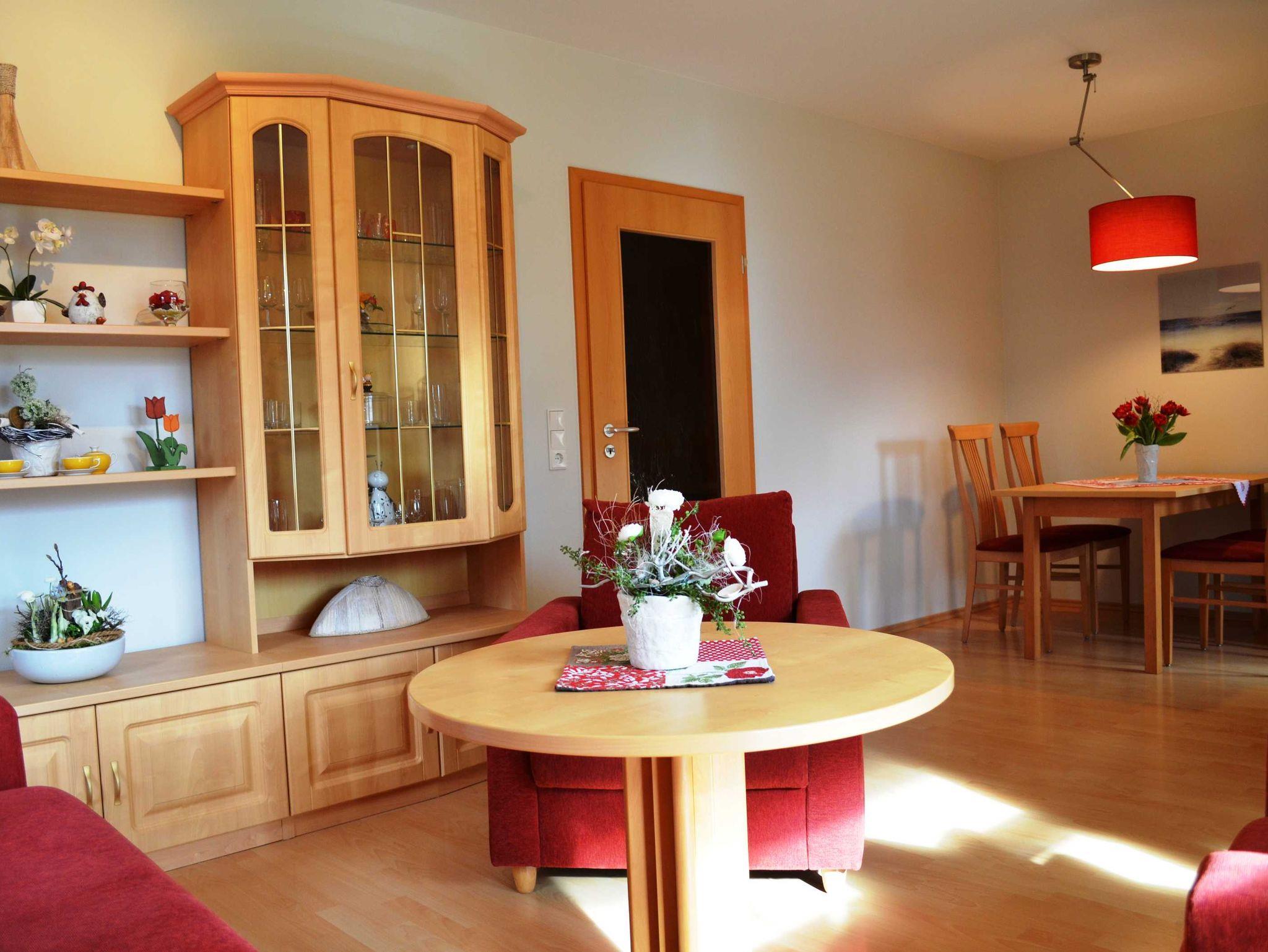 Die in grüner, absolut ruhiger Lage befindliche Ferienwohnung mit Internet via W-Lan (65 m²) im 1.OG besteht aus 3 Zimmern (Schlafzimmer 1 mit Doppelbett, Schlafzimmer 2 mit 1 Einzelbett (1,90m lang und 0,90m breit) und eine Kinderaufbettung ist möglich, einer separaten Küche (Ceranfeld mit Backofen, Mikrowelle, Spülmaschine, Kühlschrank mit Tiefkühlfach, Kaffeemaschine, Wasserkocher, Toaster) und einem Bad (Dusche, WC). Der Zugang zum geräumigen Balkon ist von der Küche, als auch vom Wohnzimmer möglich. Der nach Süd-Westen ausgerichtete Balkon ist mit Balkonmöbeln und Sonnenschirm ausgestattet. Der zugehörige Parkplatz befindet sich direkt am Haus. Fahrräder können unmittelbar am Haus in einem Schuppen abgestellt werden. Die Wohnung ist eine Nichtraucherwohnung.