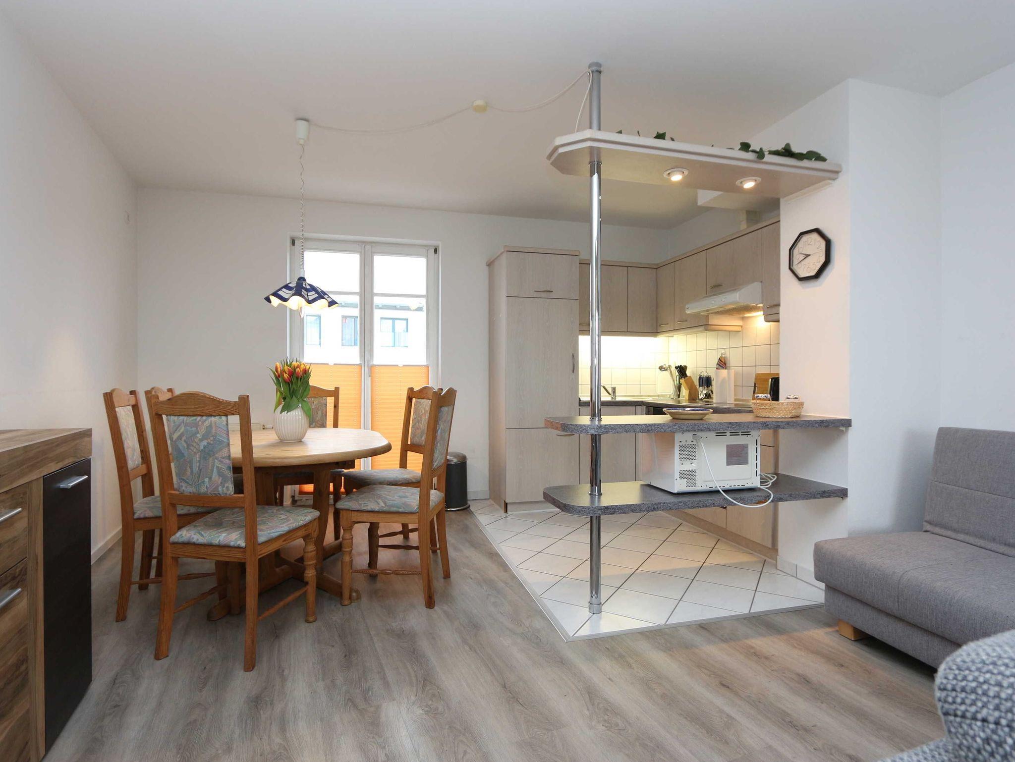 Ferienwohnung (Nr. 36) für bis zu 4 Personen (ca. 55 m²) im 1.OG mit Wohn- und Esszimmer mit offener Küche, 1 Schlafzimmer, 1 Bad und 1 Balkon.