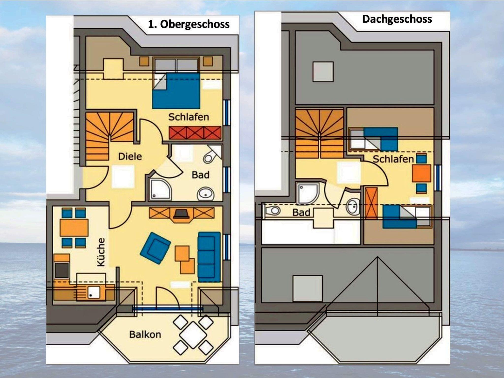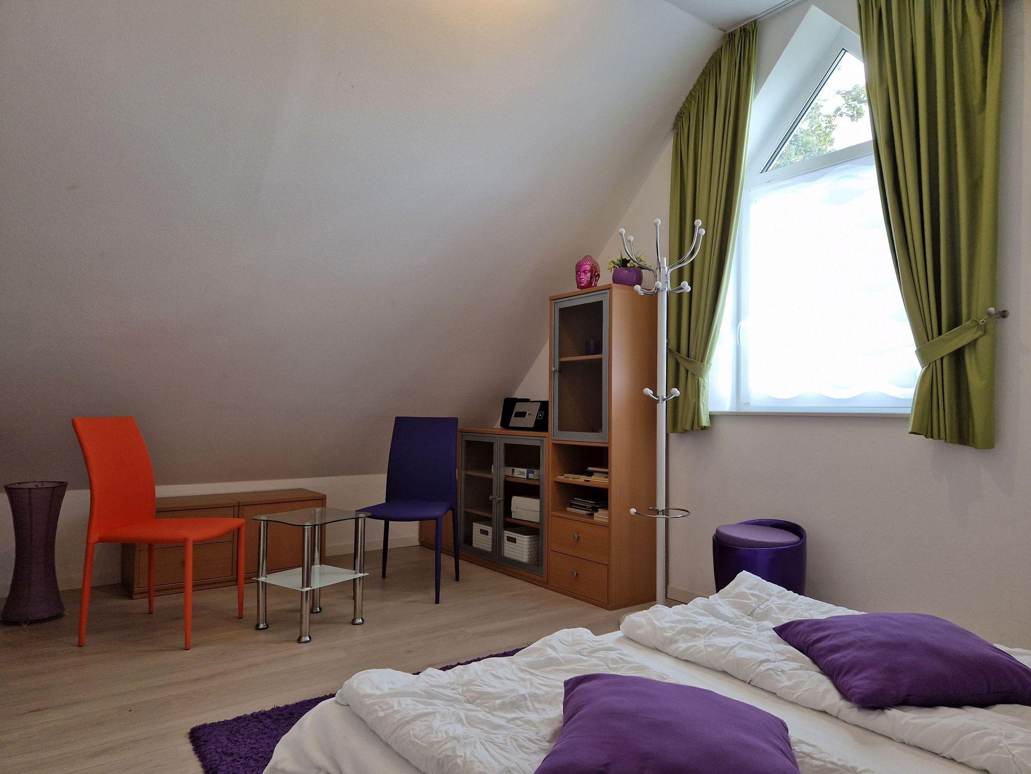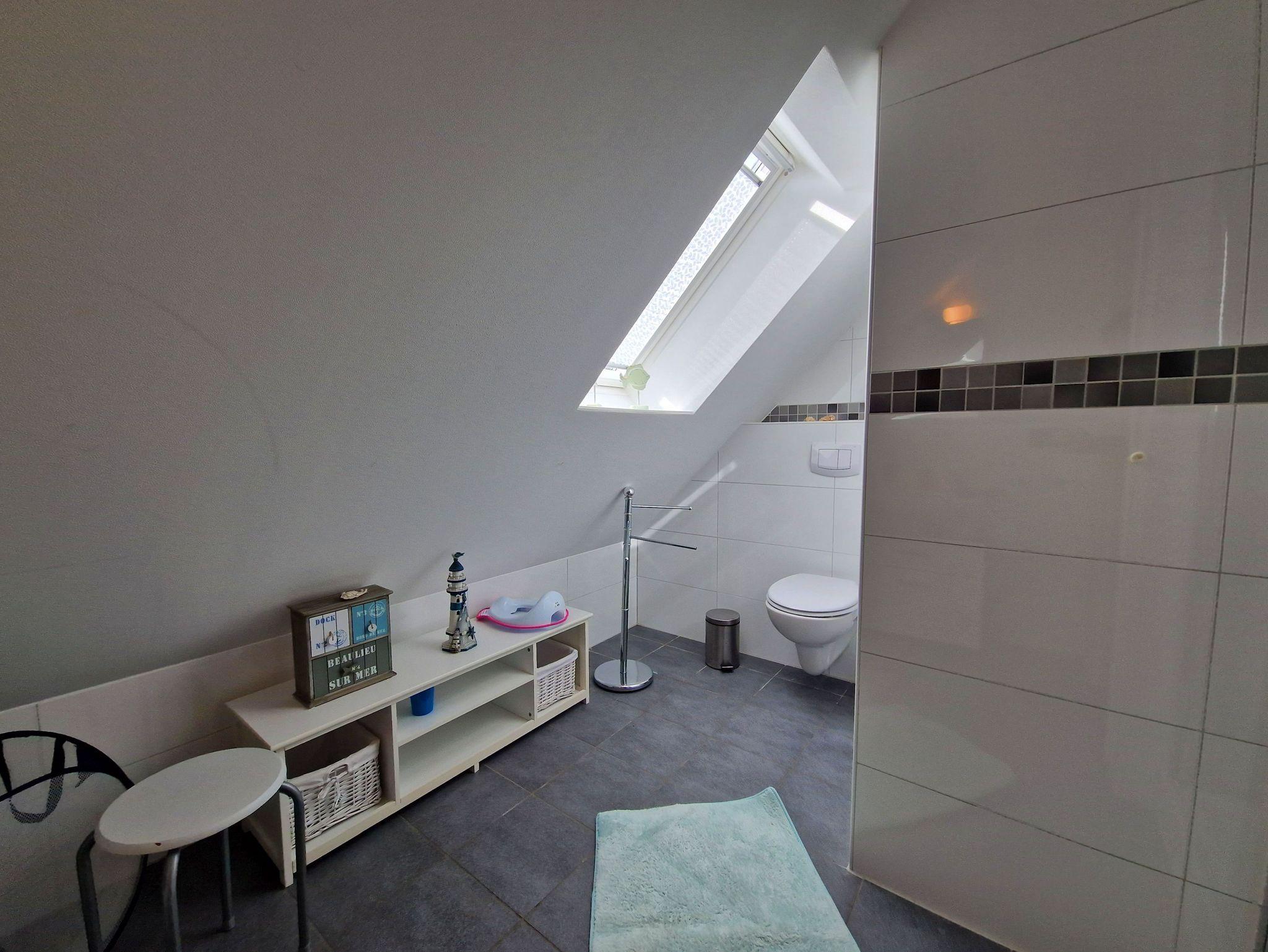 Im Dachgeschoss befindet sich ein zweites Schlafzimmer mit einem 1,60 Meter breiten Doppelbett sowie ein weiteres Badezimmer mit Dusche, WC, Waschbecken. Für kleine Gäste stehen ein Reisebett und Hochstuhl zur Verfügung. Alle Fenster sind mit Plissees verdunkelbar, WLAN ist verfügbar. Ein PKW-Parkplatz sowie ein abschließbarer Fahrradschuppen sind ebenfalls vorhanden.