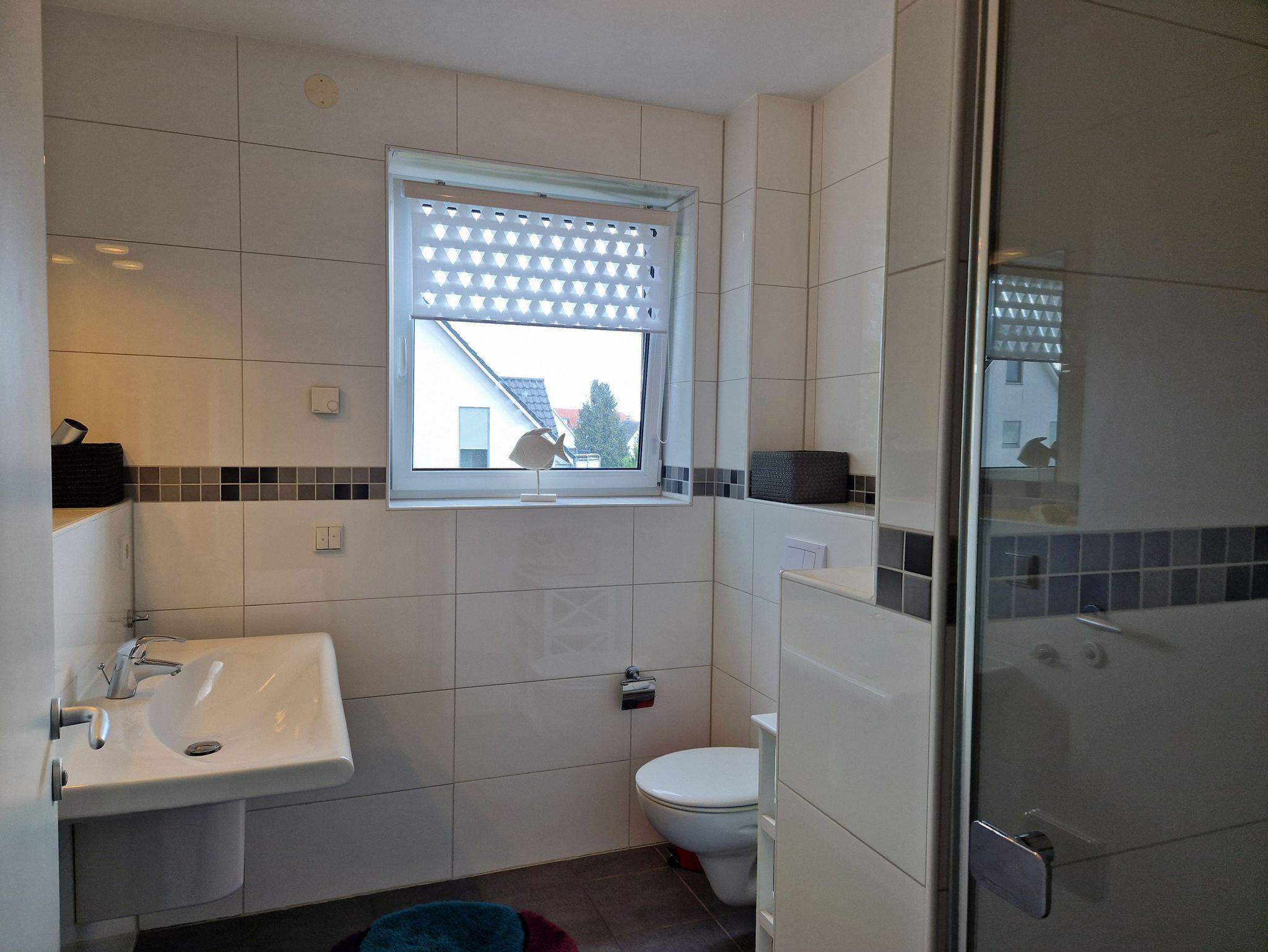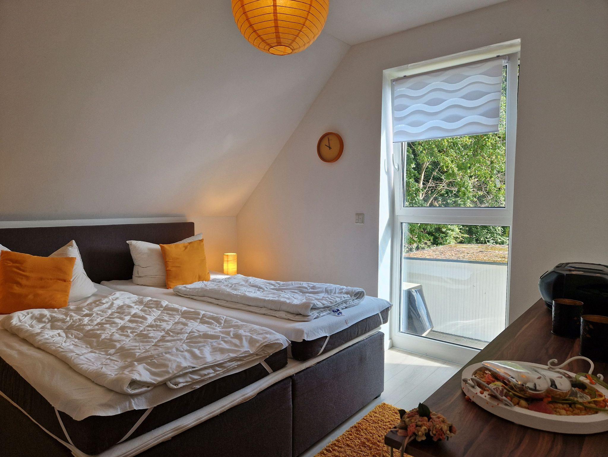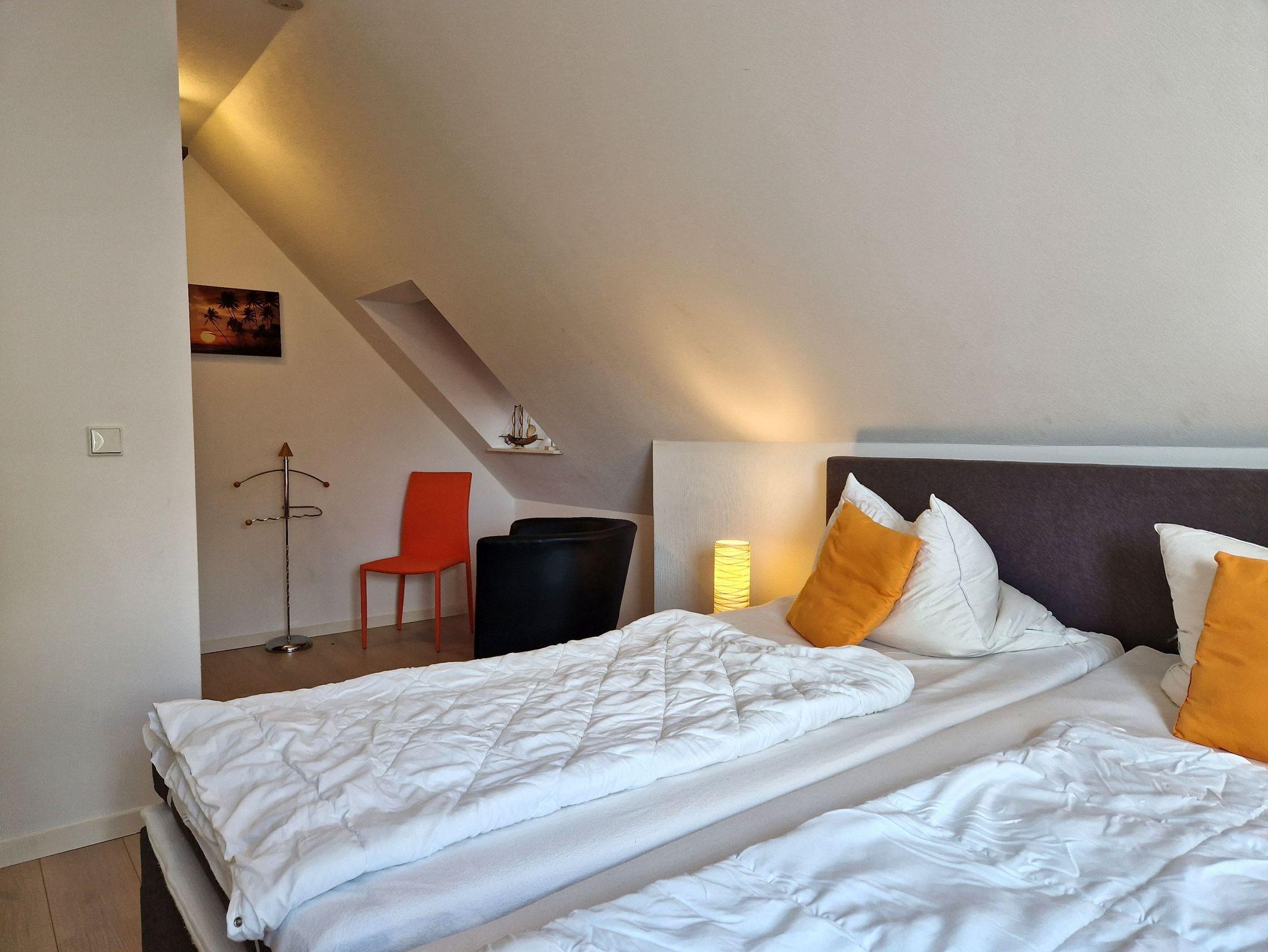 Im Dachgeschoss befindet sich ein zweites Schlafzimmer mit einem 1,60 Meter breiten Doppelbett sowie ein weiteres Badezimmer mit Dusche, WC, Waschbecken. Für kleine Gäste stehen ein Reisebett und Hochstuhl zur Verfügung. Alle Fenster sind mit Plissees verdunkelbar, WLAN ist verfügbar. Ein PKW-Parkplatz sowie ein abschließbarer Fahrradschuppen sind ebenfalls vorhanden.