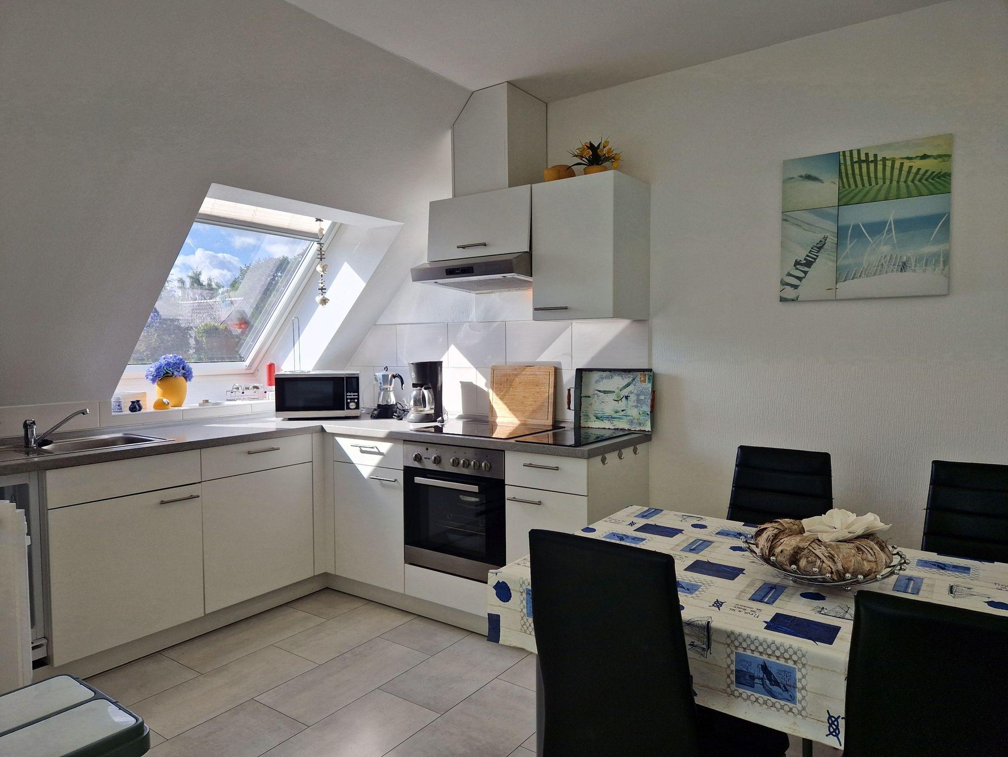 Im ersten Obergeschoß finden Sie das großzügige Wohn- und Esszimmer mit offener Küche und Zugang zum nach Süden ausgerichteten Balkon. Die Einbauküche ist komplett ausgestattet mit Ofen, Herd, Spülmaschine, Kaffeemaschine, Mikrowelle, Toaster, Wasserkocher etc. Auf dem Balkon können Sie zu jeder Tageszeit das herrliche Ostseewetter genießen.