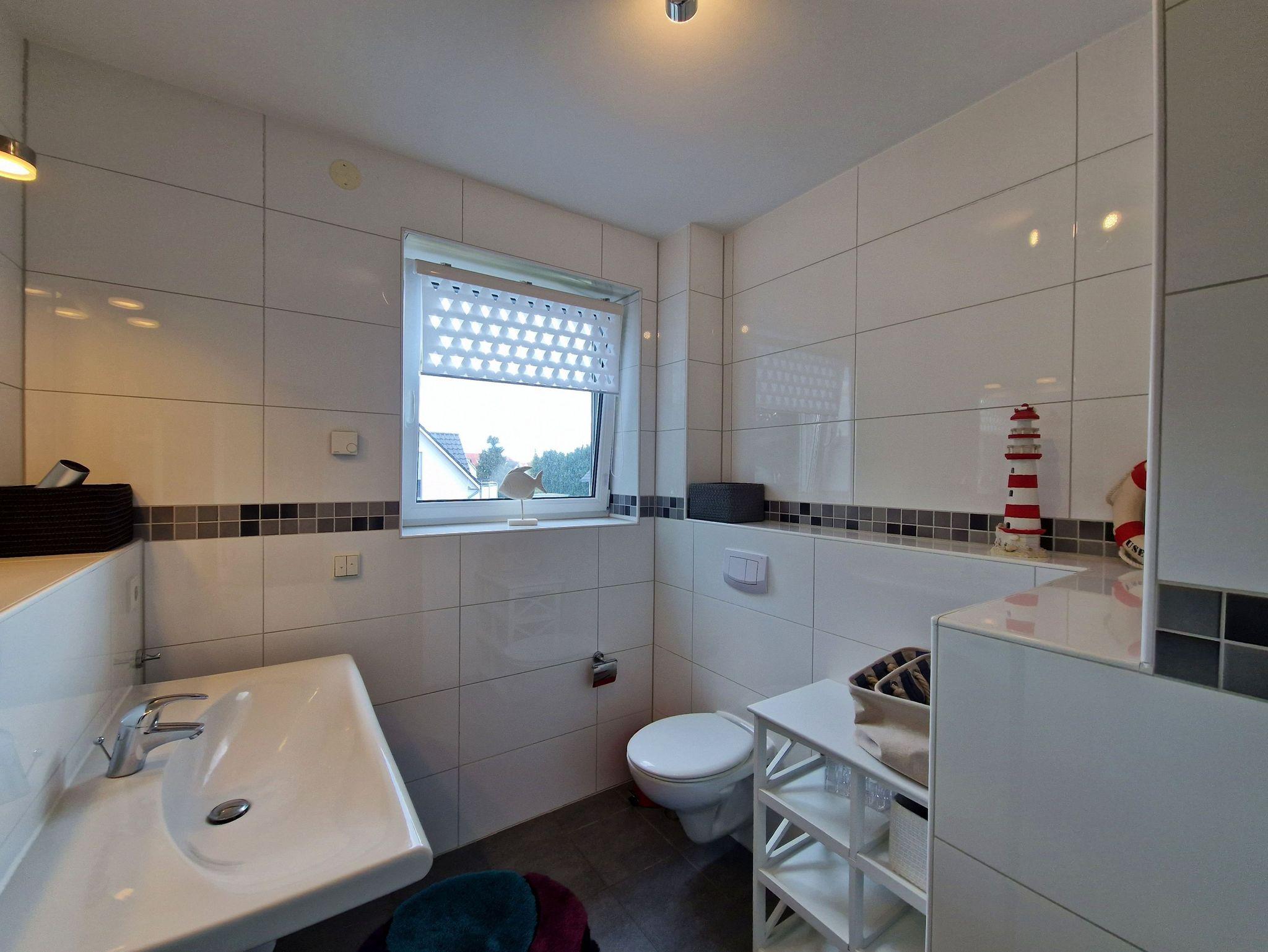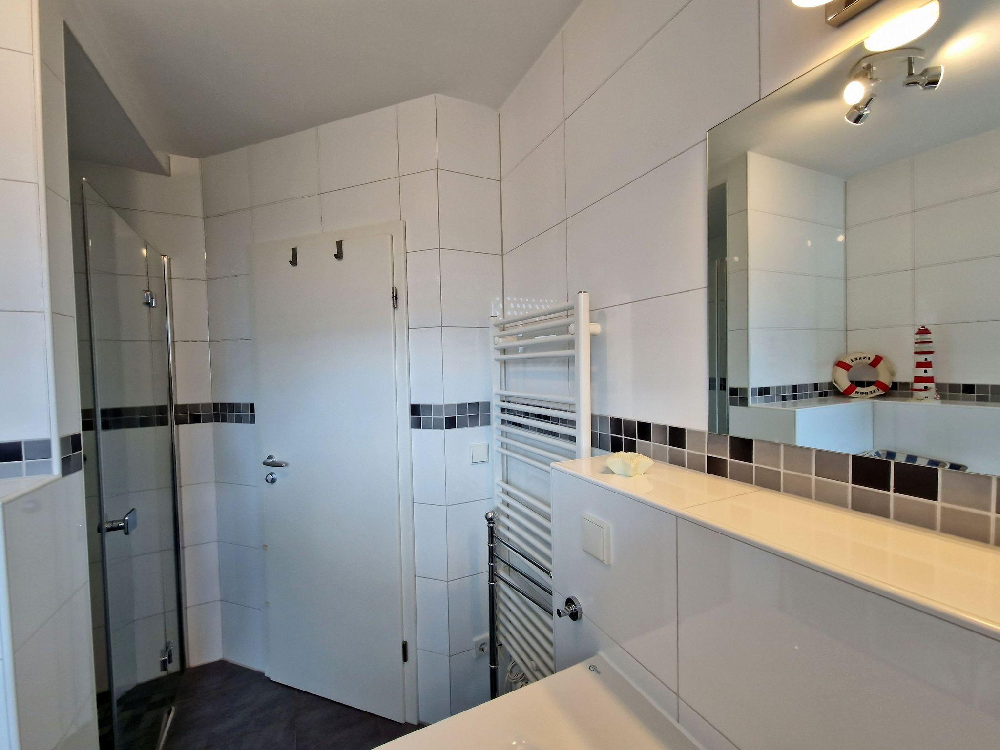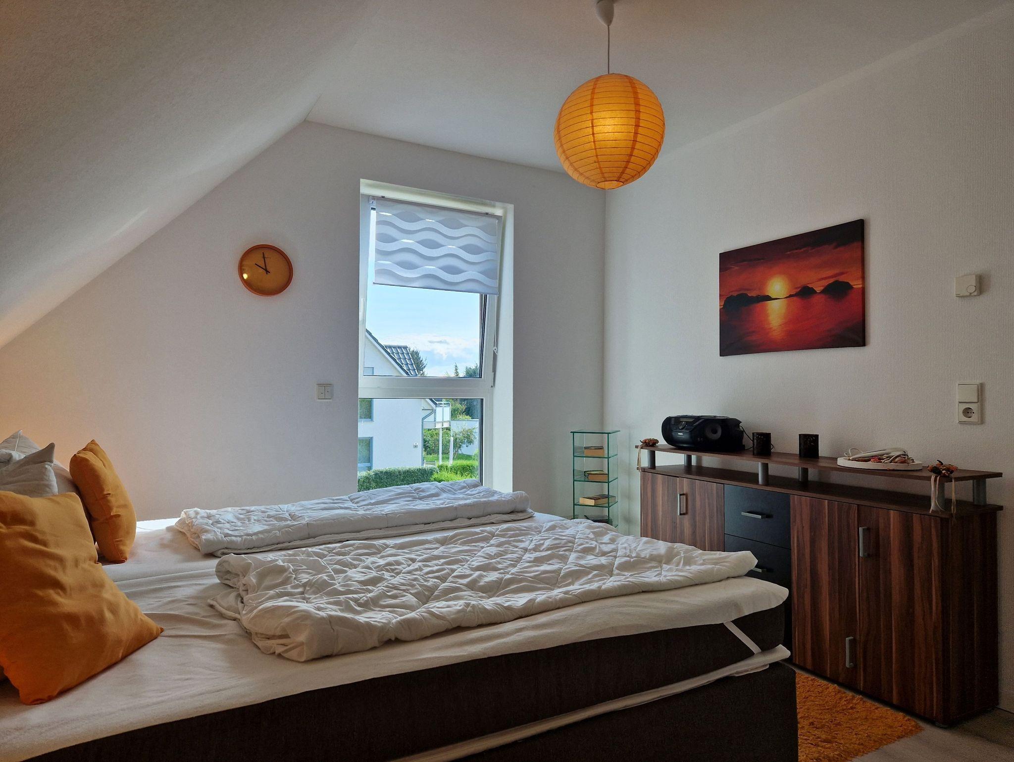 Die Ferienwohnung Ostseedüne 4 überzeugt mit ihrer hellen, farbenfrohen Einrichtung und bietet Platz für 4 Personen und ein Baby. Sie erstreckt sich über das OG und DG. Das freundliche Schlafzimmer verfügt über ein 2 Meter breites Doppelbett, Kleiderschrank und Sideboard. Das Badezimmer ist mit einer ebenerdigen Dusche, WC und Waschbecken ausgestattet und bietet dank Handtuchheizer und Fußbodenheizung immer trockene Handtücher.