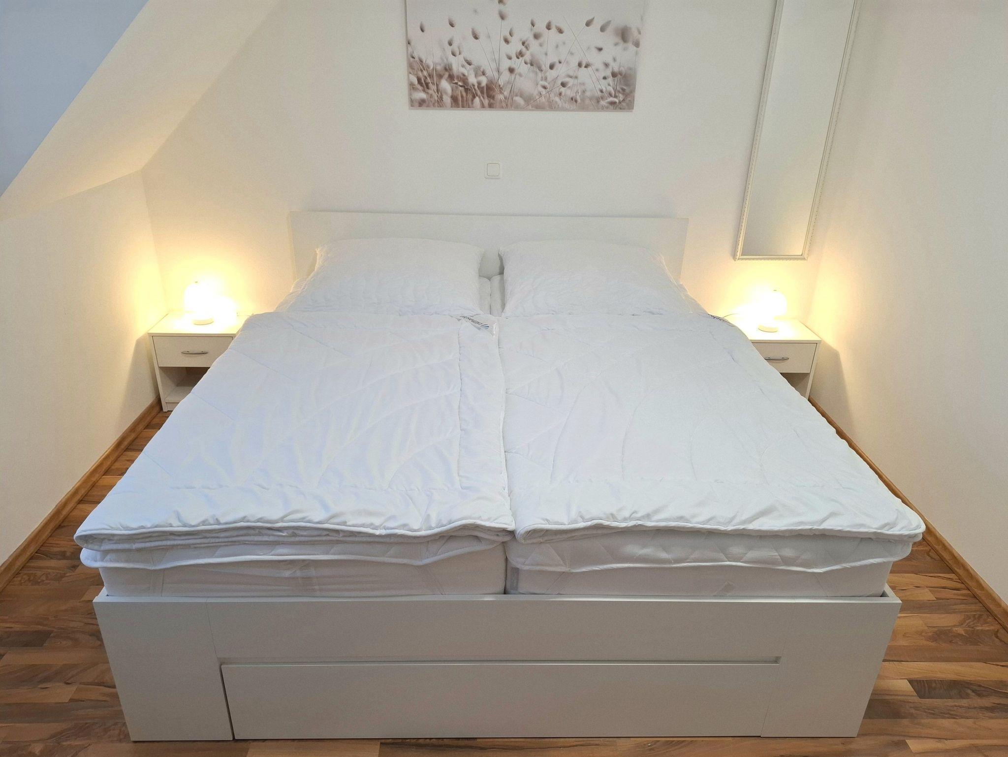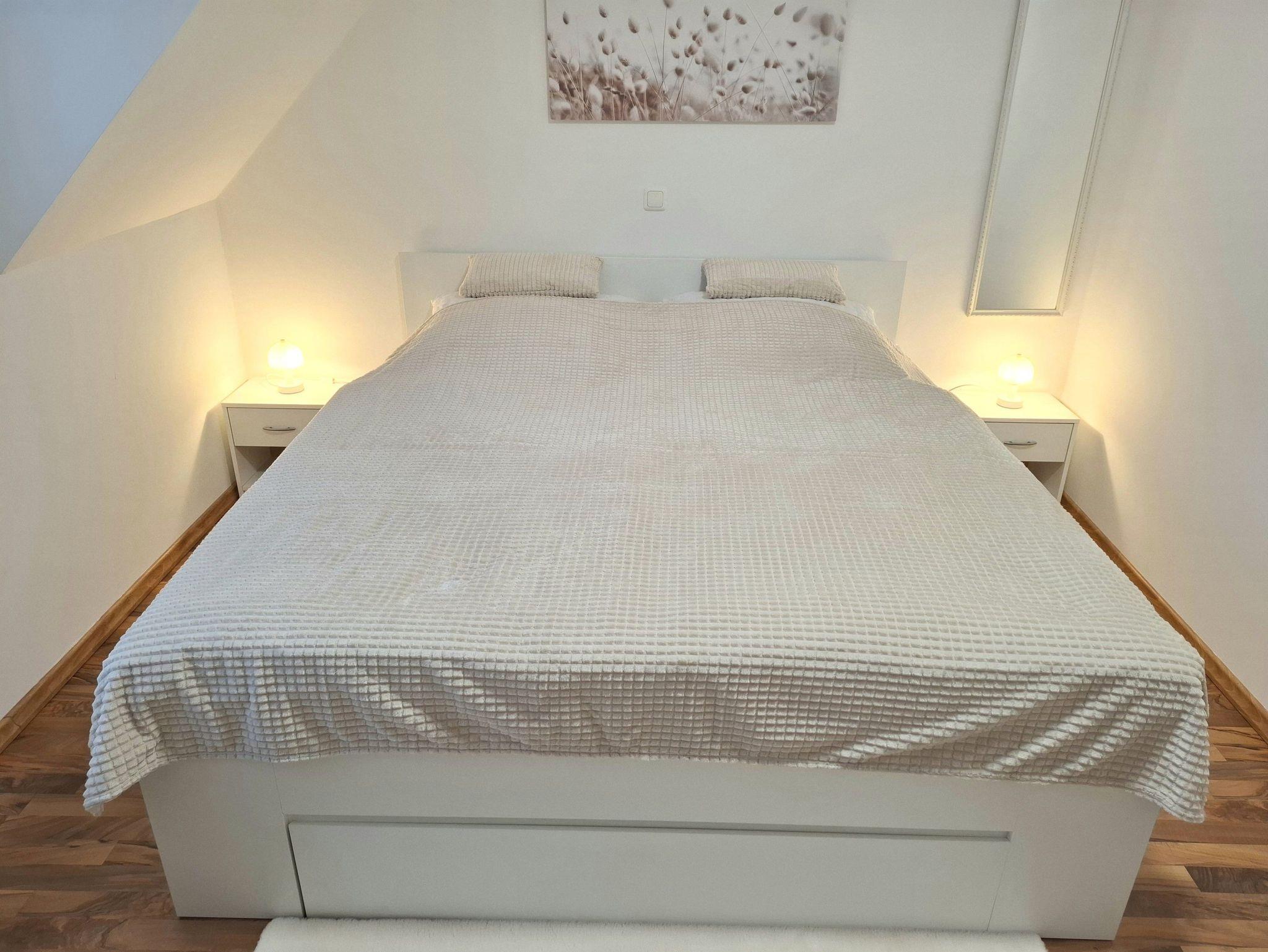 Das separate Schlafzimmer verfügt über ein Doppelbett (1,80x2,00m), mit neuen, höheren Matratzen, für ein leichteres Hinlegen und komfortableres Aufstehen (Härtegrad 3), einen Kleiderschrank für Ihre Urlaubsgarderobe und einen zweiten SAT-TV mit DVD-Player.