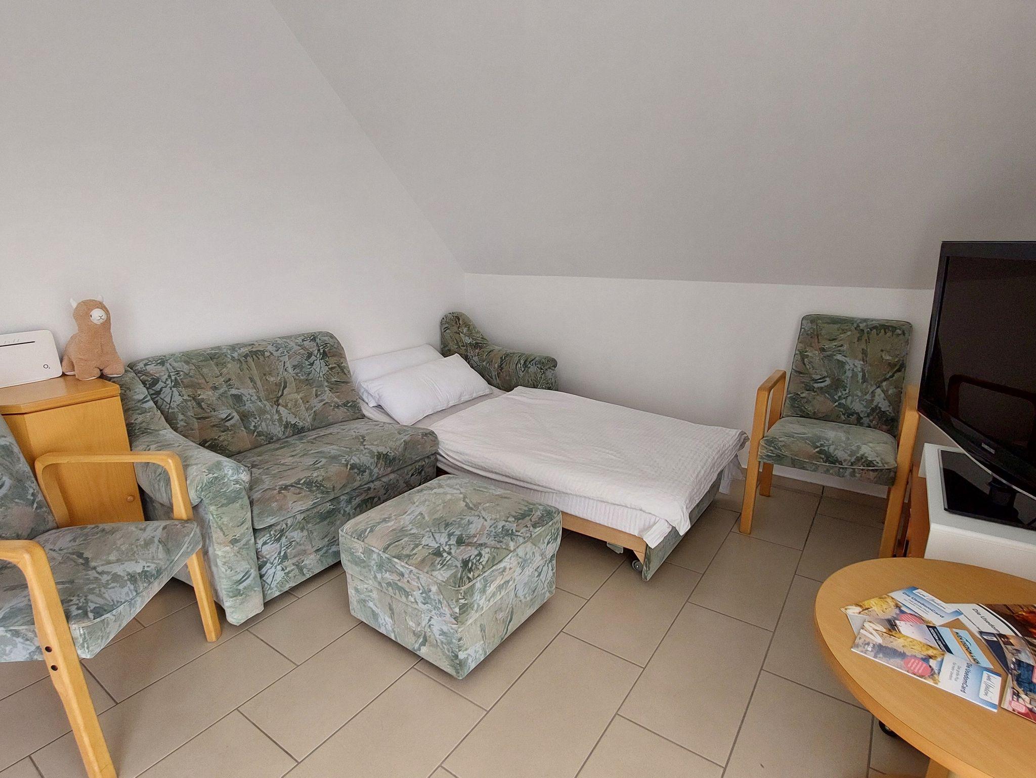 Die gemütliche 2-Raum-Ferienwohnung mit Balkon und ist 52qm groß. Der großzügige Wohnbereich erwartet Sie mit einem Esstisch, Flat-TV sowie einem großen Sofa (Aufbettungsmöglichkeit für 2 Personen/Liegefläche 1,80x2,00m), welches durch extra Matratzenauflage besonderen Schlafkomfort bietet.