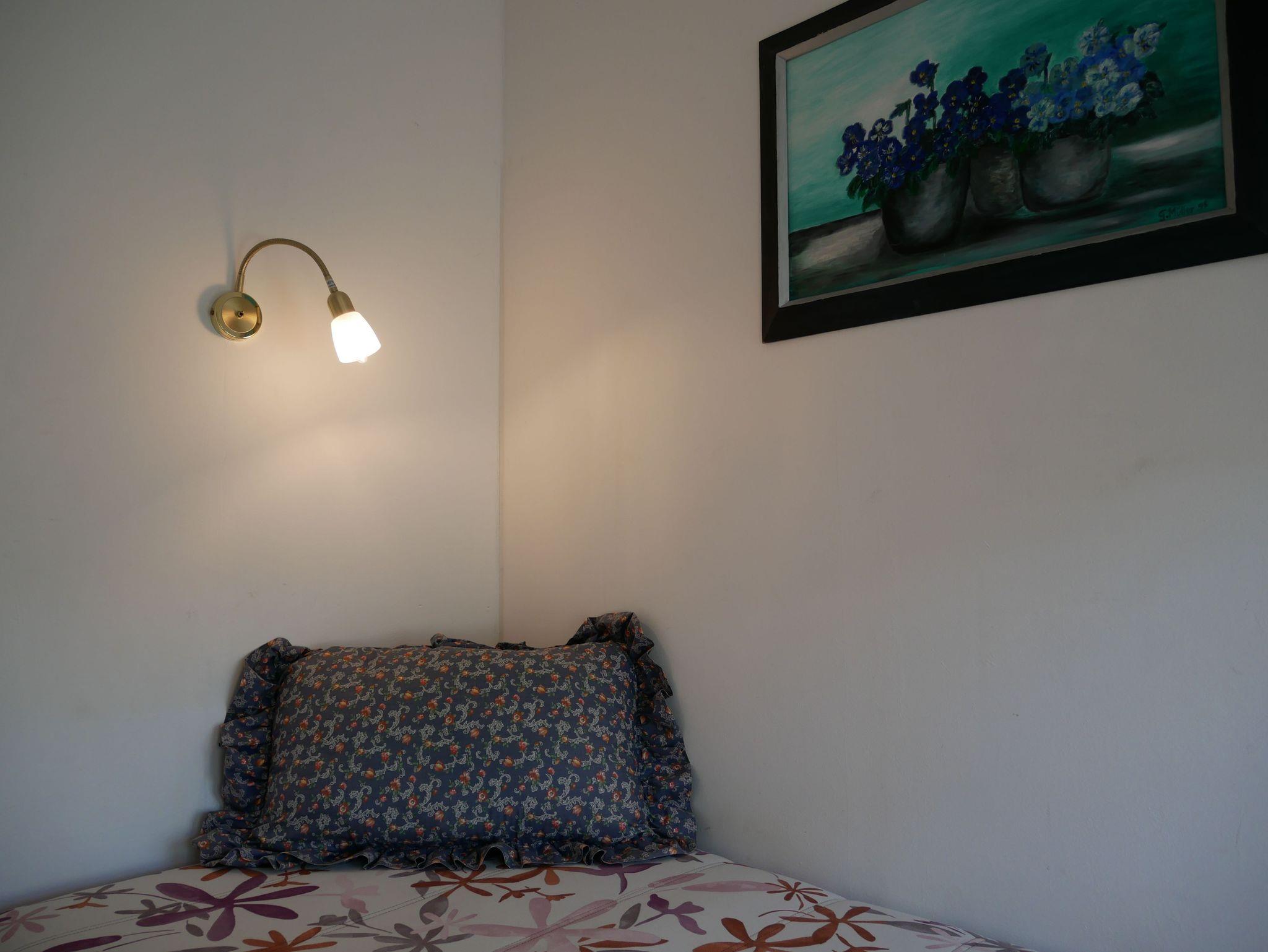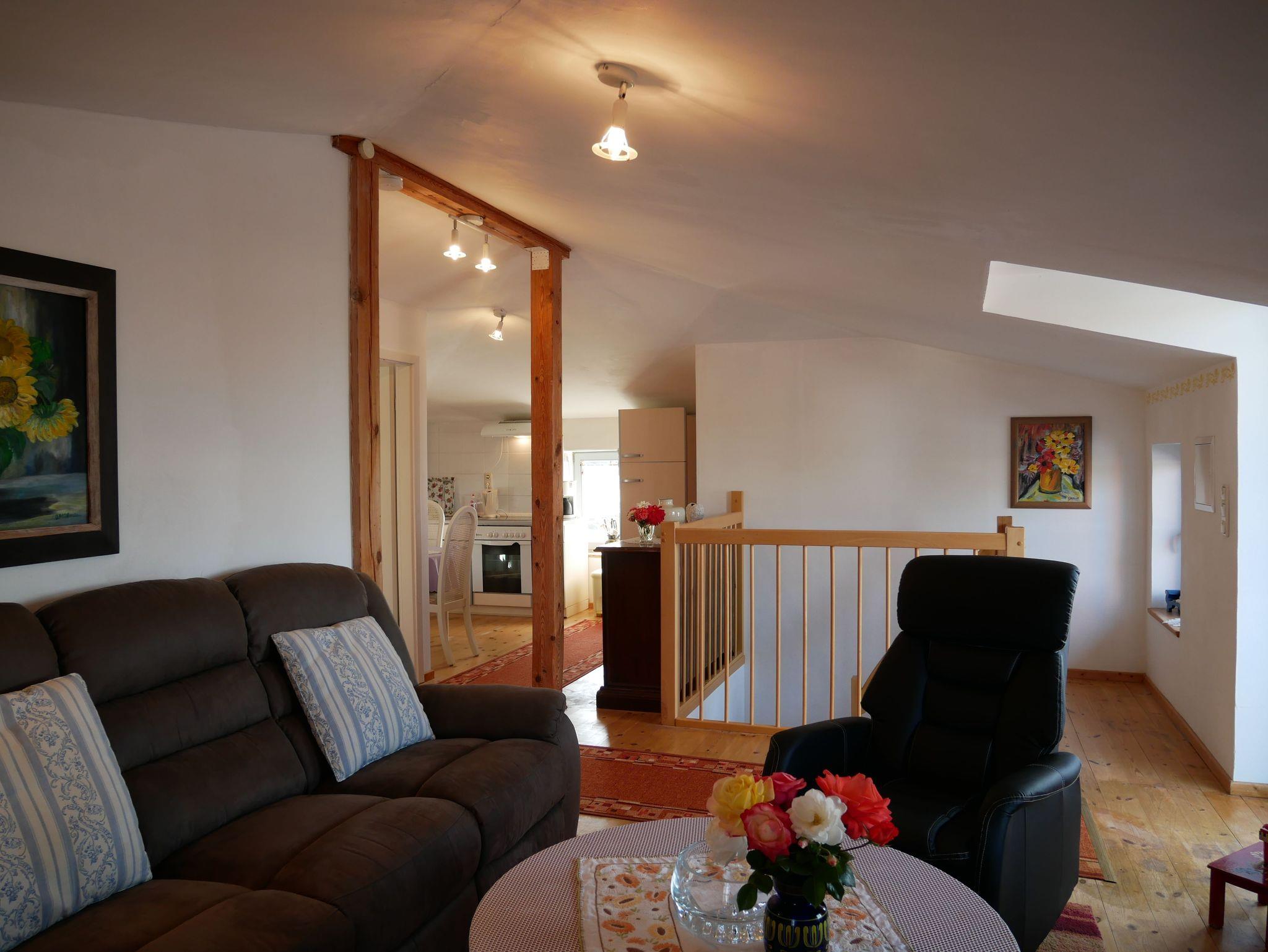 Die Ferienwohnung liegt im Dachgeschoss (2.OG) und ist für bis zu 3 Personen gut geeignet. Sie teilt sich auf in einen Wohnraum mit Küche, zwei abgeteilten Schlafräumen mit Doppel- bzw. Einzelbett und Kleiderschrank, sowie einem Bad mit Dusche und WC. Die Küche ist mit einem Elektroherd mit Ceranfeld, Kaffeemaschine, Wasserkocher, Toaster, Kühlschrank und Geschirrspüler ausgestattet.