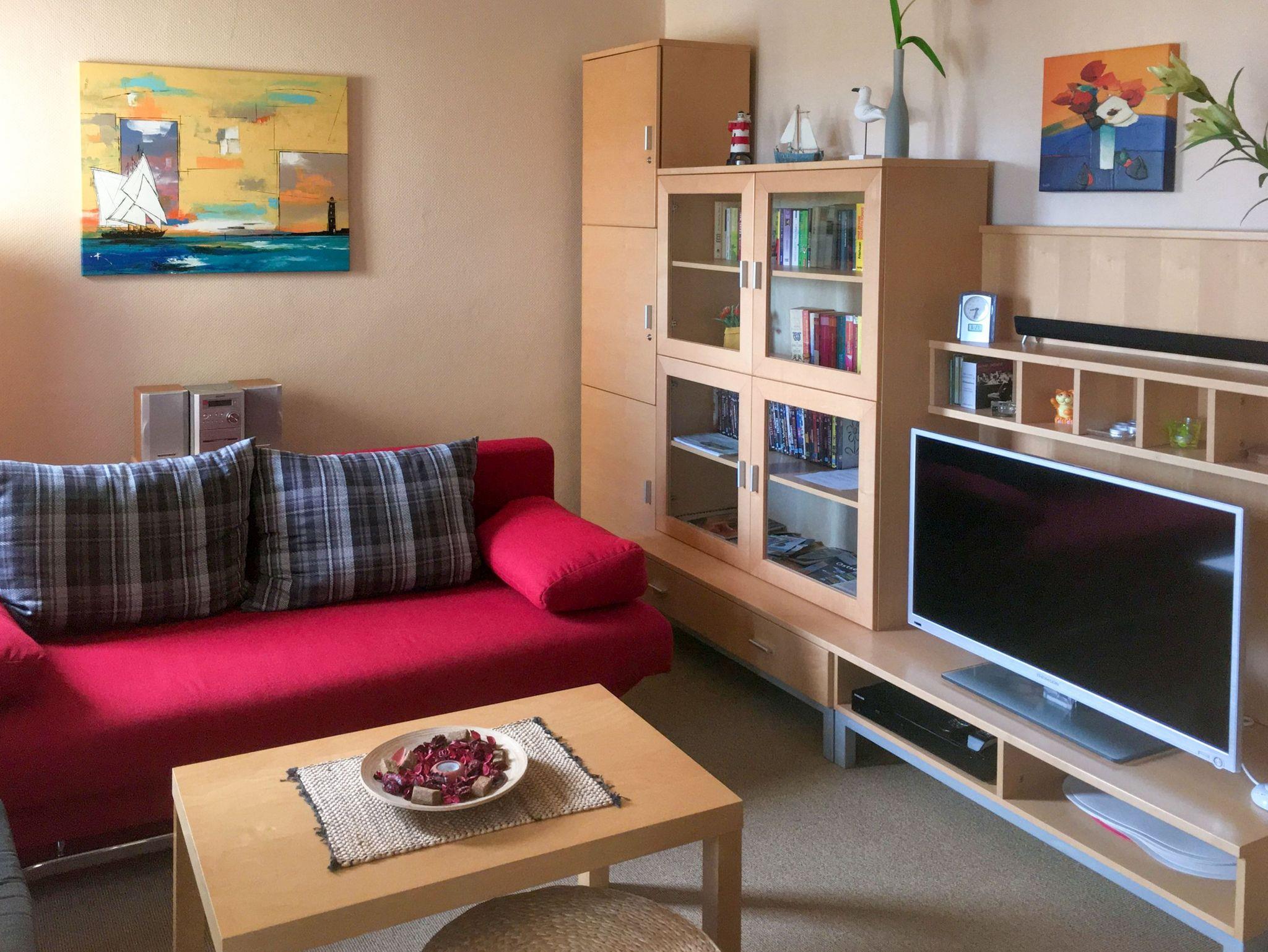 Über eine Treppe im Haupthaus gelangen Sie zur gemütlichen 53m² Ferienwohnung im Obergeschoss. Der einladende Wohnbereich erwartet Sie mit einer bequemen Couch, die bei Bedarf zur Schlafcouch umfunktioniert werden kann, einem Flat-TV und einer kleinen Bibliothek mit einem Plattenspieler sowie dem erwähnten Klavier. Am Esstisch finden vier Personen bequem Platz, um gemeinsam zu essen oder einfach die Zeit miteinander zu genießen.