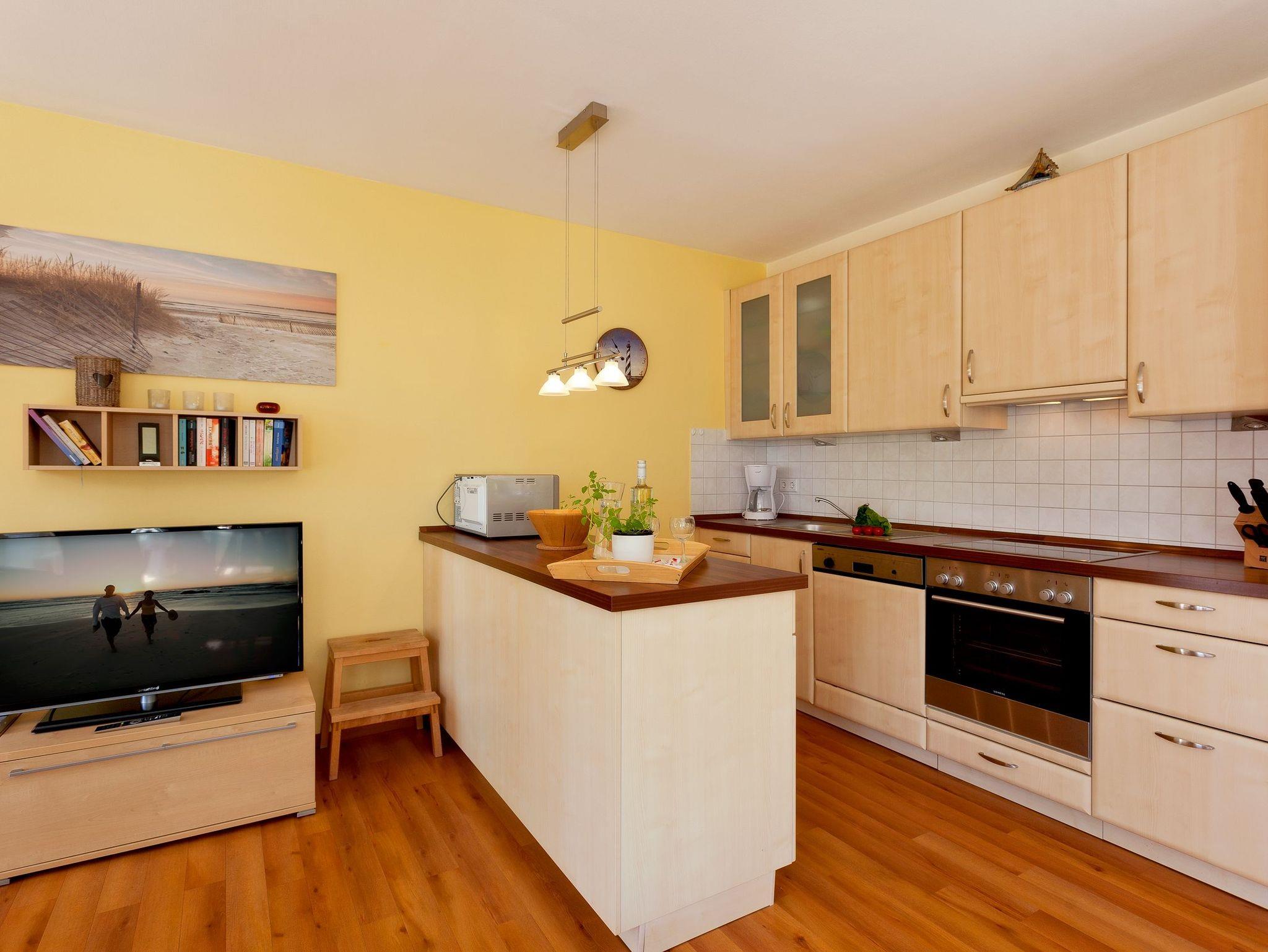 Vom Wohnzimmer, mit separater Essecke, Sofa und gemütlichen Sitzmöbeln schauen Sie auf die Sonnenterrasse und können den Blick über den Ort schweifen lassen. Dort befinden sich ebenfalls ein Fernseher, ein CD-Player und eine Stereoanlage. Das Schlafzimmer ist mit einem gemütlichen Doppelbett ausgestattet. Im Kinderzimmer finden Sie ein Etagenbett vor. Die voll ausgestattete Küche, mit Umluftherd, Kühlschrank mit Eisfach, Geschirrspüler, Ceranfeld, Mikrowelle und den notwendigen Utensilien bietet alles um sich wie zu Hause zu fühlen. Das Bad finden eine Dusche, ein Marmor Waschtisch, ein Handtuchwärmer und eine Fußbodenheizung ihren Platz. Selbstverständlich sind alle Fenster mit Rollladen versehen und an einigen Fenstern sind Fliegengitter angebracht um die Plagegeister draußen zu halten. Auf dem 15 m² Sonnendeck finden Sie eine Sitzgruppe mit Sonnenschirm durch welche Sie das schöne Wetter auch direkt an ihrer Wohnung nutzen können. Ein PKW-Stellplatz stellen wir Ihnen natürlich zur Verfügung. Waschmaschine und Trockner können Sie gegen Entgelt verwenden.
