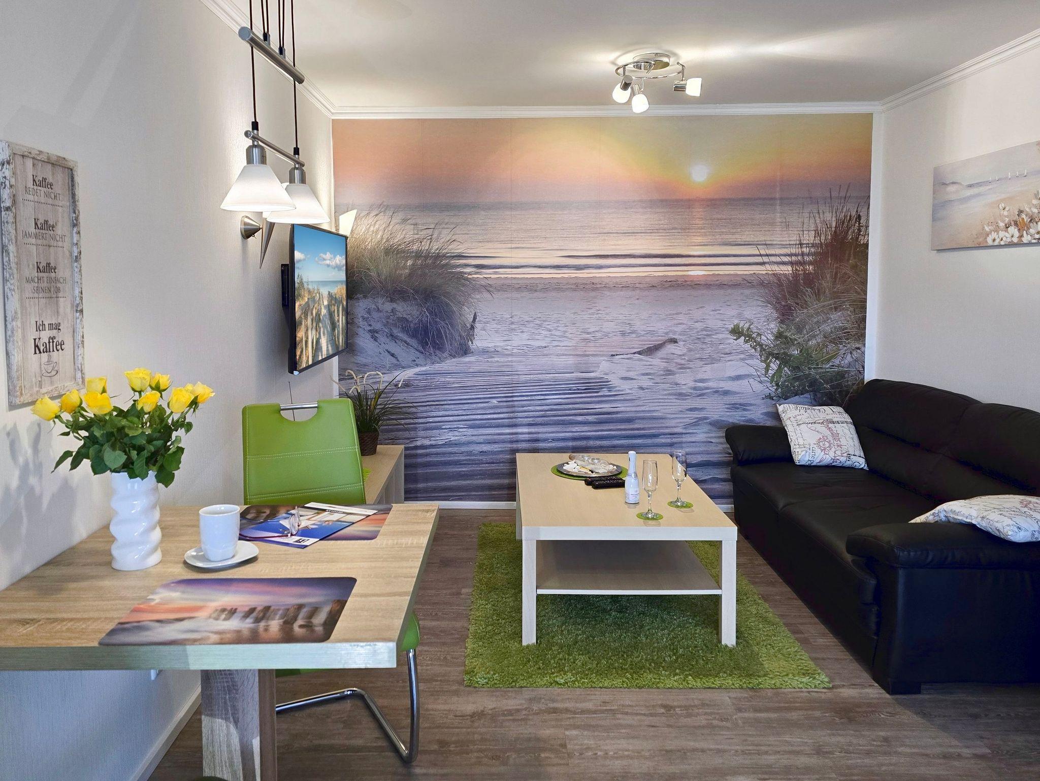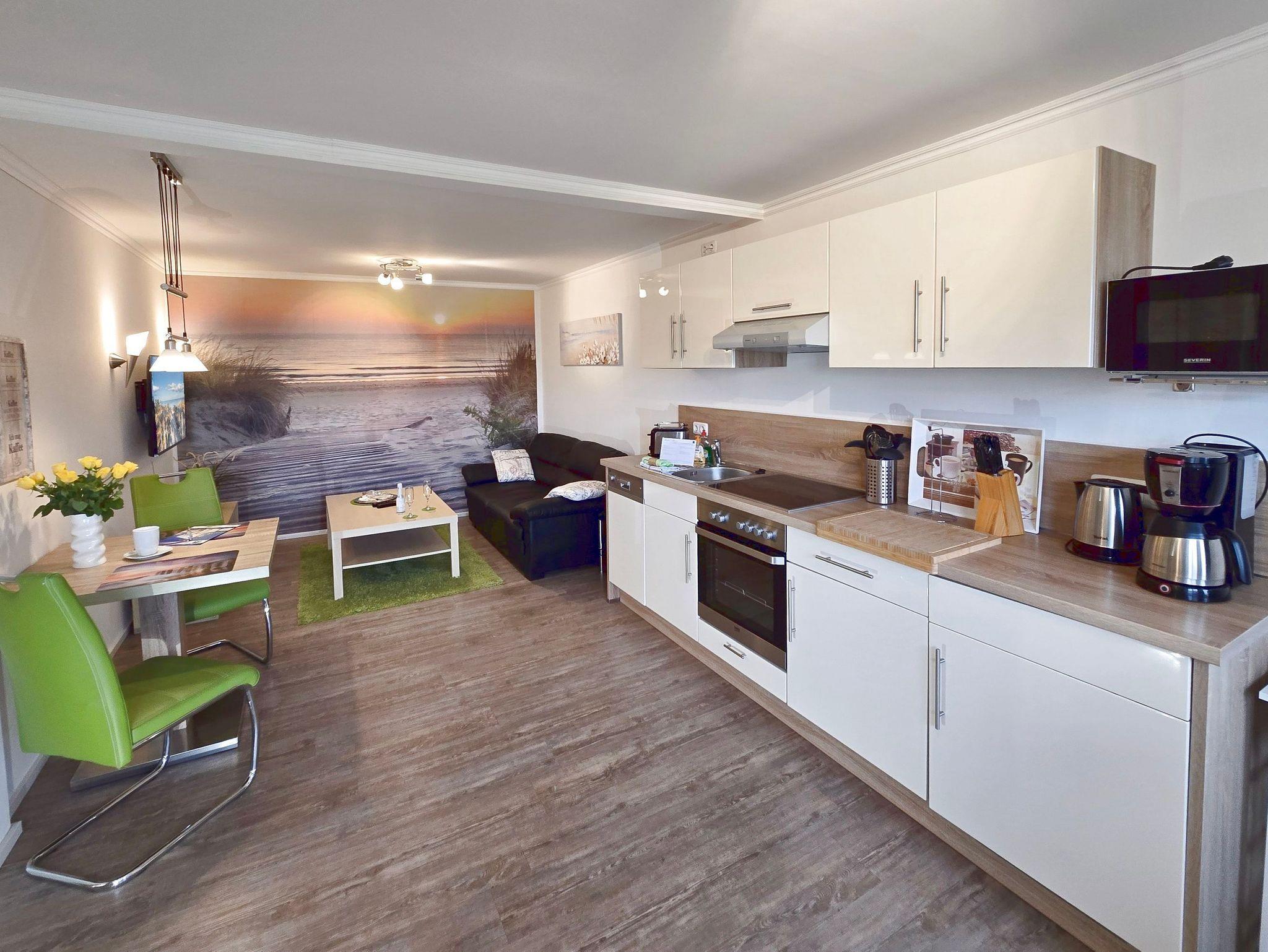 Verbringen Sie Ihren Urlaub zu zweit und der Möglichkeit der Aufbettung im Babybettchen für ein Kleinkind im Alter von bis zu drei Jahren im Herzen des Ostseebades Zinnowitz. Der helle Wohn-Koch-und Essbereich ist in warmen Tönen gehalten. Die integrierte Küchenzeile bietet jeglichen Komfort dank Backofen mit Ceranfeld, Kühlschrank mit Gefrierfach, Geschirrspüler, Mikrowelle, Wasserkocher, Toaster, Kaffeemaschine u.v.m.