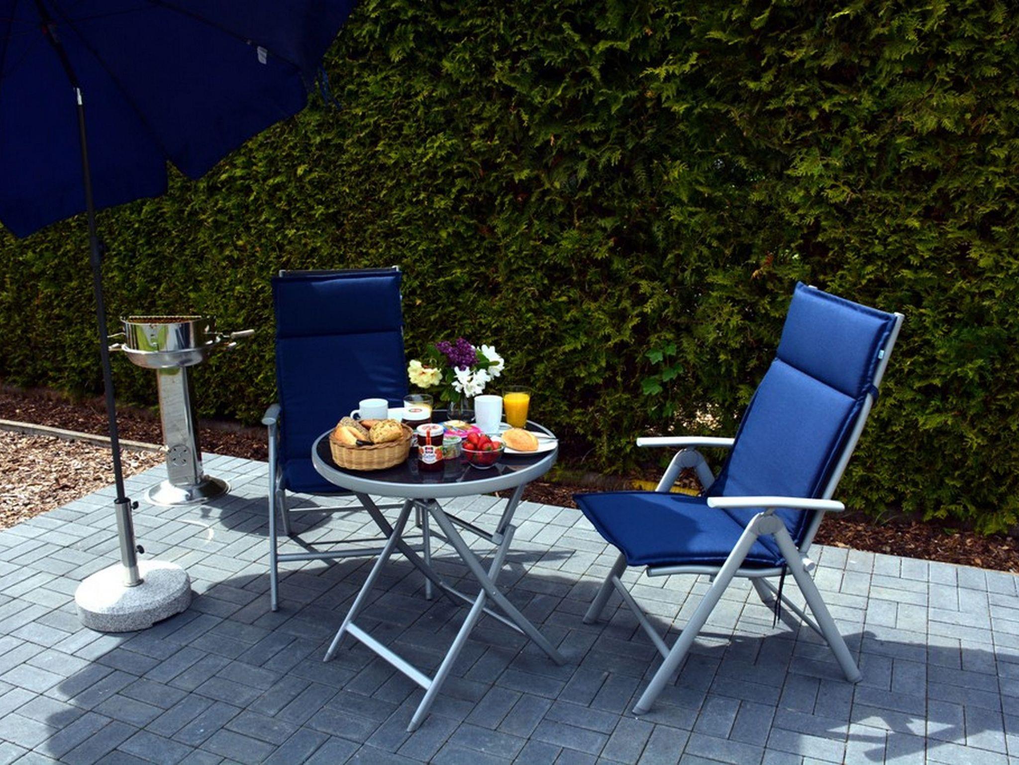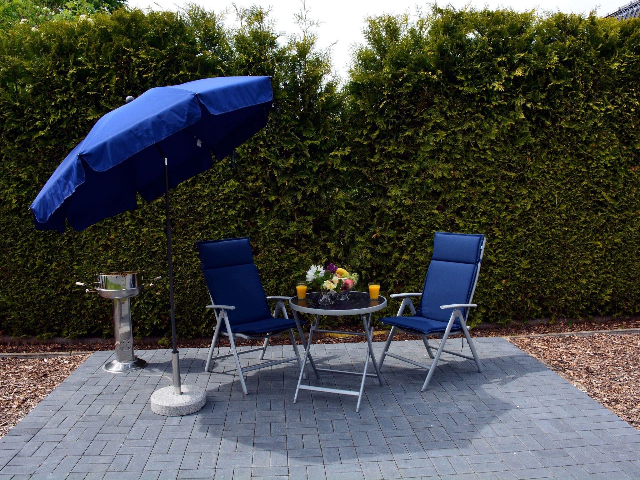 Ein bequemes Sofa, FlatTV und ein Bluray Player sowie ein Esstisch für zwei Personen runden den Urlaubskomfort dieses Appartements ab. Auf dem Grundstück lädt eine gemütliche Sitzecke mit Südwestausrichtung im Grünen mit eigenem Grill zum Ausklingen des erlebnisreichen Urlaubstages bei einem sommerlichen Abendbrot ein.