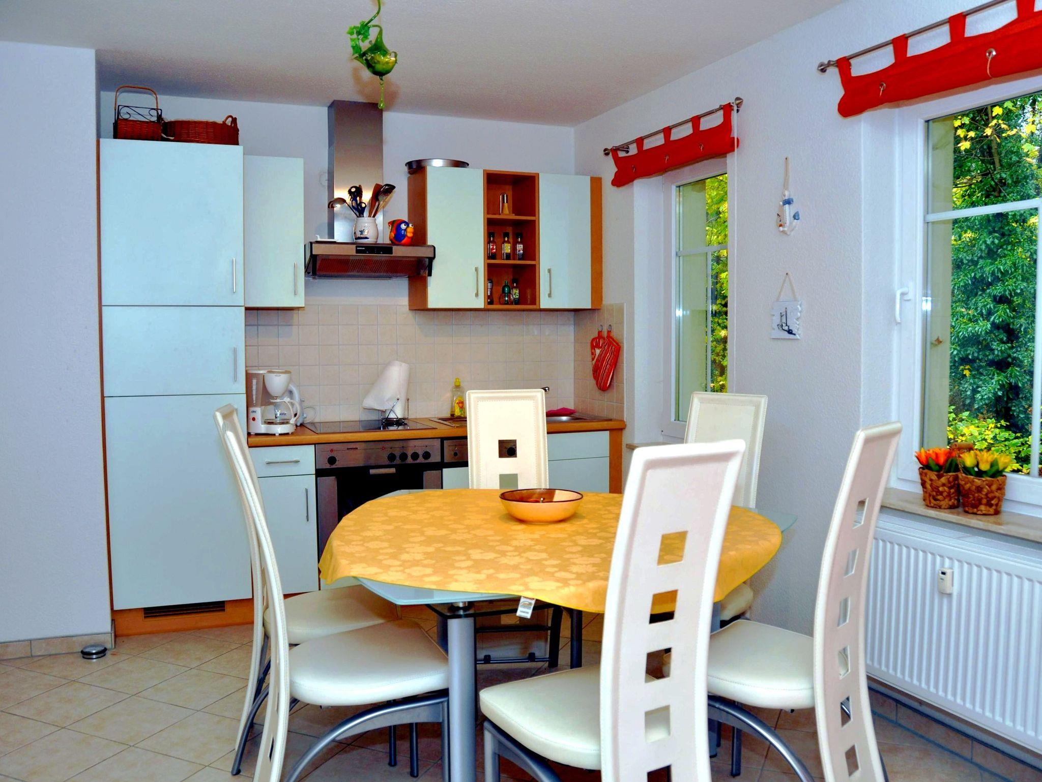 Im Wohnzimmer finden Sie eine gemütliche Sitzecke (umwandelbar zum Bett für 1 Erwachsenen oder 2 Kinder bis ca. 14 Jahre), TV und Radio sowie eine offene Küche mit Essplatz für 6 Personen. Die Küchenzeile bietet alles für den Urlaub: Geschirrspüler, Kühlschrank mit Gefrierfach, Ceranherd mit Backofen, Kaffeemaschine, Toaster und mehr.