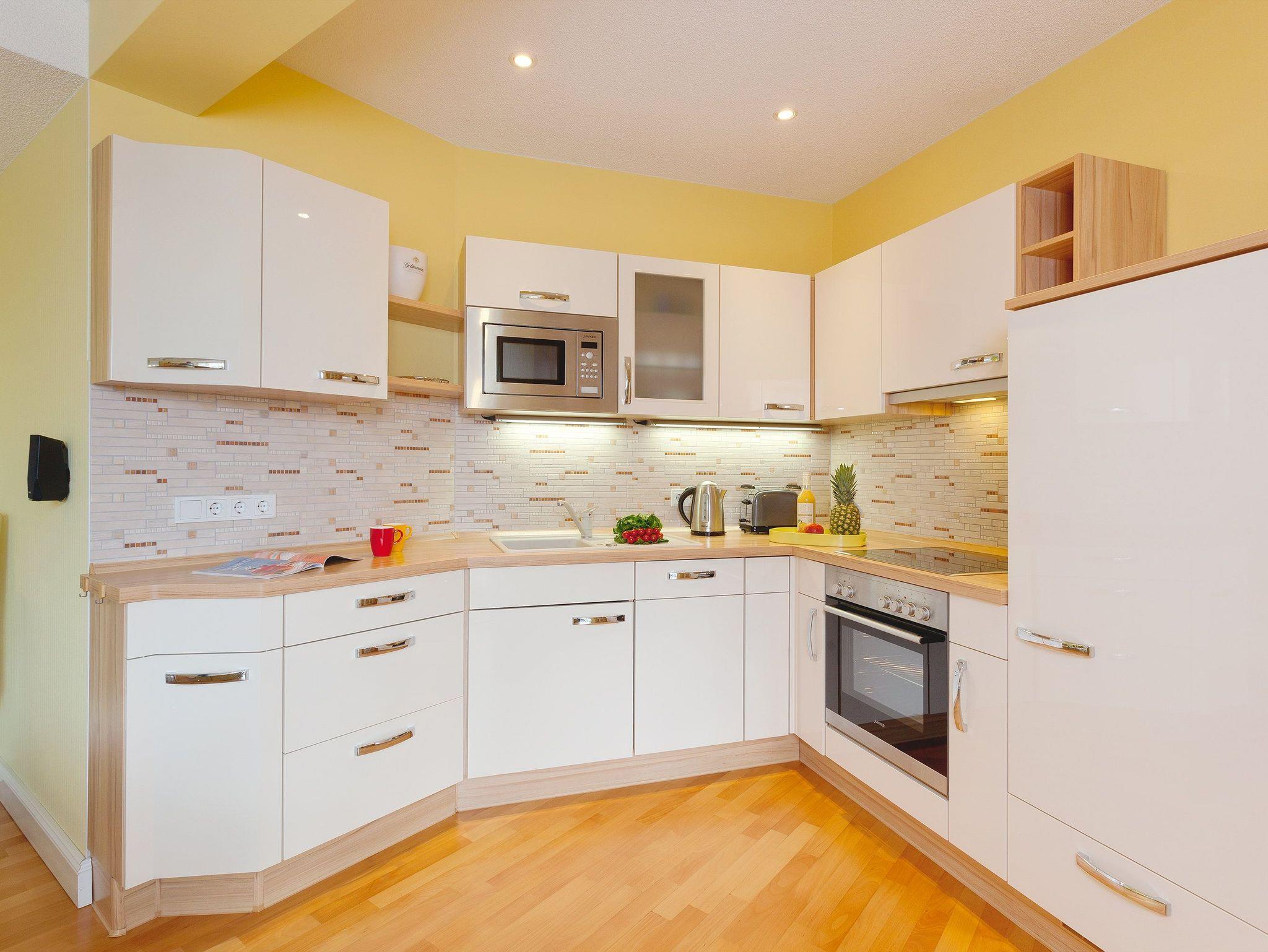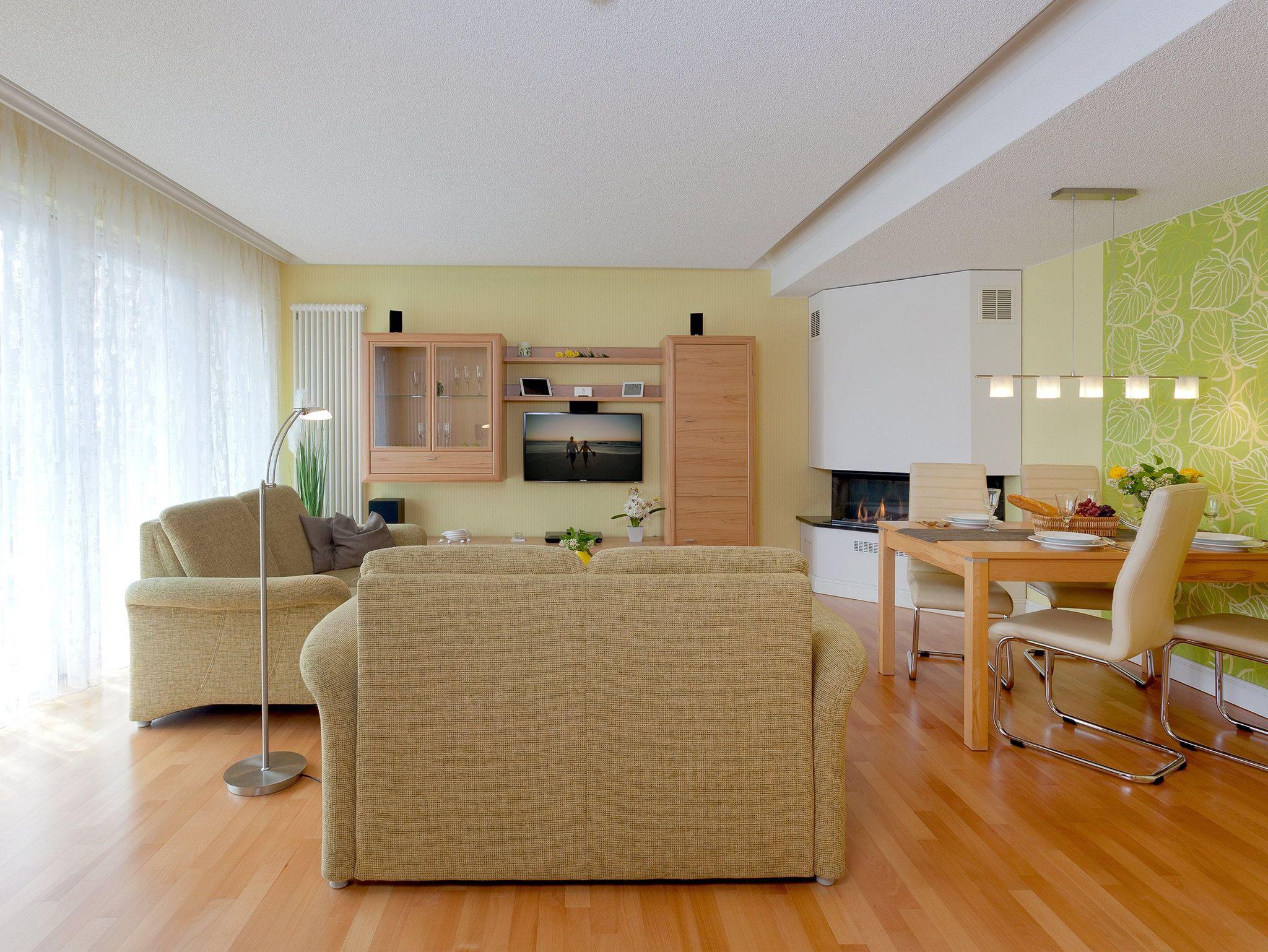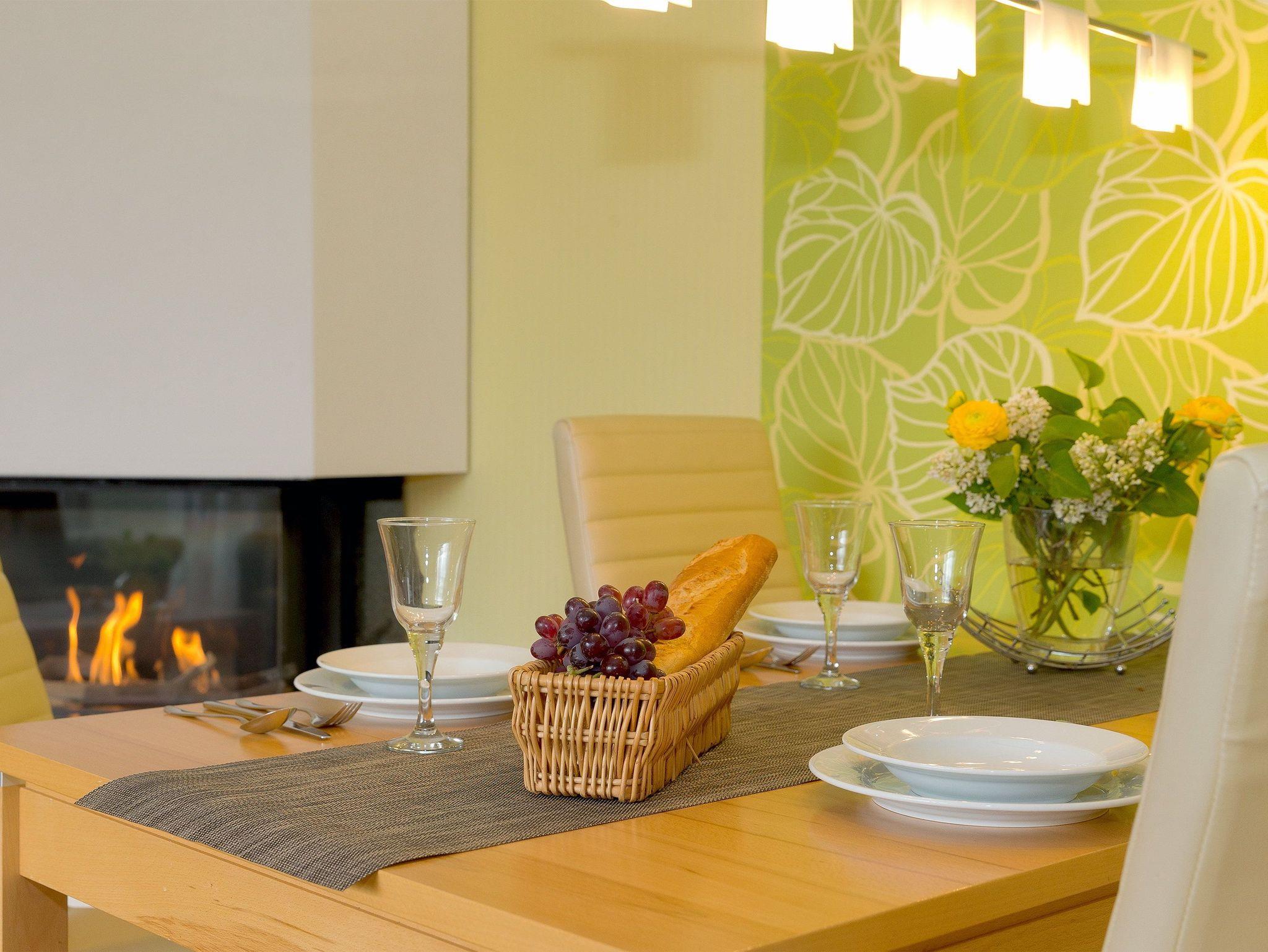 Im weiträumigen Wohnzimmer können Sie die Seele so richtig baumeln lassen. Der moderne Gaskamin sorgt per Funk für Gemütlichkeit zu jeder Jahreszeit. Die im Wohnbereich integrierte Einbauküche (Backofen, Kühlschrank mit Gefrierfach, Geschirrspüler, Mikrowelle, Wasserkocher, Toaster, Kaffeemaschine) lässt jedes Kochherz höher schlagen.