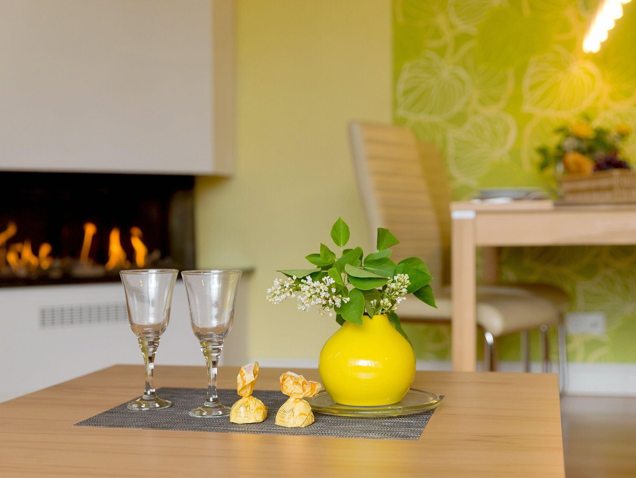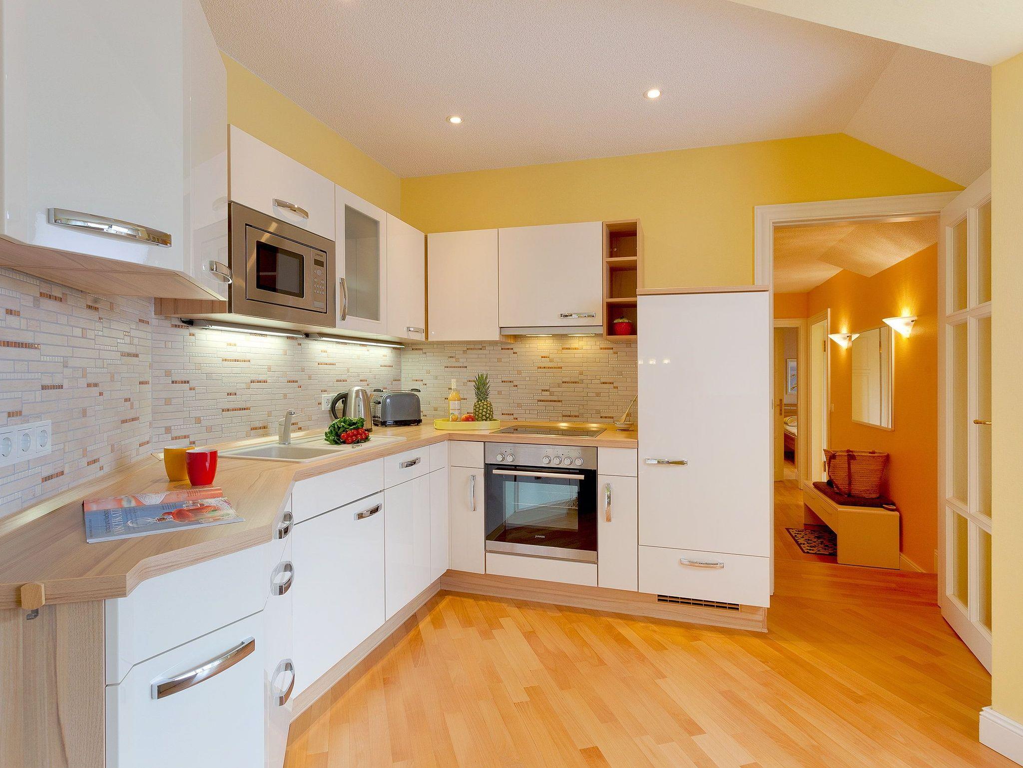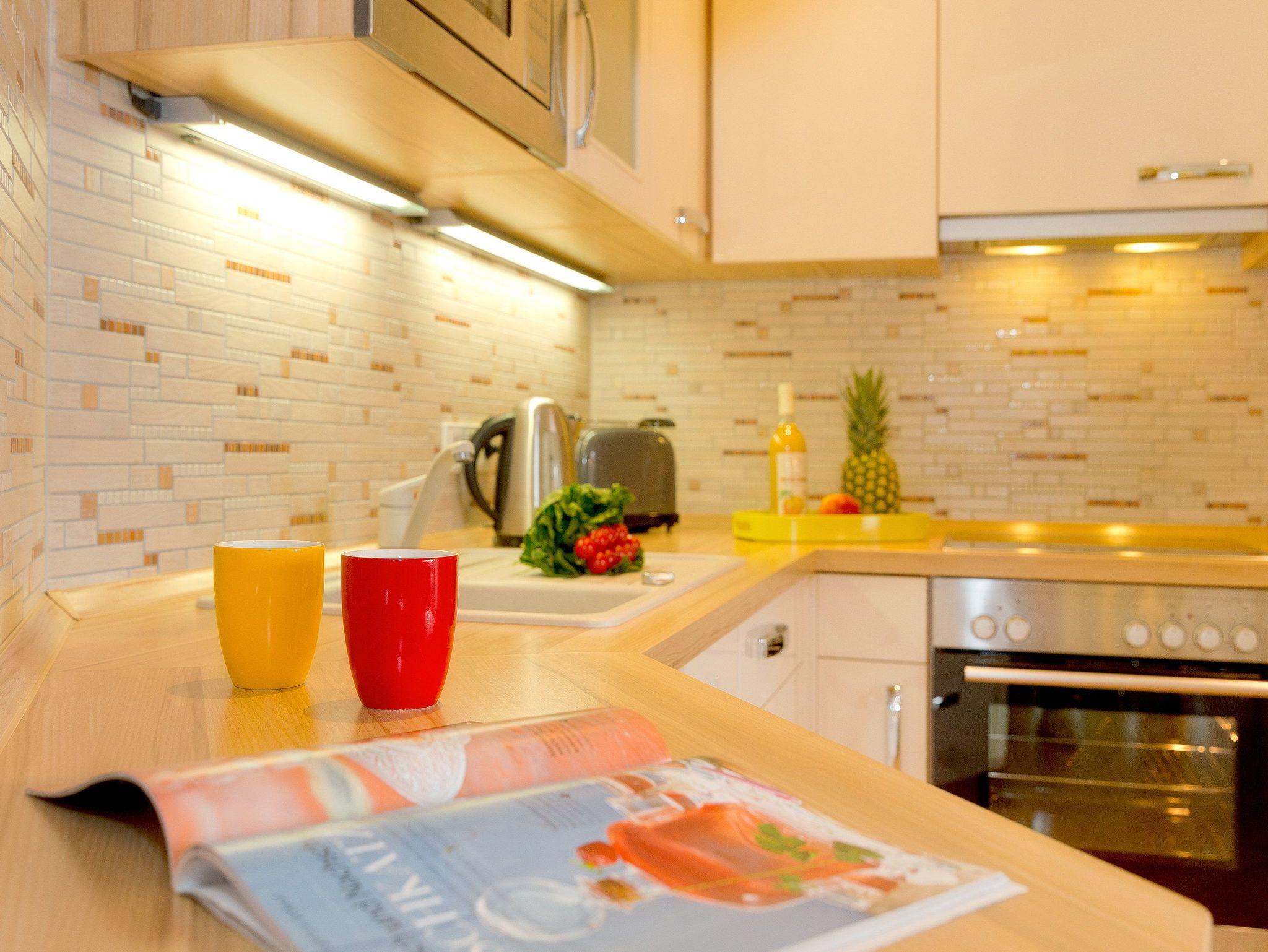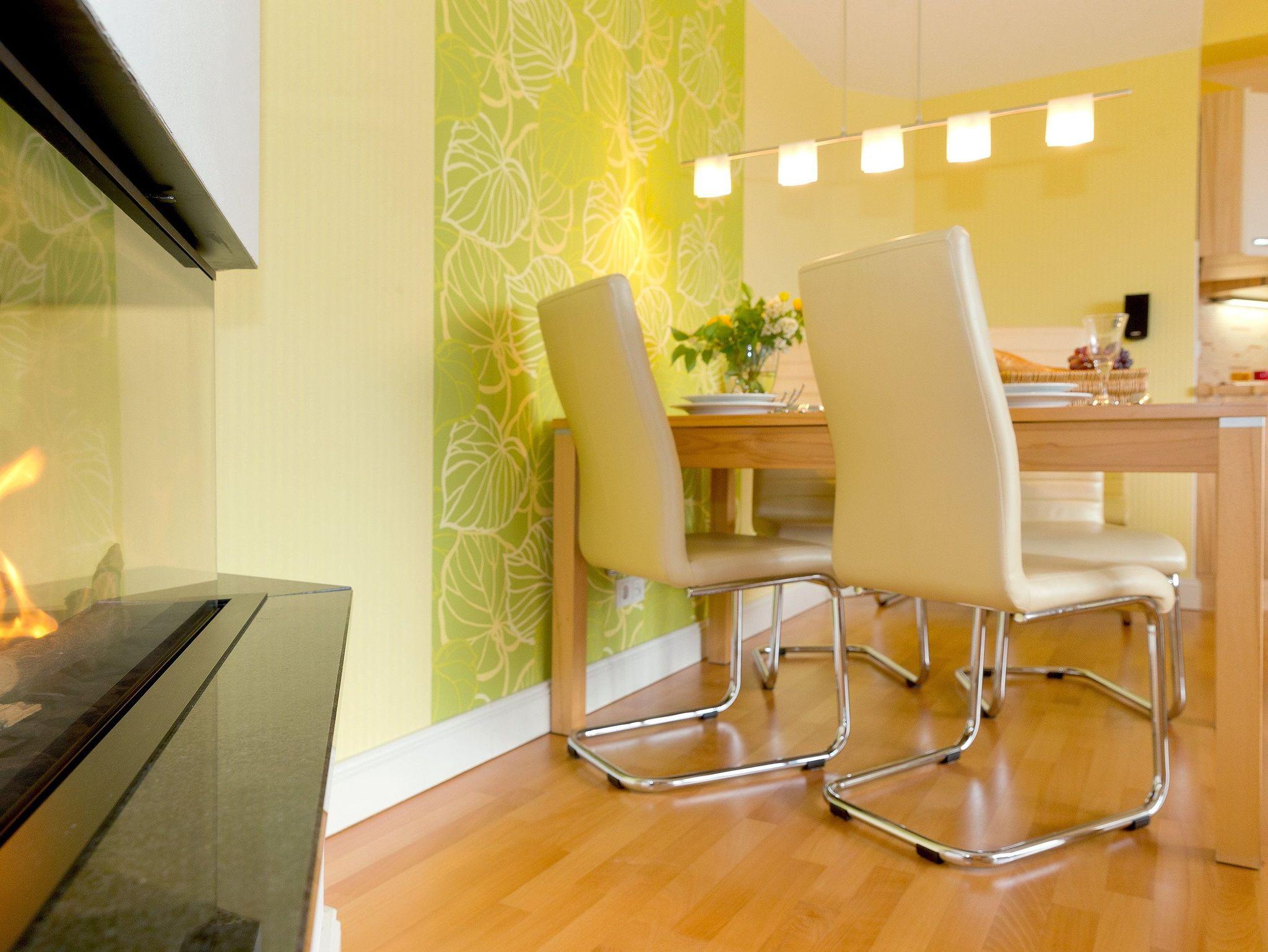 Im weiträumigen Wohnzimmer können Sie die Seele so richtig baumeln lassen. Der moderne Gaskamin sorgt per Funk für Gemütlichkeit zu jeder Jahreszeit. Die im Wohnbereich integrierte Einbauküche (Backofen, Kühlschrank mit Gefrierfach, Geschirrspüler, Mikrowelle, Wasserkocher, Toaster, Kaffeemaschine) lässt jedes Kochherz höher schlagen.