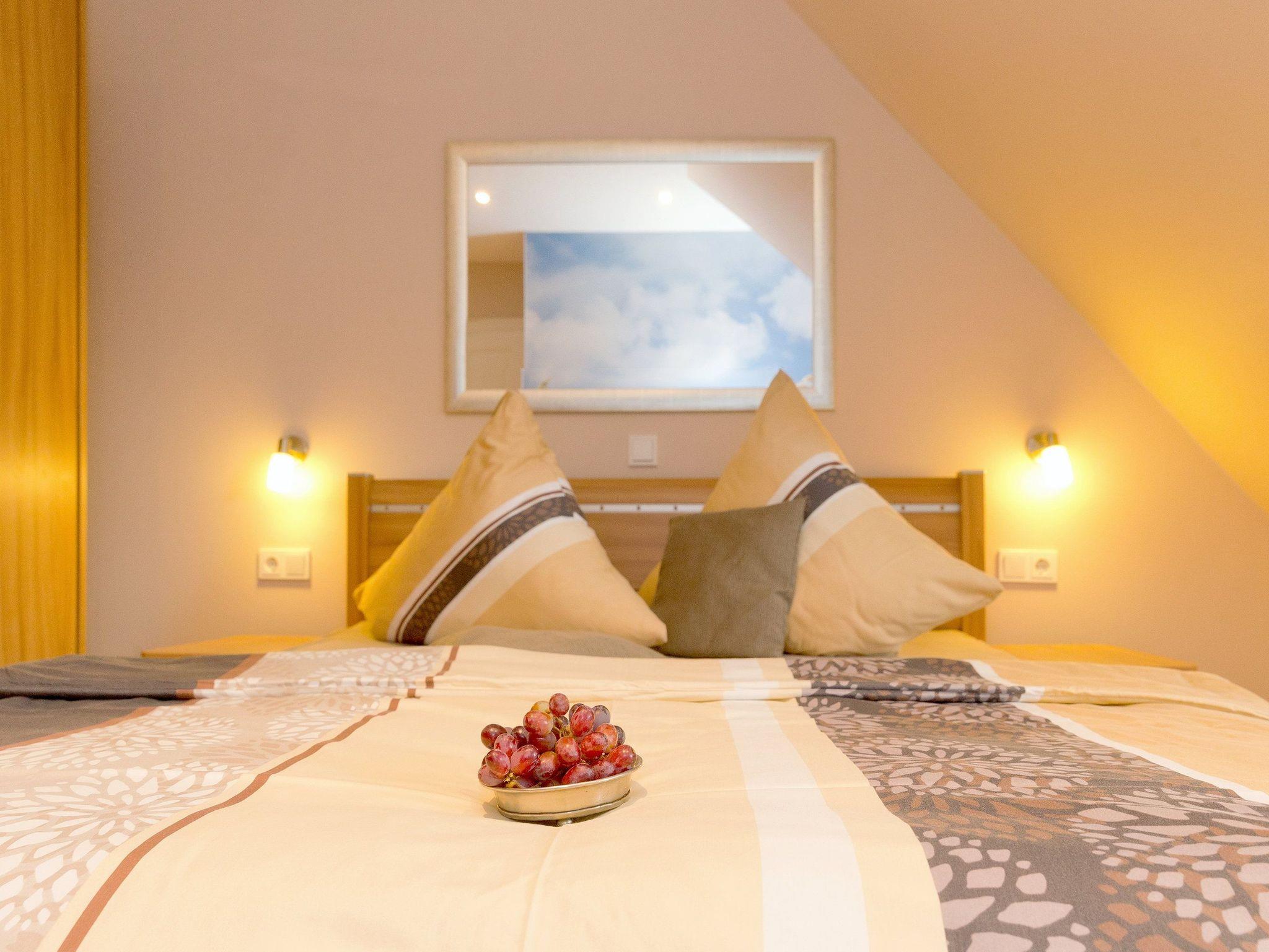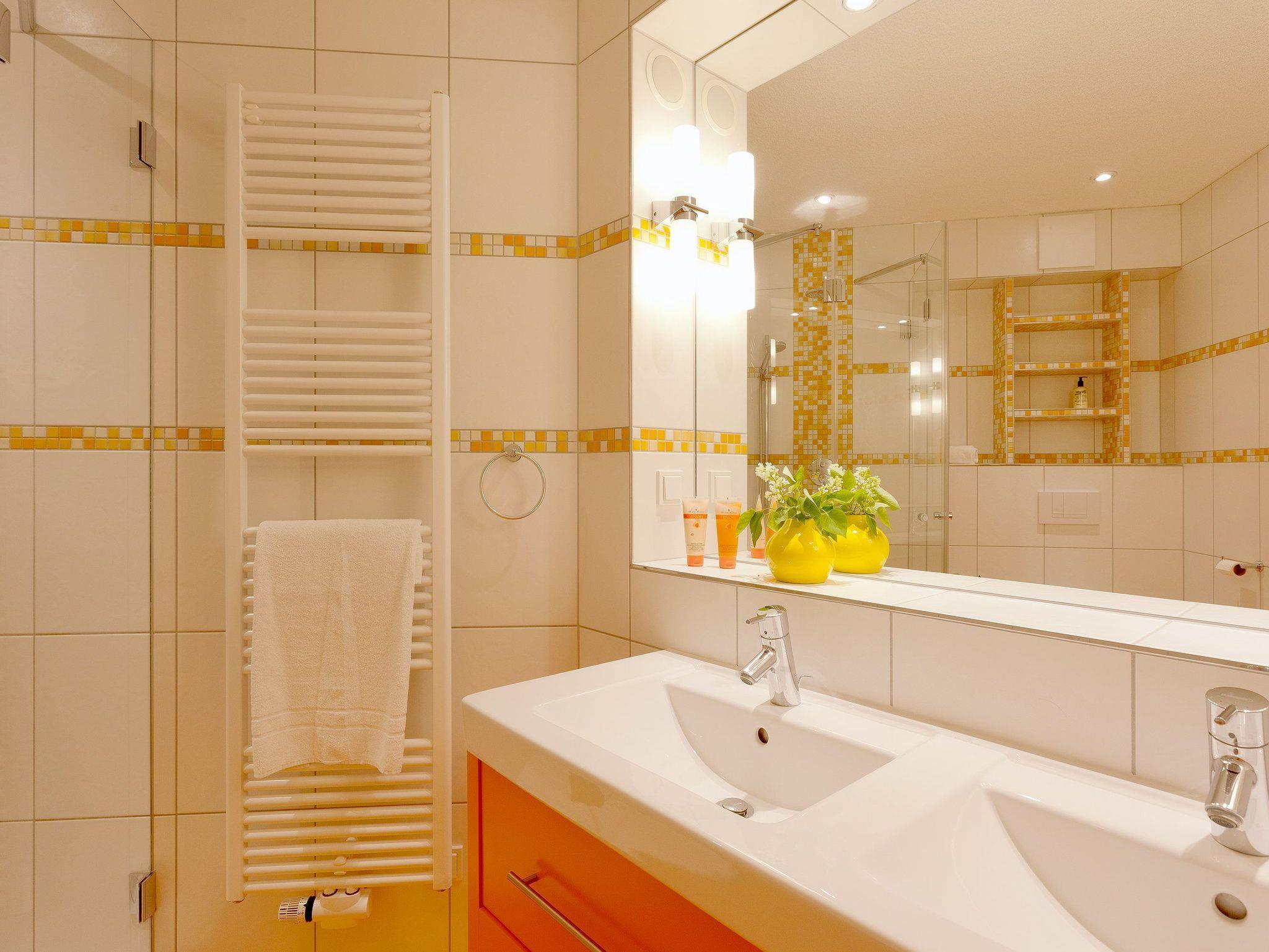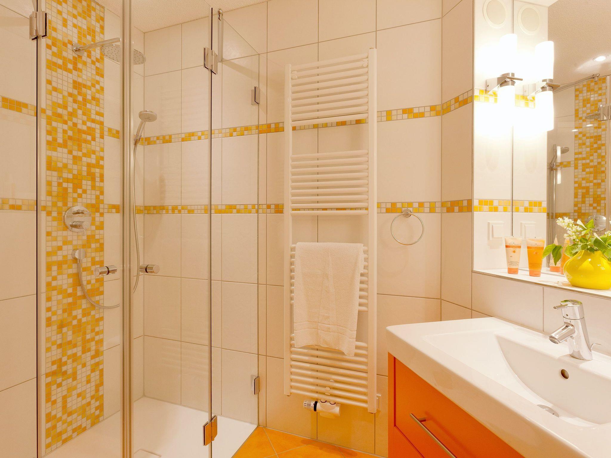 Damit Sie Ihre wohlverdiente Urlaubszeit bereits am Anreisetag in vollen Zügen genießen können ? haben wir das Bett für Sie und das für Ihre lieben Mitreisenden bereits bezogen und ein Duschtuch sowie ein kleines Handtuch bereitgelegt. Im Badezimmer befindet sich eine ebenerdige, vollverglaste Regenwalddusche und ein Doppelwaschtisch sowie ein WC und ein Haarfön.