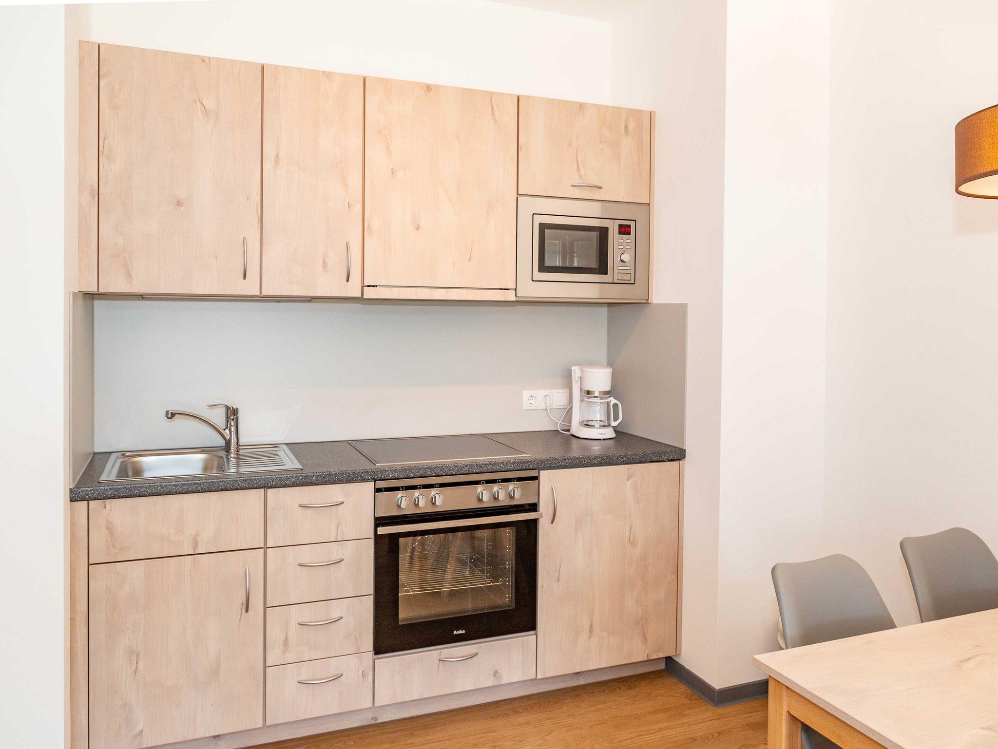 verfügt über Kühlschrank, 2 Herdplatten, Backofen, Mikrowelle und