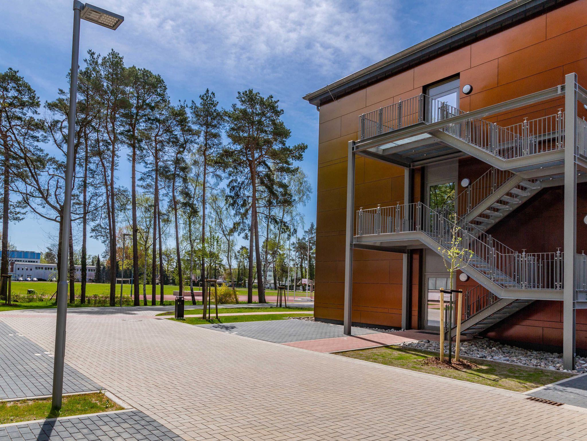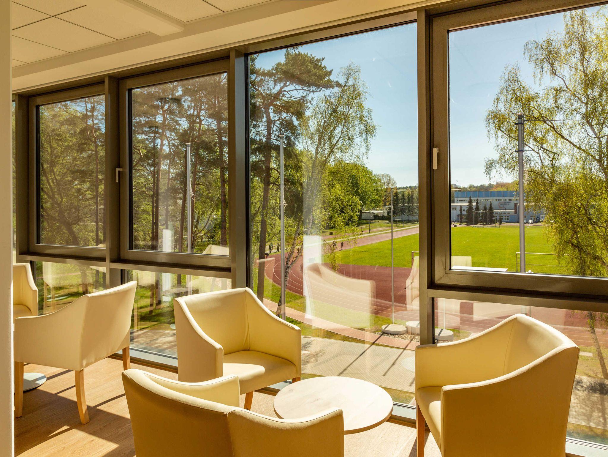 Die Sportschule vereinigt auf einer Fläche von rund 65.000 qm eine Beherbergungsstätte mit über 200 Betten, einen Sporthallenkomplex, ein Fußballfeld und Sportaußenanlagen. Sie ist der ideale Anlaufpunkt für Sportler aller Leistungs- und Altersbereiche, für Schulklassen, Gäste mit hoher Sportaffinität und Aktivreisende. Ein sehr gutes Preis-Leistungs-Verhältnis macht sie aber gleichermaßen interessant für Individualreisende und Familien. Sie punktet besonders mit ihrer Lage und der Weitläufigkeit der Anlage. Ob Strandbesuch, Ortsbummel, Waldspaziergang, Shoppingtour, Kultur – im Umkreis von nur einem Kilometer ist all dies möglich. Auf den Sportanlagen herrscht immer reges Treiben. Dem interessierten Gast bietet sich die Möglichkeit dem einen oder anderen Spitzenathleten beim Training zuzusehen aber natürlich auch selbst aktiv zu werden.