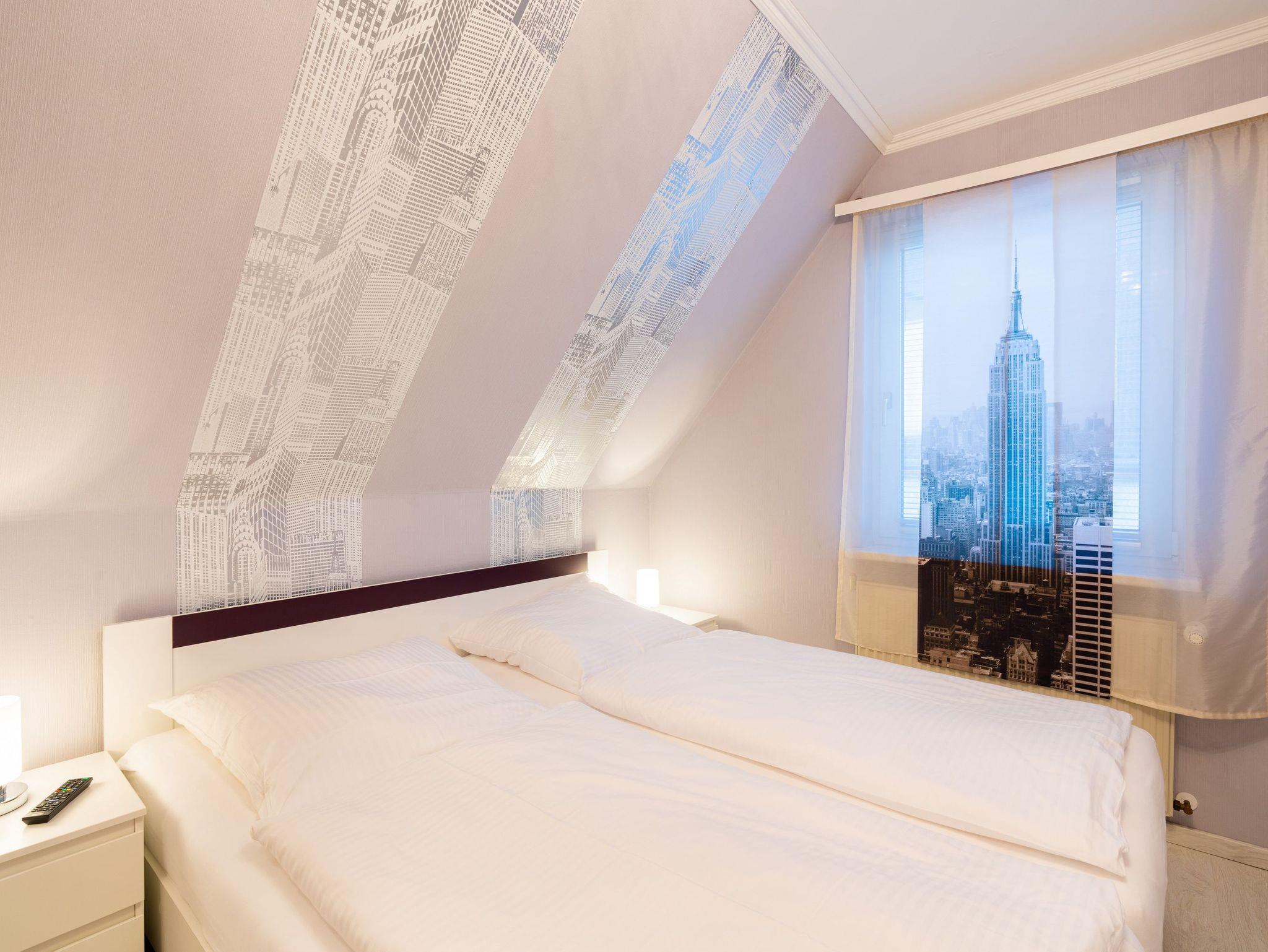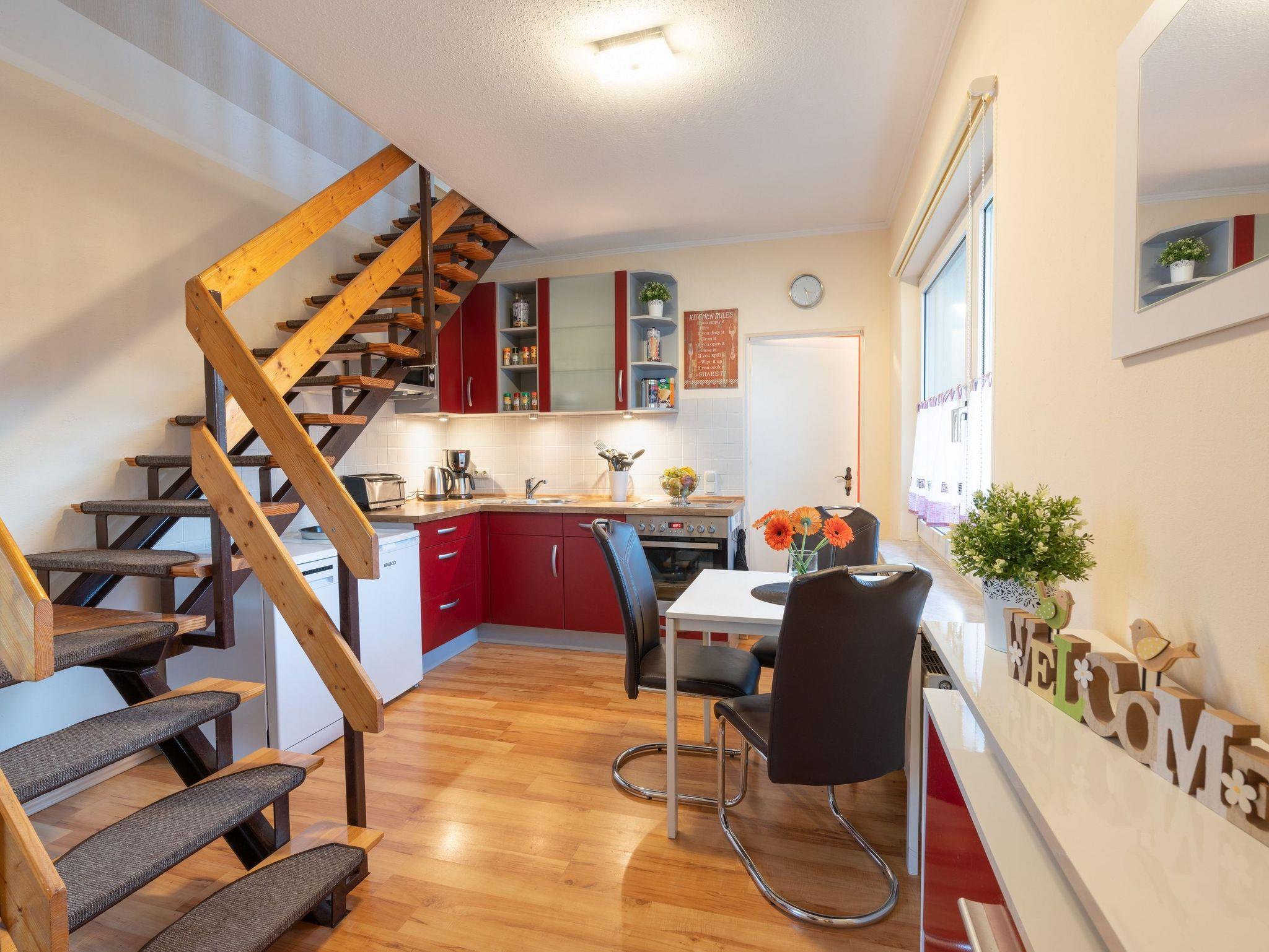 Das stilvoll eingerichtete Maisonette-Appartement empfängt bis zu zwei Gäste im Erdgeschoss mit einer gut ausgestatteten Küchenzeile mit Ceranfeld und Backofen, Kühlschrank mit Gefrierfach, Geschirrspüler, Mikrowelle, Wasserkocher, Toaster, Kaffeemaschine sowie Essplatz für zwei Personen.