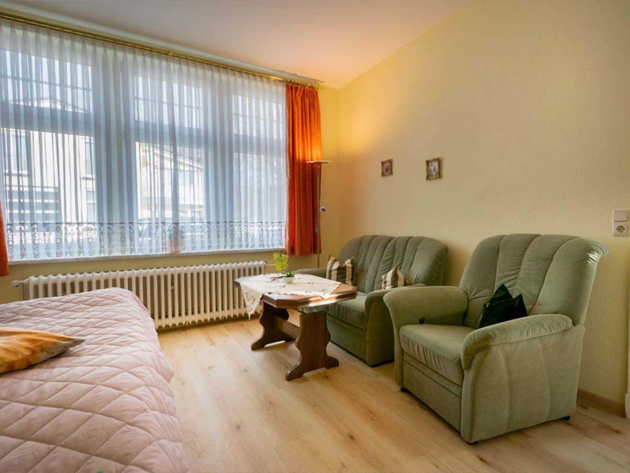Gemühtlich, modern eingerichtete 35m² große 2-Raum Ferienwohnung mit Wohn-/Schlafzimmer, einer kleinen Küche sowie Bad mit Dusche/WC.