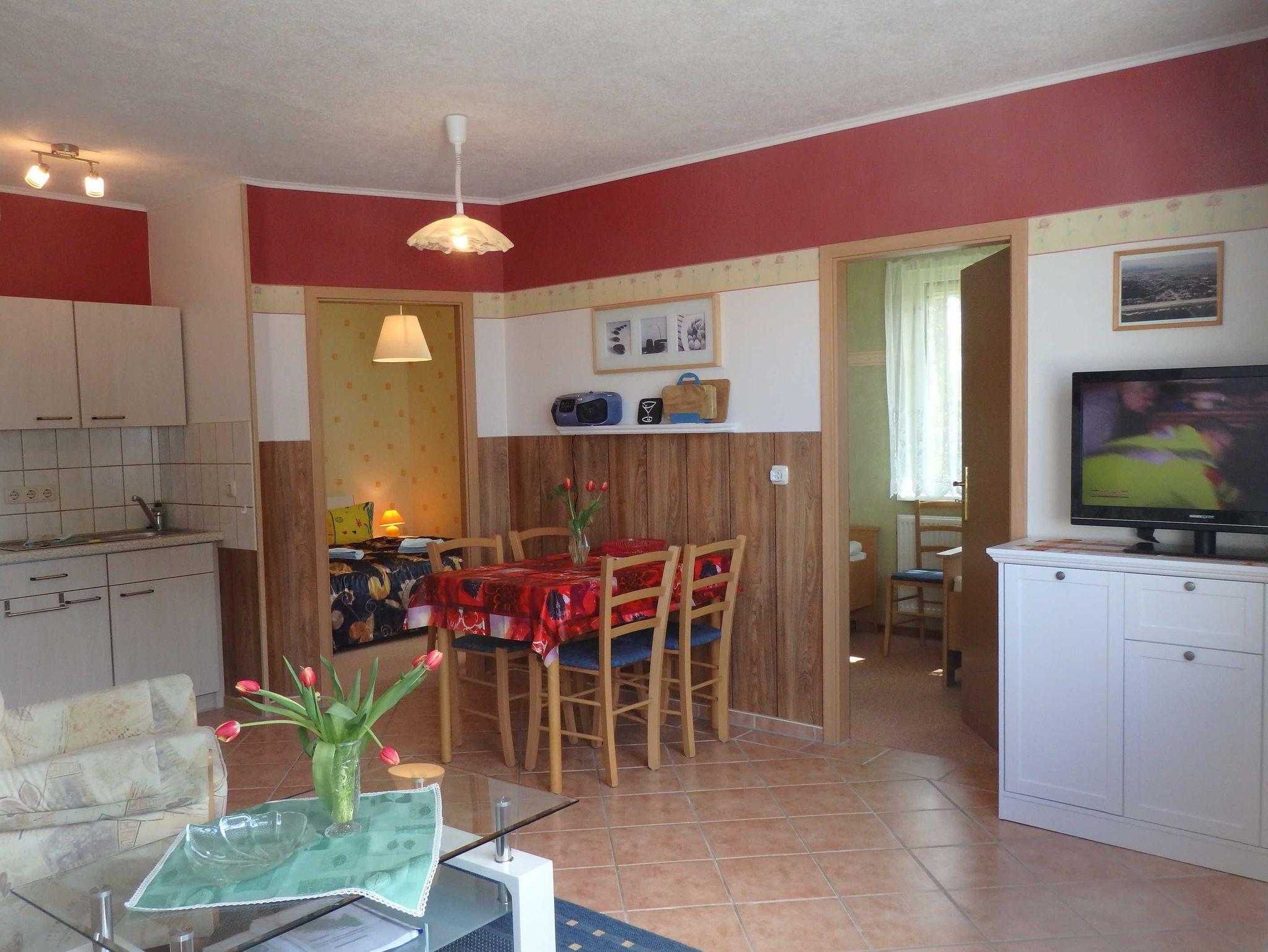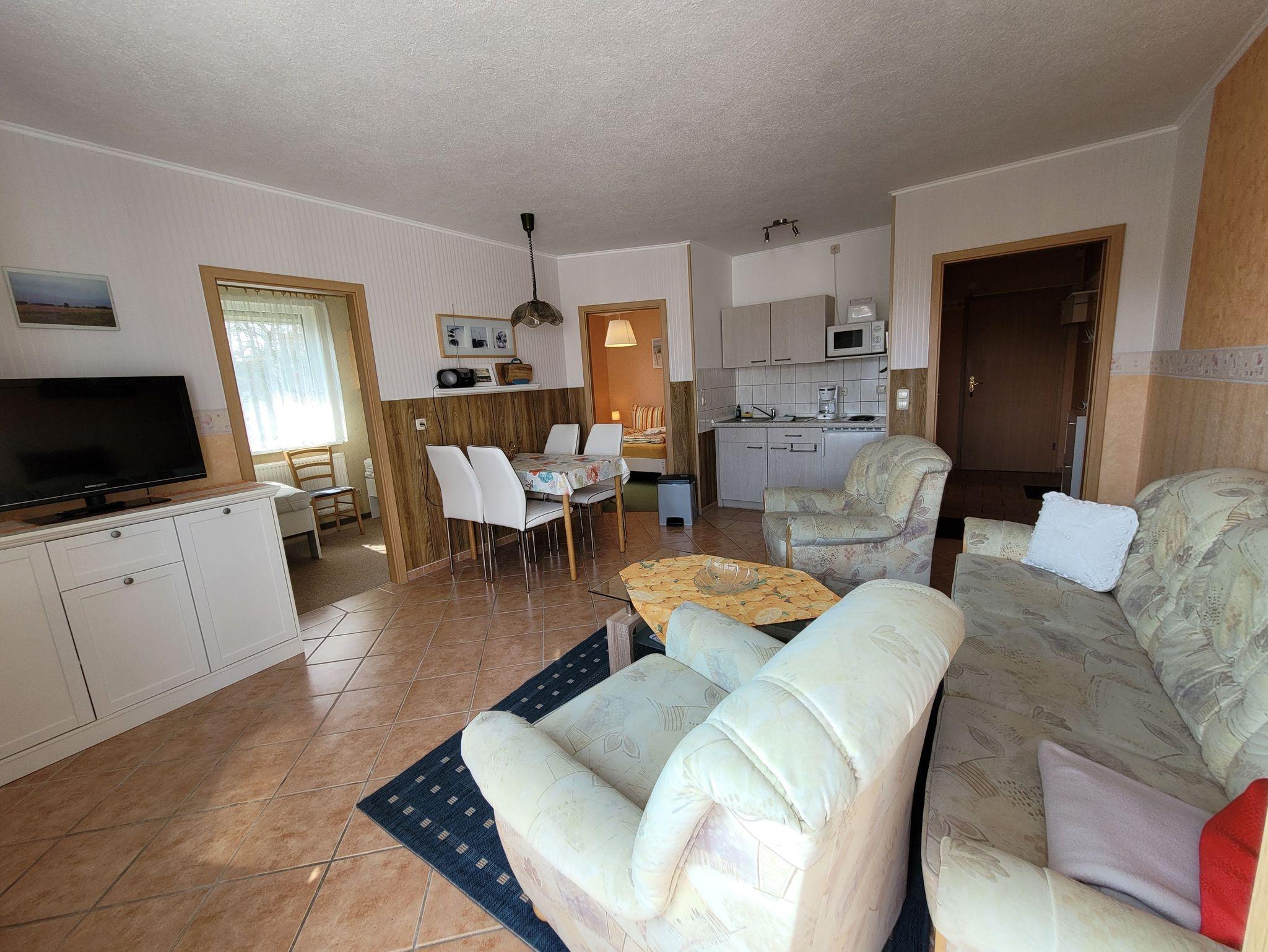 Die komplett eingerichtete Ferienwohnung mit Wohnzimmer, zwei Schlafzimmern mit einmal einem Doppelbett und einmal zwei Einzelbetten, Küchenzeile, Dusche, WC, Flur und großer Terrasse/Balkon würde für Sie bereitstehen. Zur Ausstattung gehören weiter Radio, Sat- Fernseher, einmalig Bettwäsche und Handtücher. In der Küchenzeile sind Mikrowelle, Kaffeemaschine und Toaster, Eier- und Wasserkocher sowie ein 2- Platten-Kocher, Kühlschrank und Geschirr vorhanden.