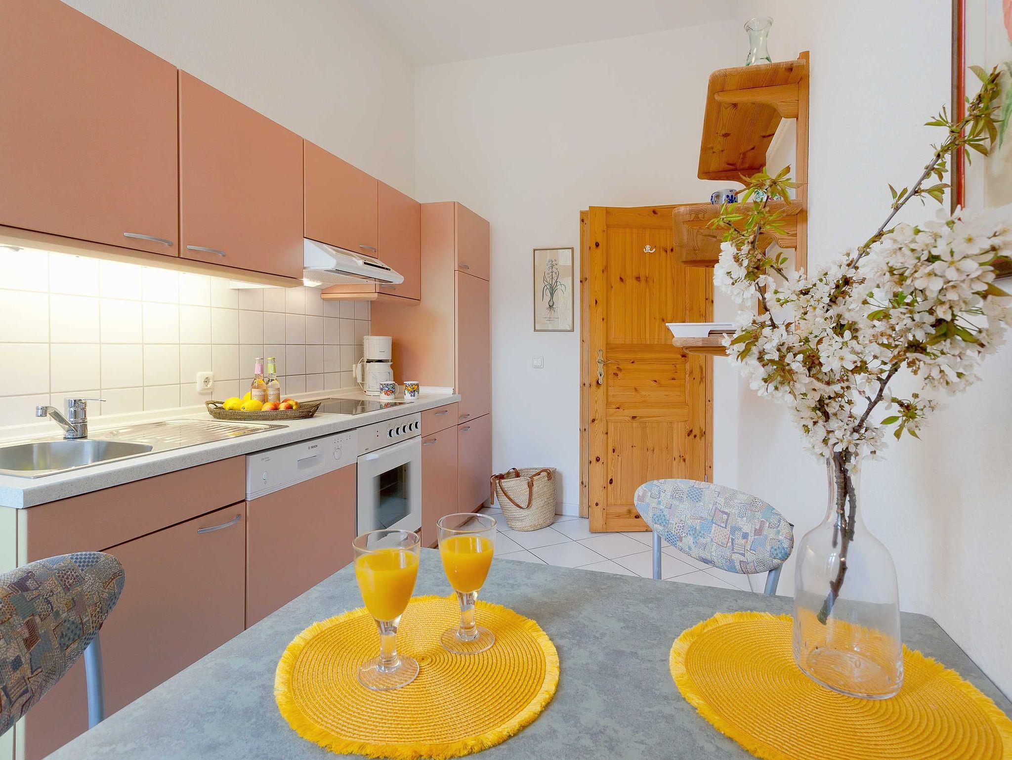 Die separate Küche ist ausreichend ausgestattet, um Mahlzeiten zuzubereiten.