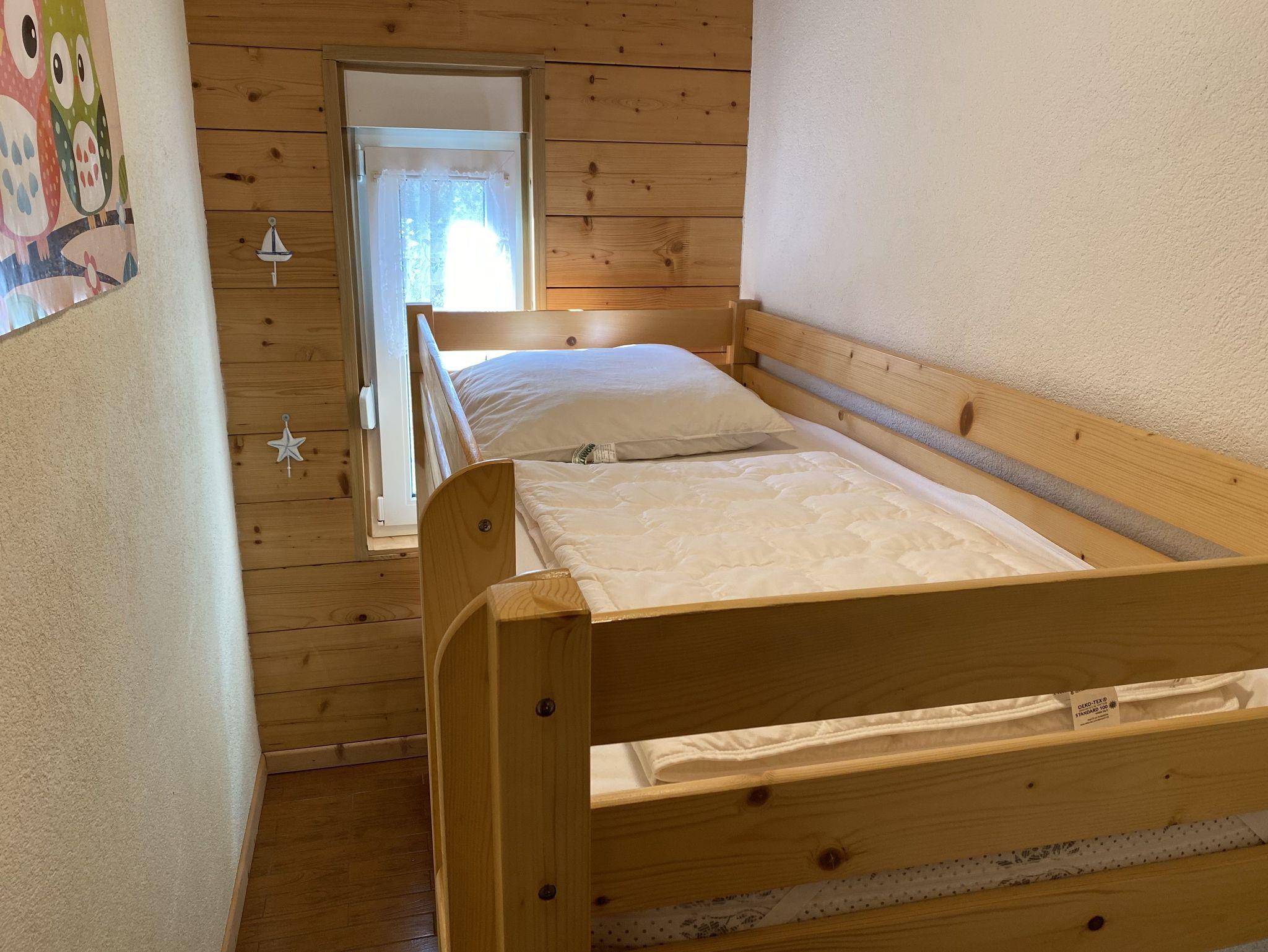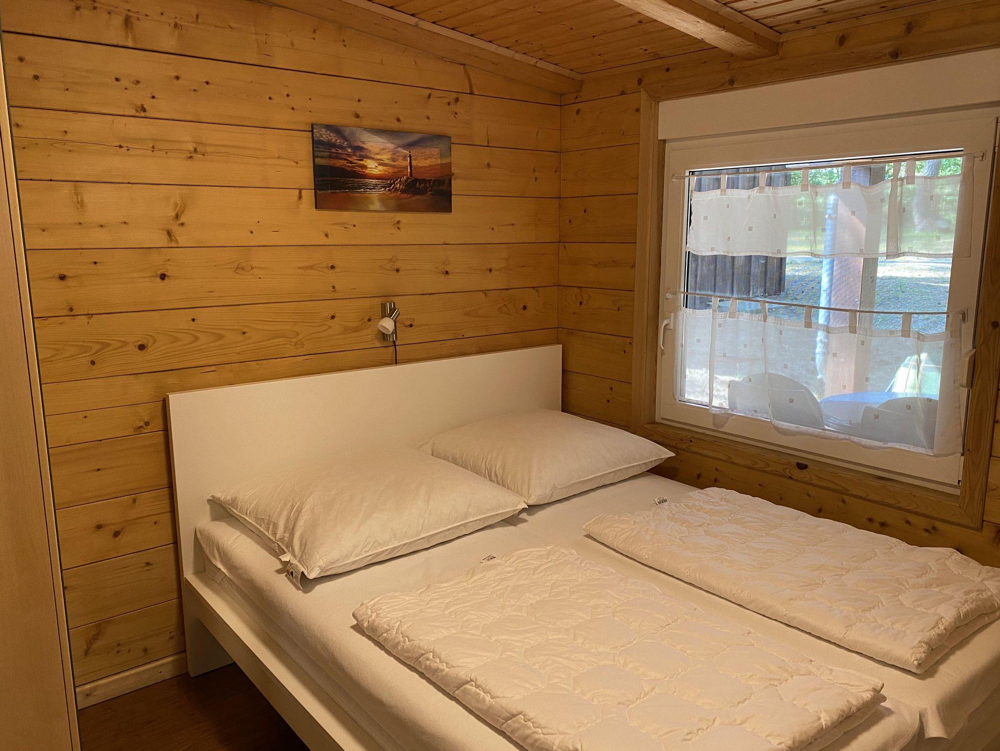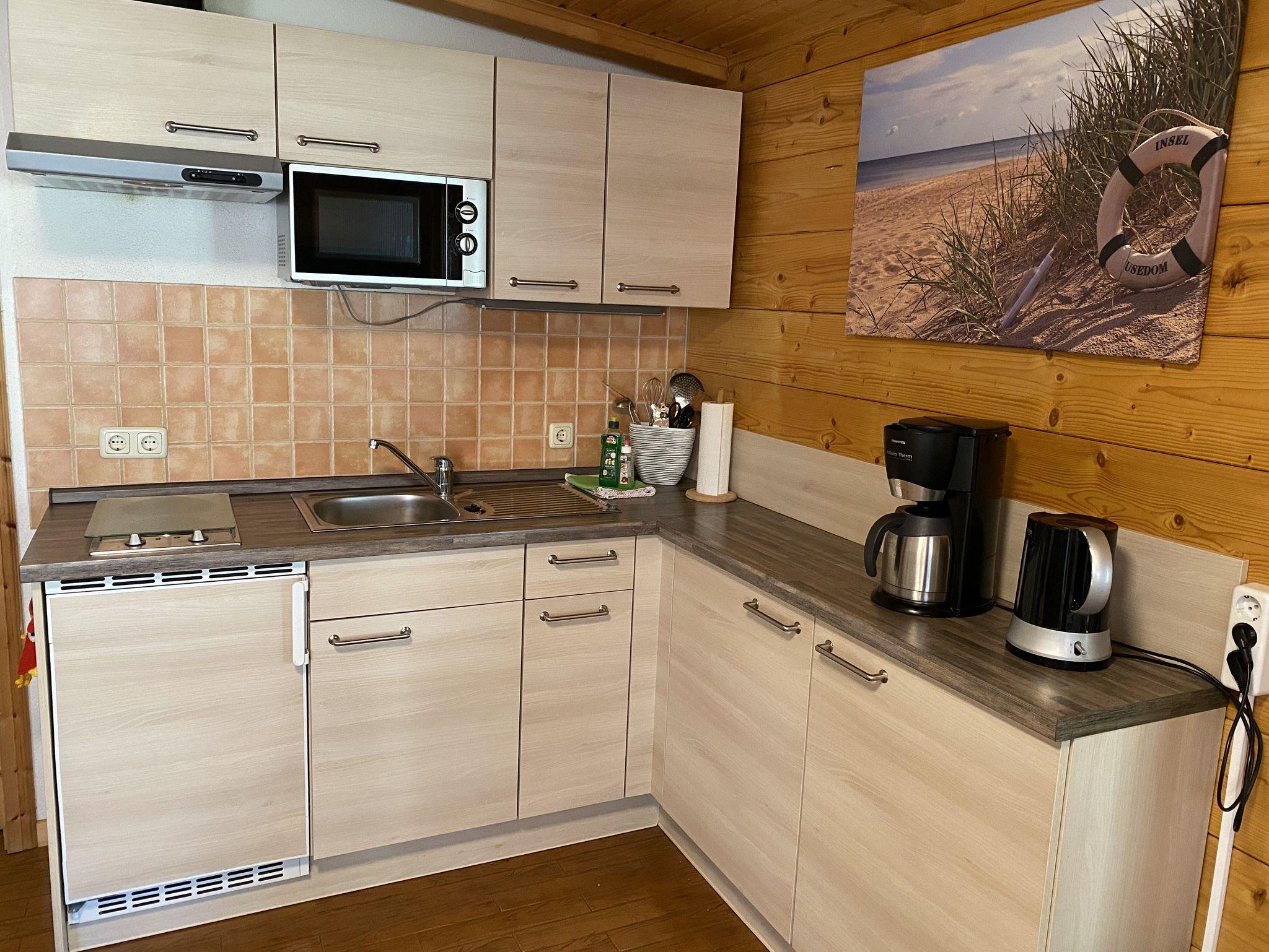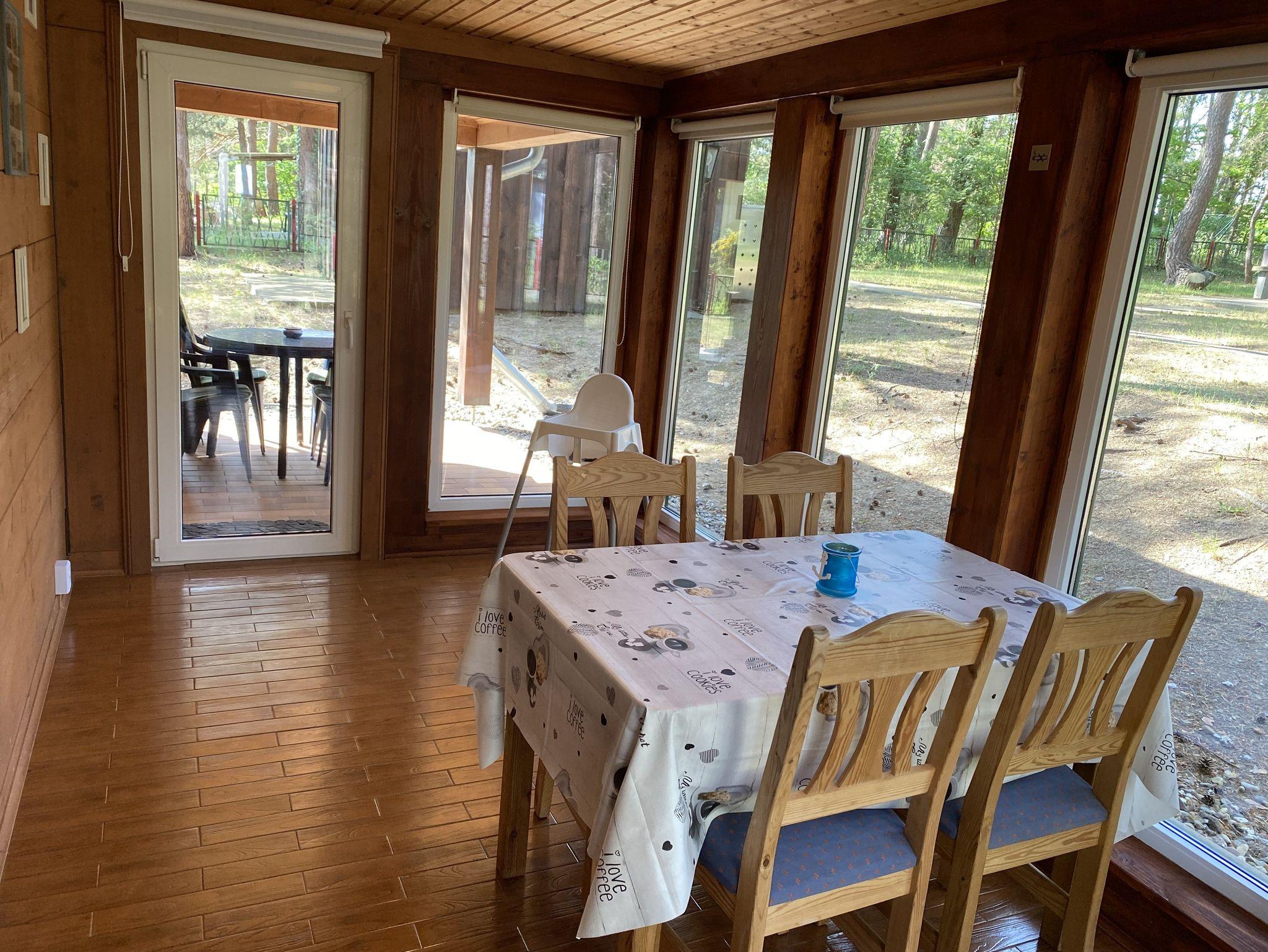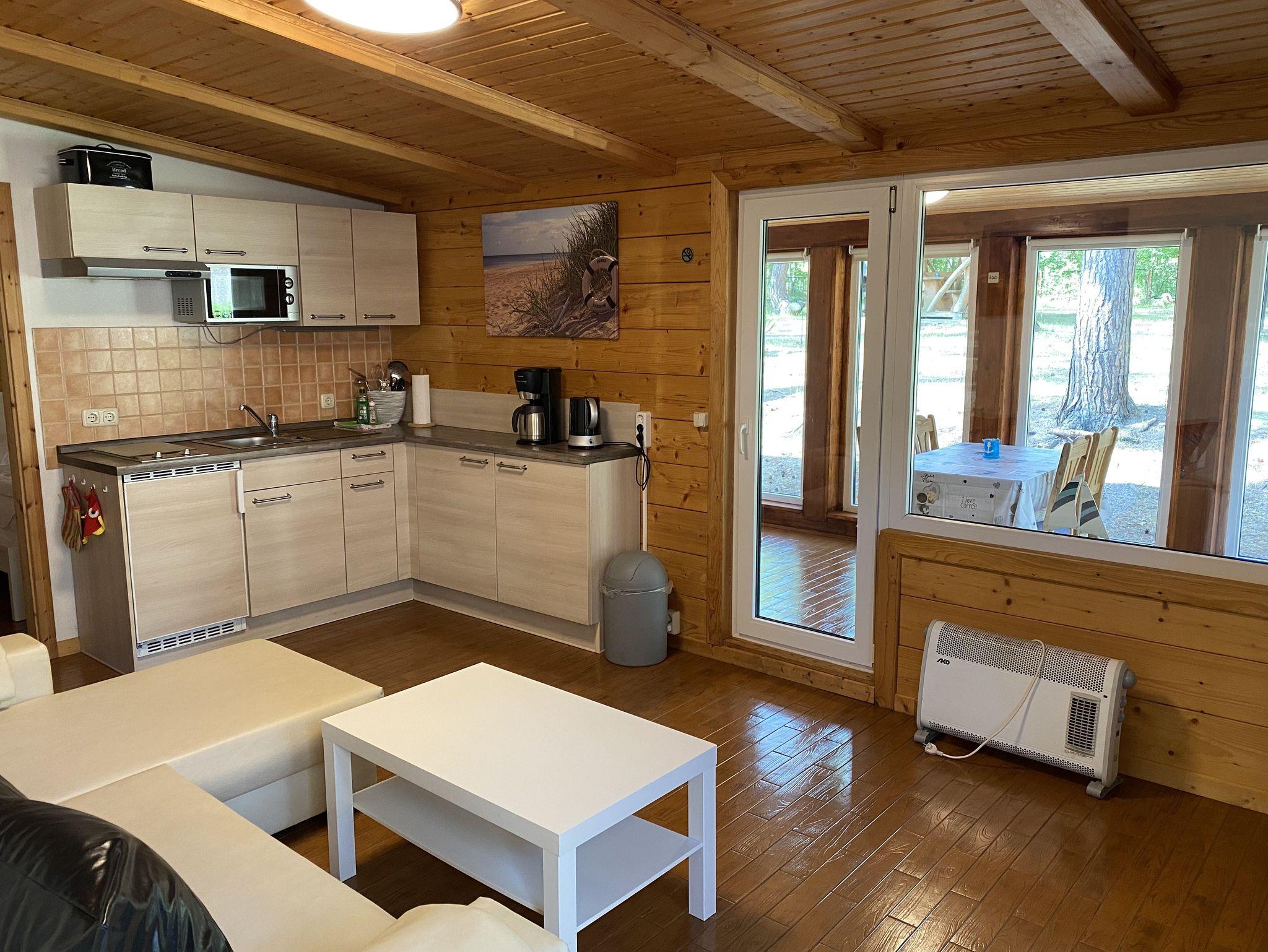 Das 50 qm große Ferienhaus ist modern eingerichtet. Es ist alles vorhanden, um Ihren individuellen Urlaub zu genießen. Das Haus verfügt über eine Wohnküche- mit Eckcouch, eine moderne Küchenzeile mit Mikrowelle, 2 Platten Kochfeld, Kühlschrank Wasserkocher, Toaster und Kaffeemaschine. Im Elternschlafzimmer befindet sich ein Doppelbett (1,60 x 2,00m) und im Kinderschlafzimmer ein Doppelstockbett (0,9 x 2 m). Das Badzimmer ist mit Dusche und WC ausgestattet. Zum Haus gehören ein Wintergarten und eine überdachte Terrasse. Von der Ferienwohnung Waldblick haben Sie Blick in den Wald.