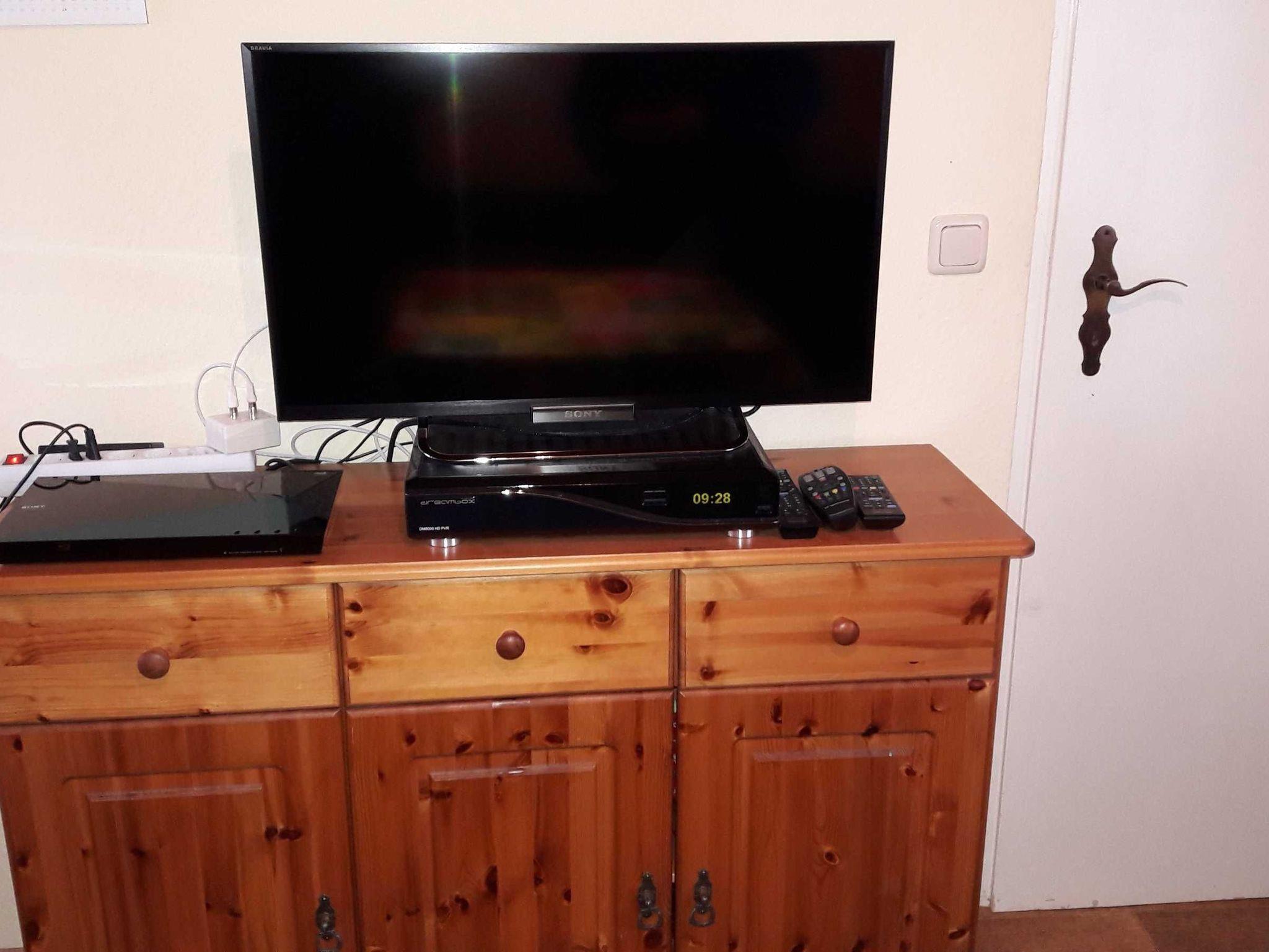 gut ausgestattete Einbauküche mit Herd, Gläser, Geschirr, Besteck, Kaffeemaschine, Toaster, Wasserkocher, Geschirrspüler, Mikrowelle, Kühlschrank, Flachbild-TV, Blu-Ray Player, Radio, Staubsauger