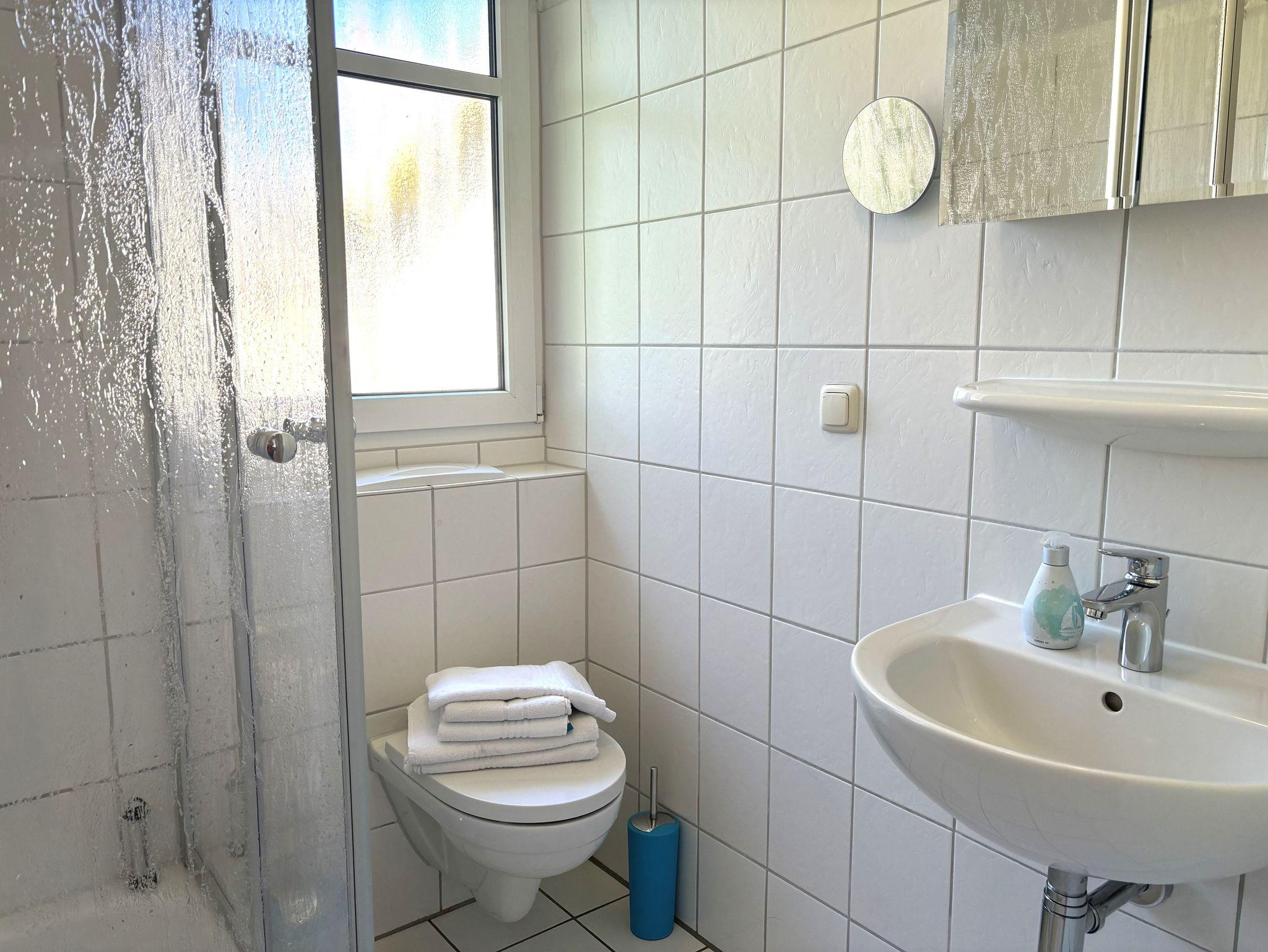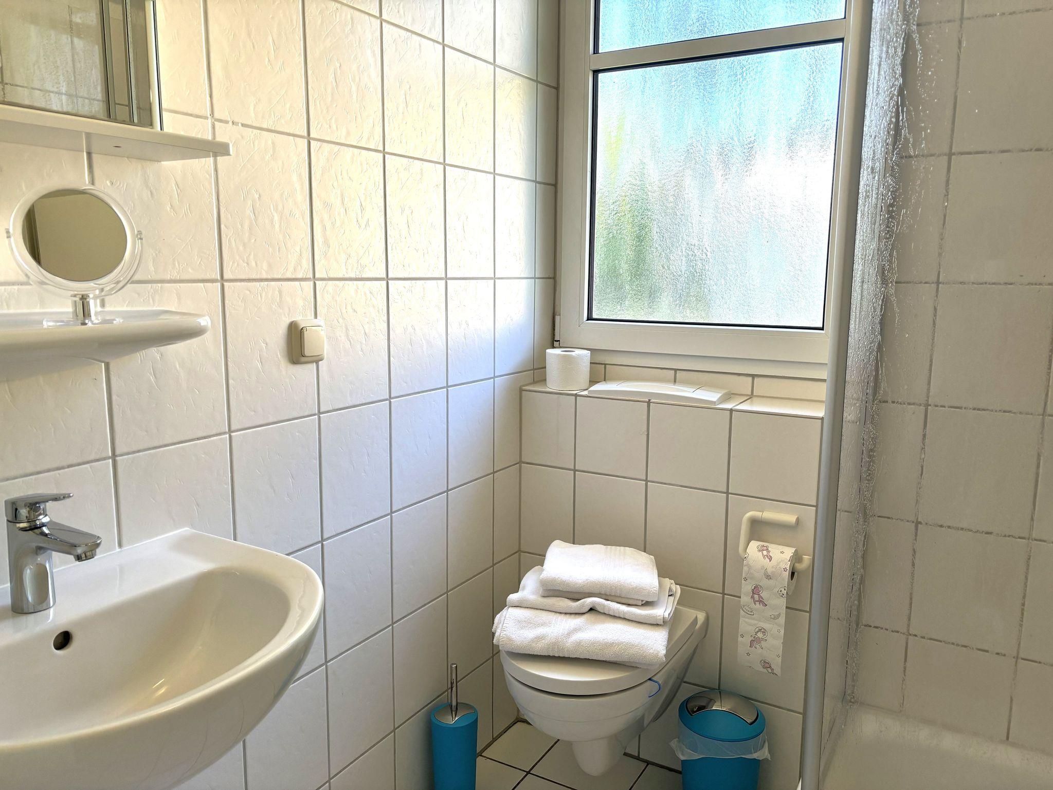 Waschmaschine und Trockner sind ebenfalls vorhanden und können mit Wertmarken genutzt werden. Der abschließbare Abstellraum für Fahrräder befindet sich auf dem Grundstück im Nebengebäude.