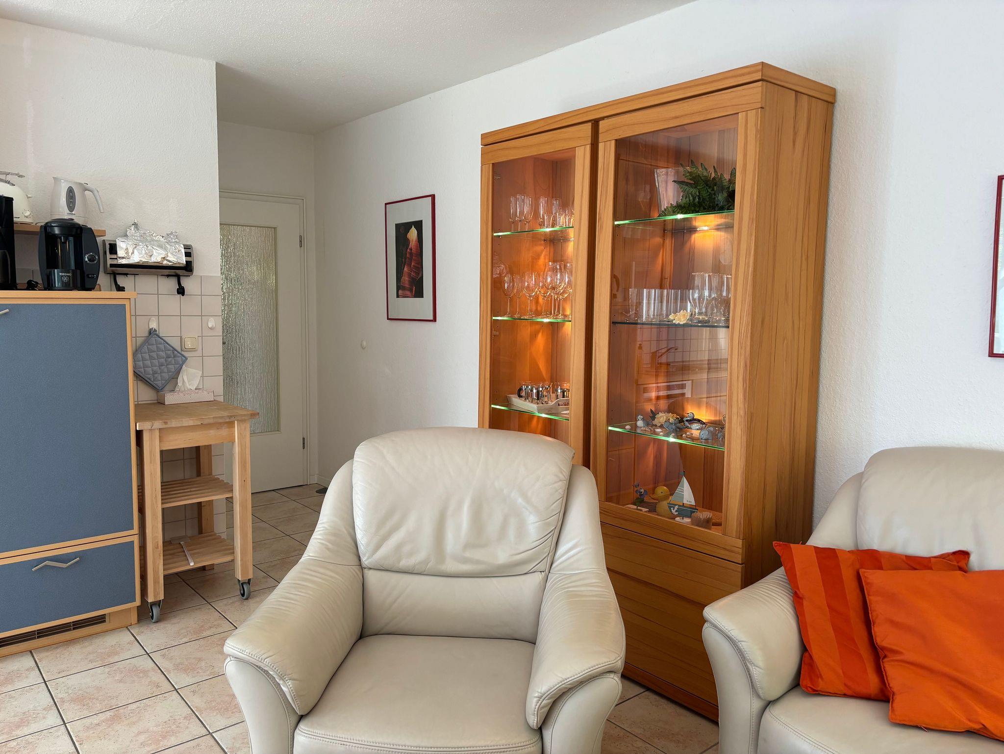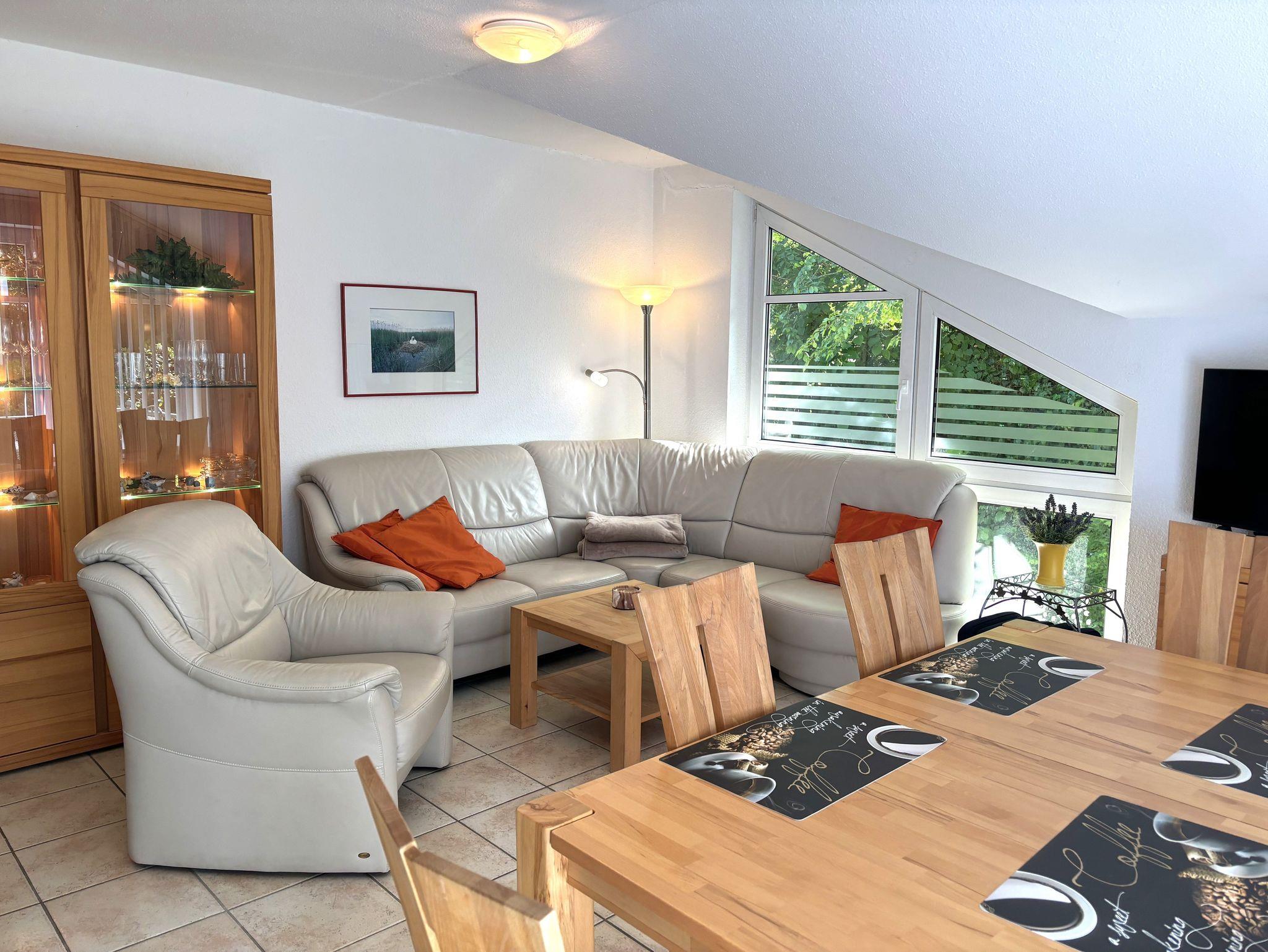 Der große Wohnraum verfügt über eine Ledersitzgarnitur, sowie SAT-TV und DVD-Player. Die offene Küchenzeile befindet sich ebenfalls im Wohnraum und ist mit einem Geschirrspüler, Backofen, Mikrowelle, Raclette, Kaffeemaschine, Wasserkocher, Mixer, Toaster, Fondue, Tischgrill sowie Bügeleisen und Bügelbrett ausgestattet. Die 5-Personen-Essecke lässt sich durch eine versenkte Mittelplatte erweitern. Der Südwestbalkon lädt mit einer Sitzgruppe mit Polstern und Tisch zum Verweilen ein.