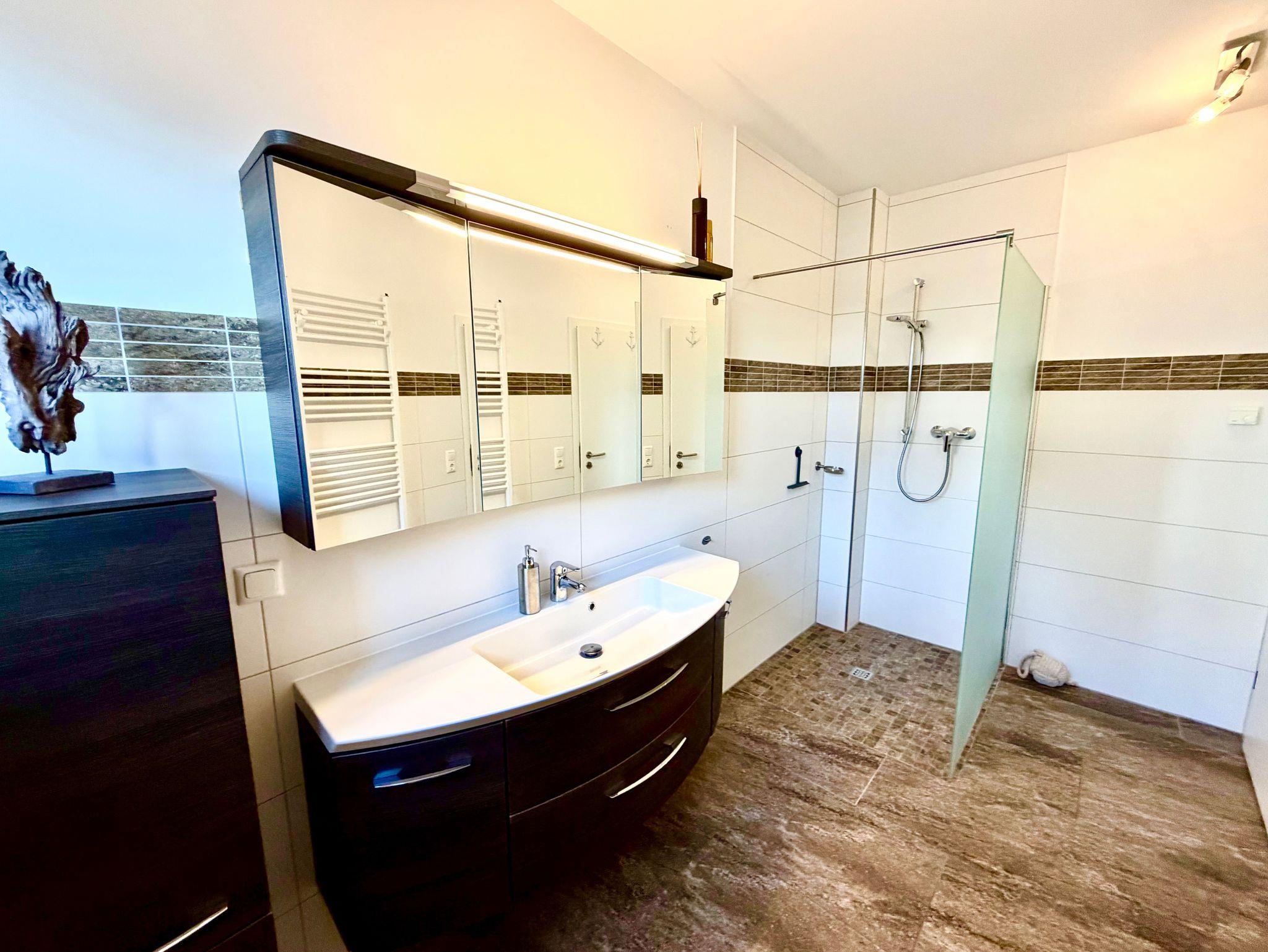 Das Schlafzimmer ist mit einem komfortablen Doppelbett und einem modernen LED-Fernseher ausgestattet, ideal für entspannte Abende nach einem aufregenden Tag am Meer. Das Badezimmer verfügt über eine ebenerdige Dusche, die optimal für ältere Gäste geeignet ist und den Zugang erleichtert.