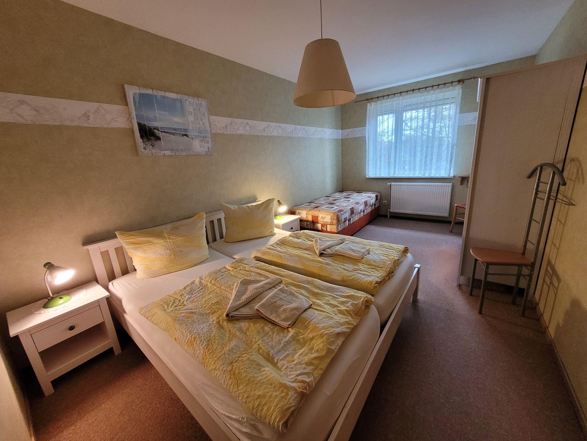 Unser Ferienhaus liegt ca.15 Geh-Minuten vom Strand entfernt in einer ruhigen Wohnlage. Die komplett eingerichtete Ferienwohnung mit Wohnzimmer, ein Schlafzimmer mit einem Ehebett und einer Liege, Küchenzeile, Dusche, WC, Flur und großem Balkon würde für Sie bereitstehen. Zur Ausstattung gehören weiter Radio, Fernseher, einmalig Bettwäsche und Handtücher. In der Küchenzeile sind Mikrowelle, Kaffeemaschine und Toaster, Eier-und Wasserkocher sowie ein 2-Platten-Kocher, Kühlschrank und Geschirr vorhanden. Eine Aufbettung ist im Wohnzimmer nach Absprache auf dem ausziehbarem Sofa möglich. Zu jeder Wohnung gehört ein kostenloser Parkplatz für Ihr Auto.