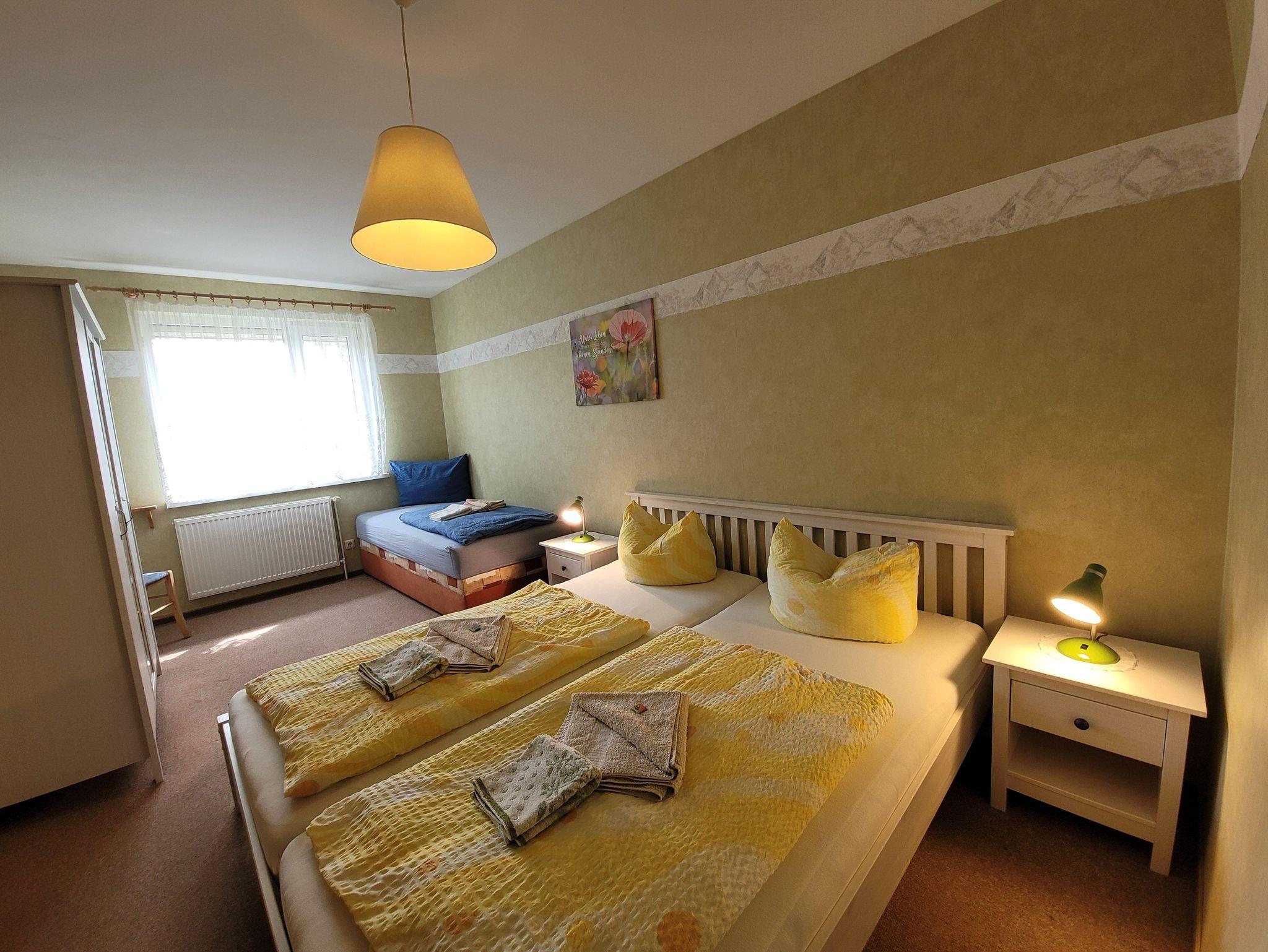 Die komplett eingerichtete Ferienwohnung mit Wohnzimmer, ein Schlafzimmer mit einem Ehebett und einer Liege, Küchenzeile, Dusche, WC, Flur und großem Balkon würde für Sie bereitstehen. Zur Ausstattung gehören weiter Radio, Sat-Fernseher, einmalig Bettwäsche und Handtücher. In der Küchenzeile sind Mikrowelle, Kaffeemaschine und Toaster, Eier- und Wasserkocher sowie ein 2- Platten-Kocher, Kühlschrank und Geschirr vorhanden. Wir möchten Sie darauf hinweisen, dass es sich bei unseren Ferienwohnungen um Nichtraucherwohnungen handelt. Natürlich dürfen Sie auf dem Balkon oder der Terrasse rauchen. Die Waschmaschinen- und Trocknerbenutzung ist nach vorheriger Absprache möglich.