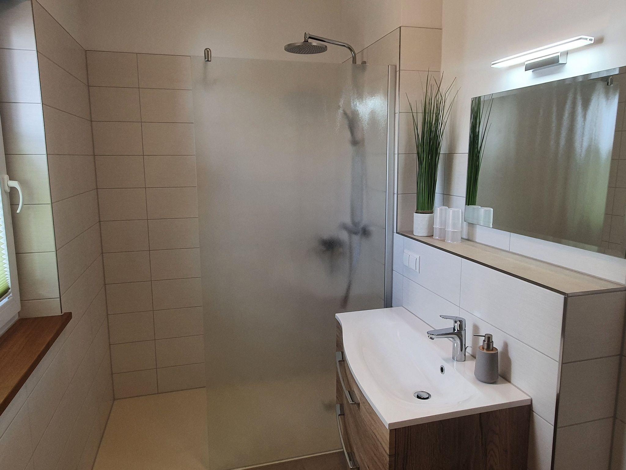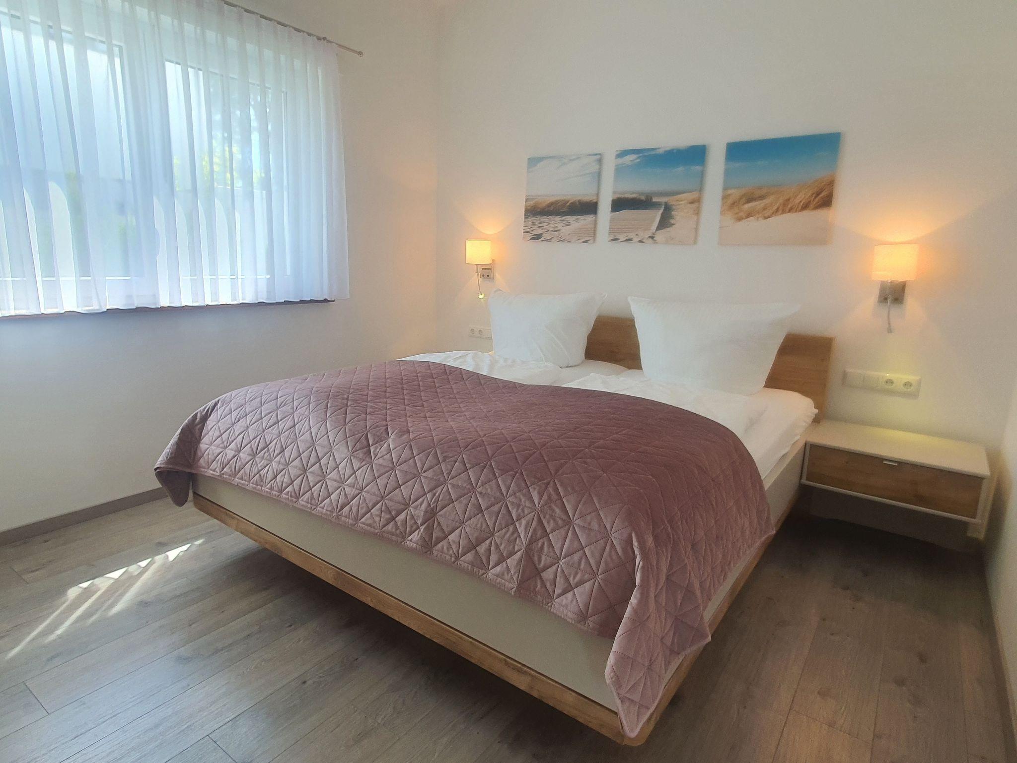 Die Wohnung 3 befindet sich im Erdgeschoss. Diese helle, großzügige Wohnung empfehlen wir gerne Familien oder Urlaubsgästen, die mit mehr als 2 Personen reisen möchten. Für genug Privatsphäre sorgen 2 getrennte Schlafbereiche, die ganz klassisch mit einem Doppelbett möbliert sind. Selbstverständlich müssen Sie nicht auf genug Stauraum im Kleiderschrank und beleuchtete Nachttische verzichten. Für Schlafkomfort sorgen verstellbare Lattenroste und hochwertige Federkernmatratzen. In der Wohnung stehen Ihnen ein Badezimmer mit ebenerdiger, begehbarer Dusche sowie ein zusätzliches separates Gäste-WC zur Verfügung.