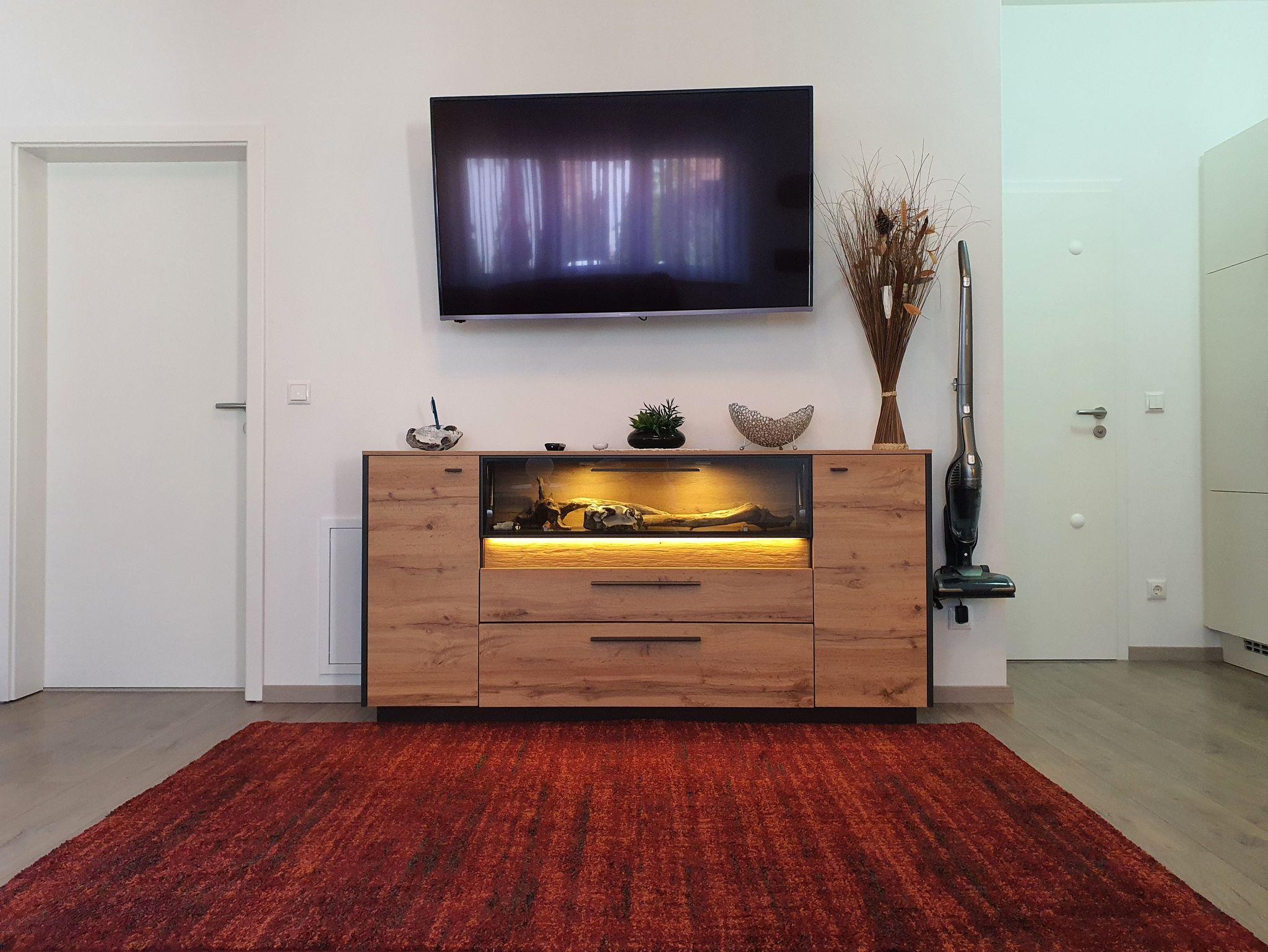 Entspannung finden sie im Wohlfühlbereich der Wohnung. Hier halten wir eine hochwertige und bequeme Polsterecke, einen Relaxsessel und einen Smart TV für sie bereit. Zusätzlich bieten wir Gästen dieser Wohnung eine große, möblierte Terrasse an.