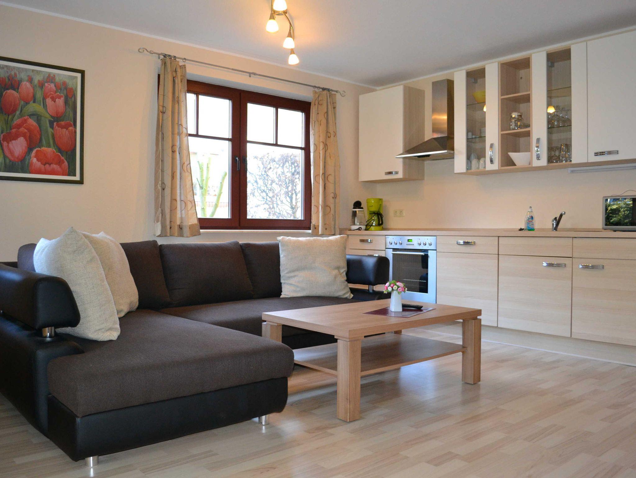 Große Wohnung im EG mit 2 Schlafzimmer mit Babyreisebett, Terrasse und Gartenbenutzung, Wohnzimmer mit WLAN und einer Küche mit Gefriereinheit