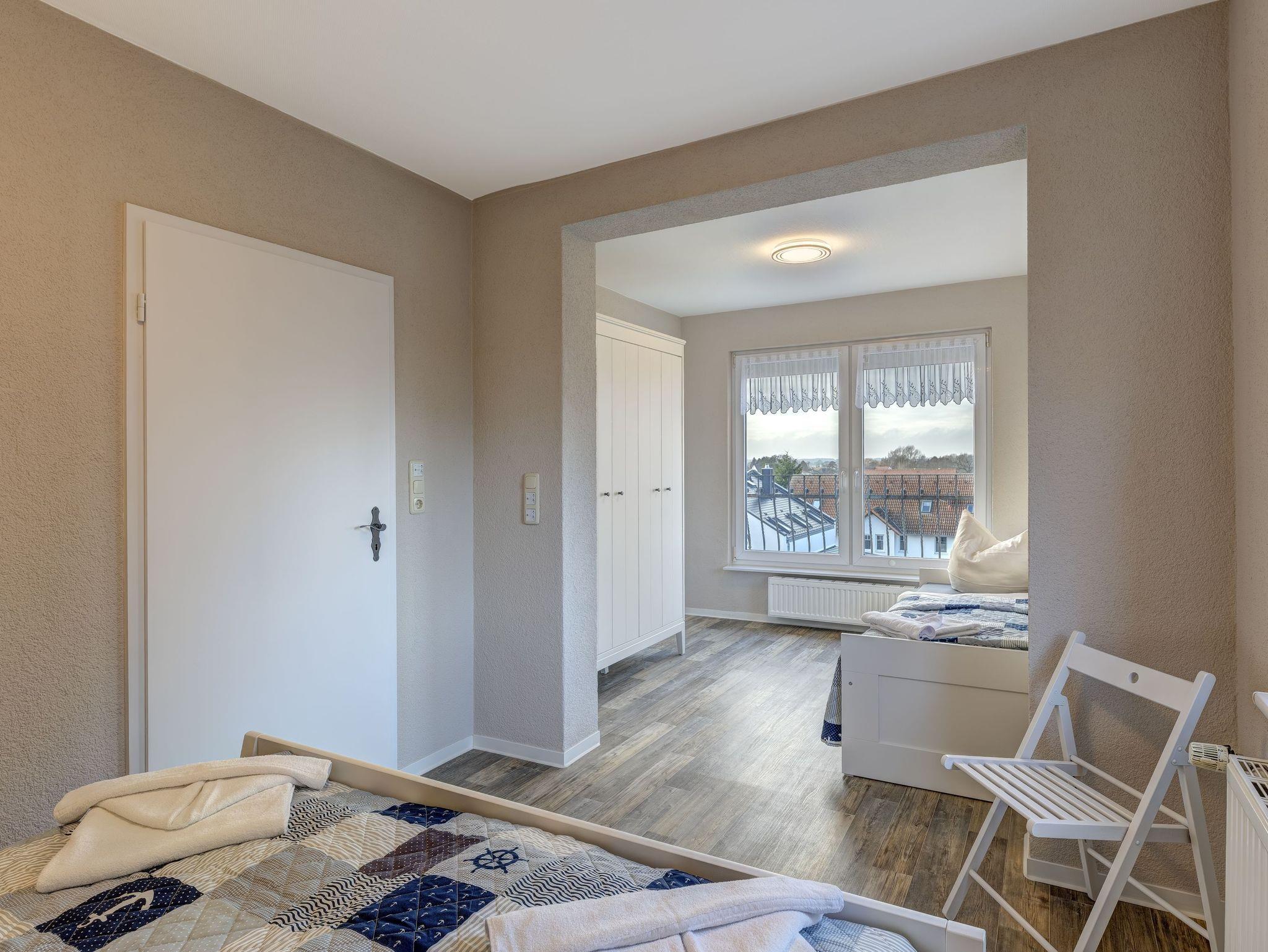 Es bietet Zugang zum Schlafzimmer mit Doppelbett und Einzelbett.