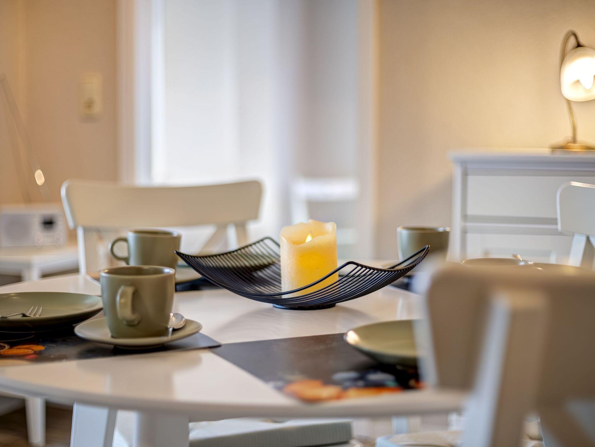 Im jeweils großzügigen Wohn-/Esszimmer finden Sie eine gemütliche Couchecke und einen schönen Essbereich. Die komplett ausgestattete Einbauküche verfügt über Spülmaschine, Induktionskochfeld mit Dunstabzugshaube, Kühlschrank mit Gefrierfach, Kaffeemaschine, Toaster und Wasserkocher.