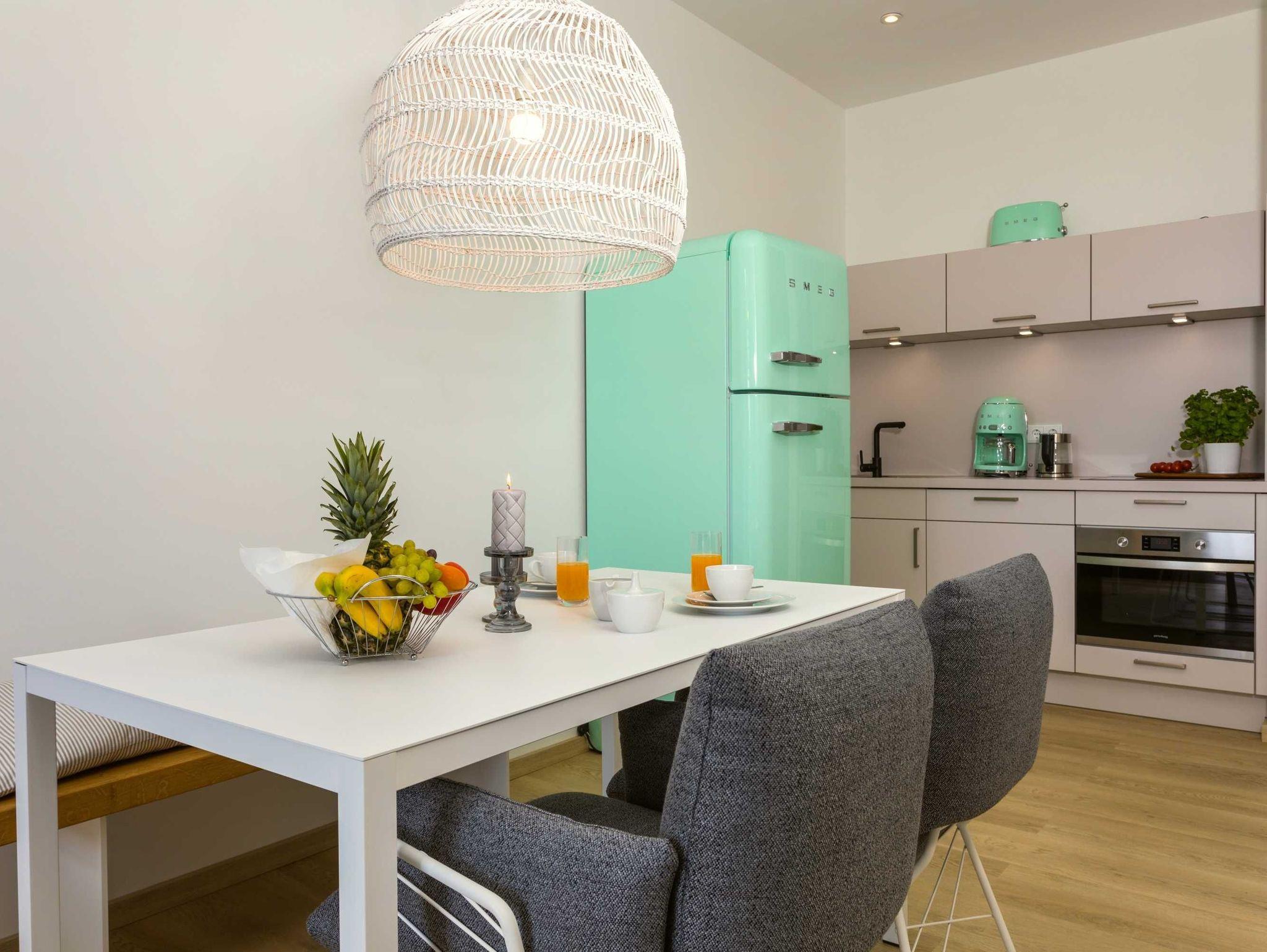 • voll ausgestattete Küche mit Spülmaschine, Mikrowelle, Kaffeemaschine, Backofen, Herd, Kühlschrank mit Gefrierschrank