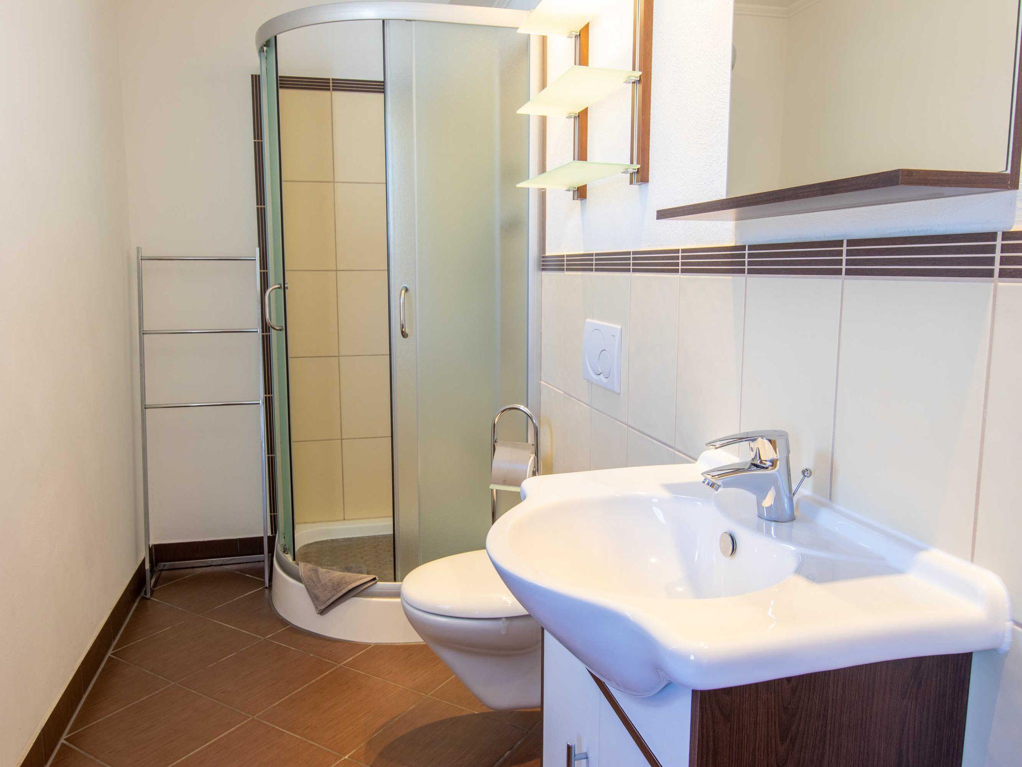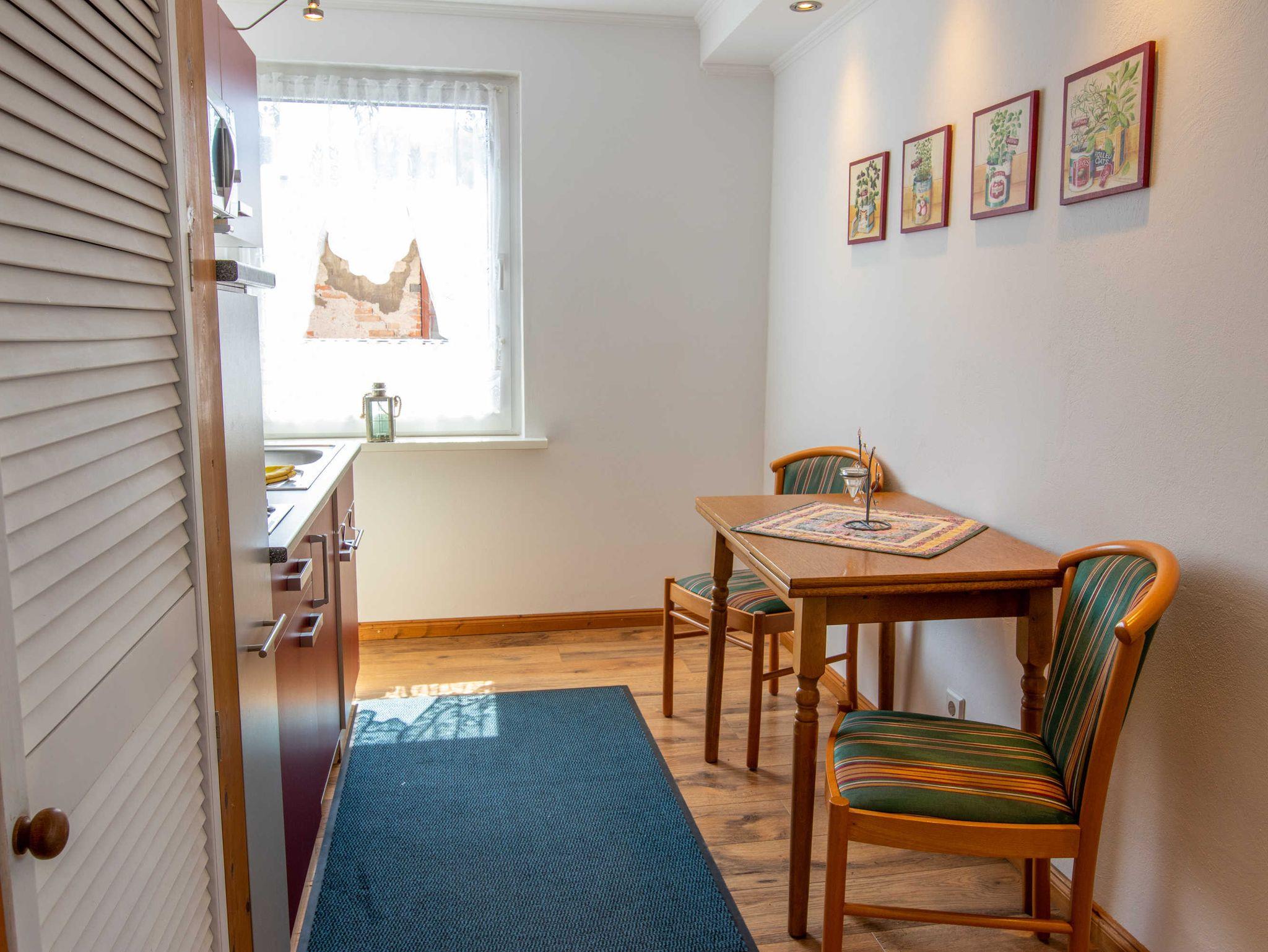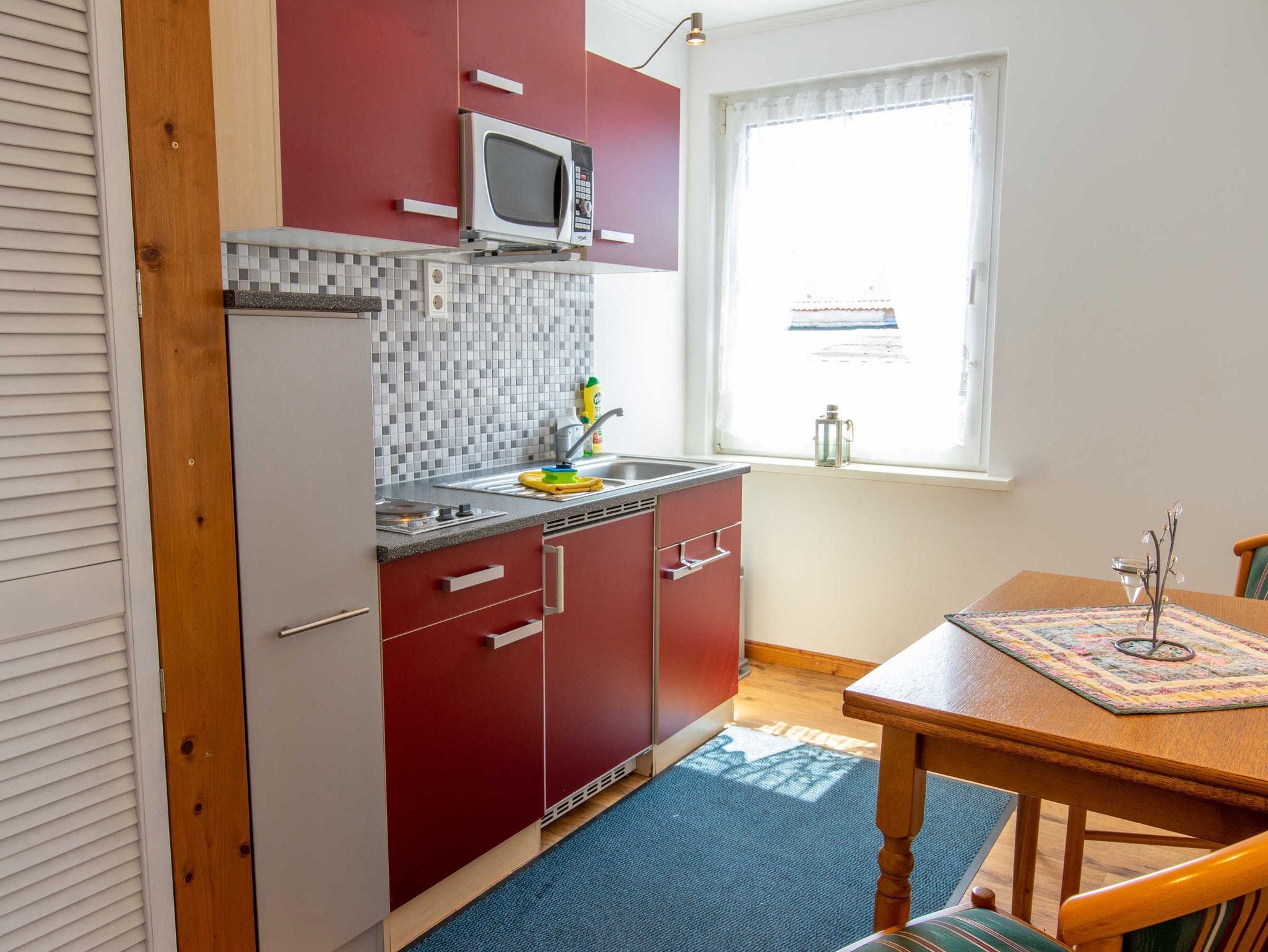 Die komplett mit Töpfen, Pfannen, Geschirr, Besteck, Gläsern und Küchenuntensilien ausgestattete weinrote Einbauküche schließt sich dem Wohn- und Schlafbereich an und verfügt über einen extra Essplatz. Sie ist zudem neben inem Kühlschrank und zwei Kochplatten mit einer Kaffeemaschine, einem Toaster, einem Wasserkocher, einem Eierkocher und einer Mikrowelle ausgestattet. Das Duschbad mit passendem Waschtisch und Fenster ist in warmen Brauntönen gehalten. Außer im Nassbereich ist die komplette Ferienwohnung mit Laminatfußboden ausgelegt. Ein PKW-Stellplatz ist vorhanden.