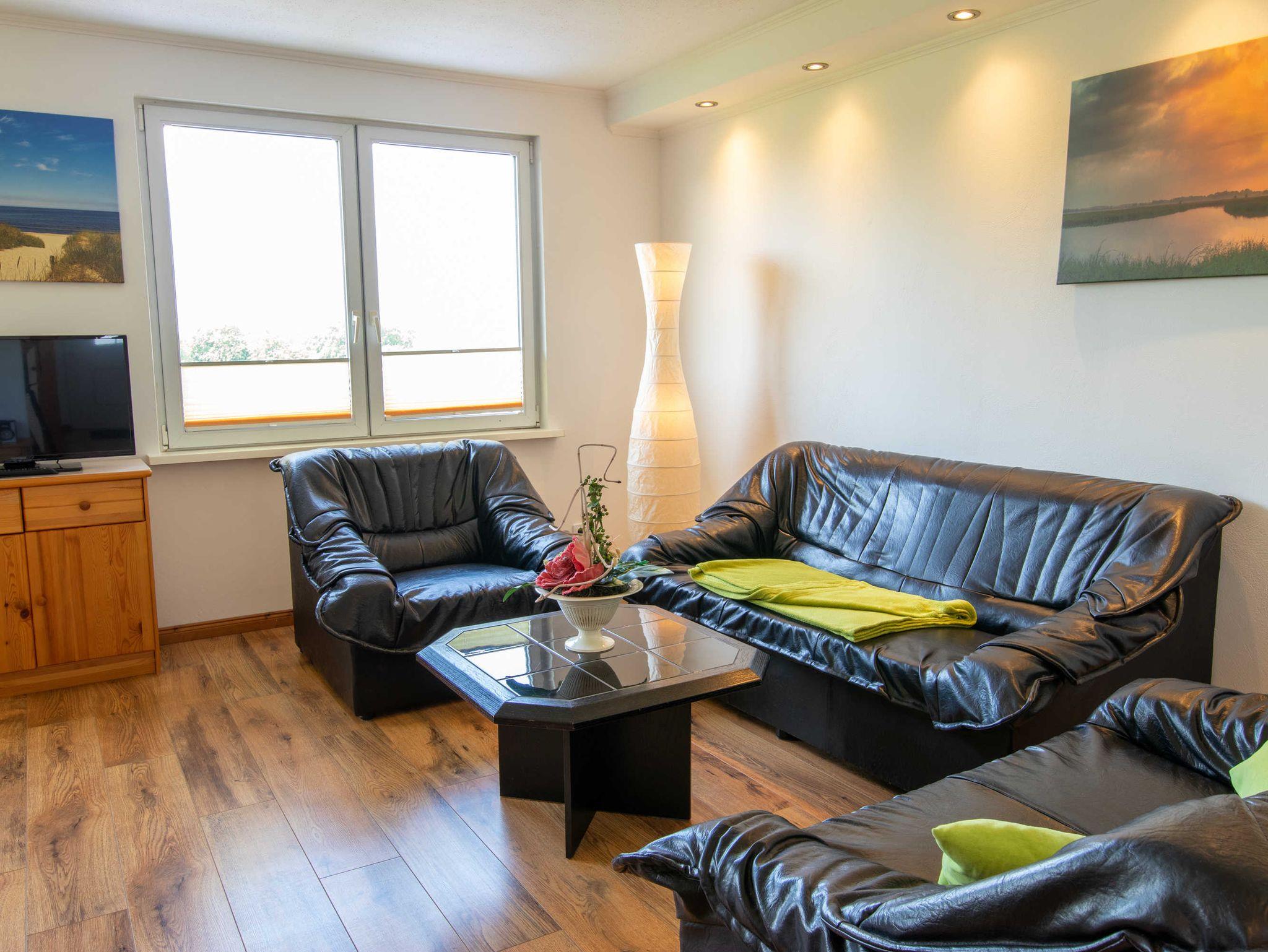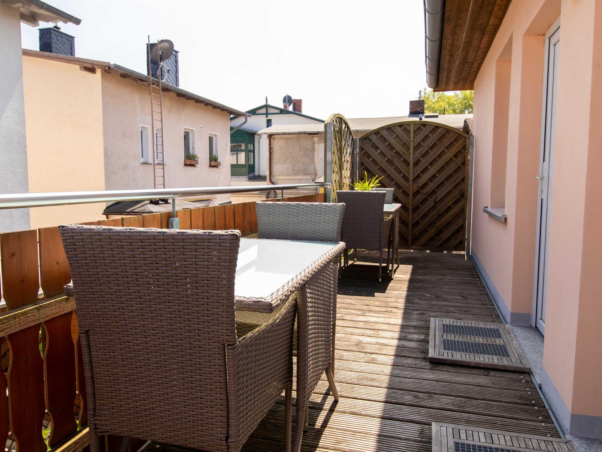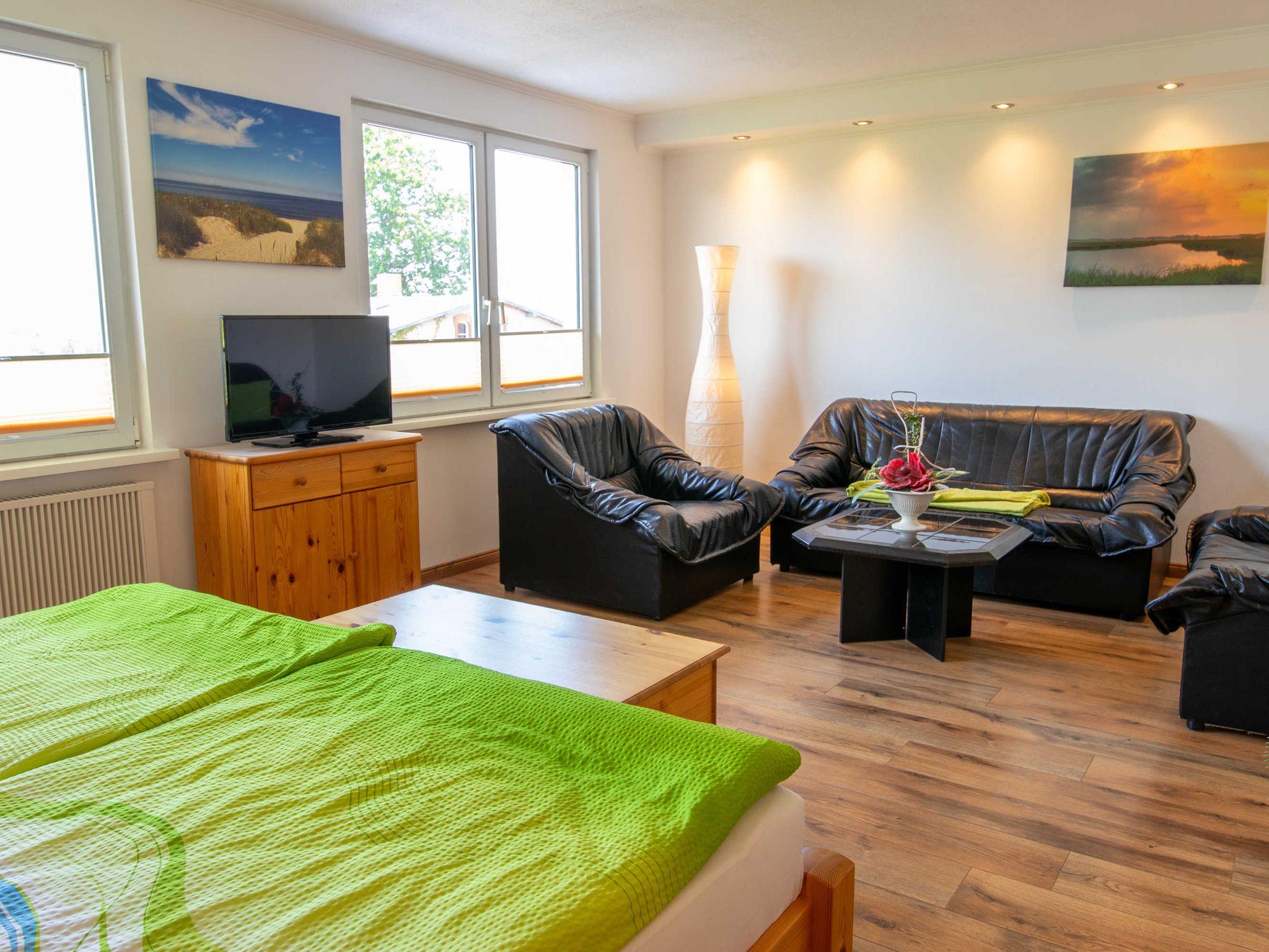 Die Ferienwohnung Inselidyll mit 40 m² befindet sich im Obergeschoss unseres Ferienhauses. Die Wohnung ist für 2 Personen geeignet und verfügt über ein kombiniertes Wohn- und Schlafzimmer, eine separate, offene Küche mit Fenster und ein Duschbad mit Fenster. Auf dem gemeinschaftlich genutzten Balkon kann die Sitzgelegenheit mit hochwertigen Polyrattan-Balkonmöbeln genutzt werden. Kiefern-Naturholzmöbel bestehend aus einem Doppelbett (180x200) mit 3 Nachtschränkchen, einem 3 türigen Kleiderschrank, einer Kommode sowie einer Truhe bilden den Schlafbereich. Im Wohnbereich befindet sich eine großzügige Sitzgruppe mit einem 3-, 2- und 1-Sitzer aus schwarzem Kunstleder. Ein Flachbildschirm-TV und ein CD-Wechsler mit Radio komplettieren das Ganze.