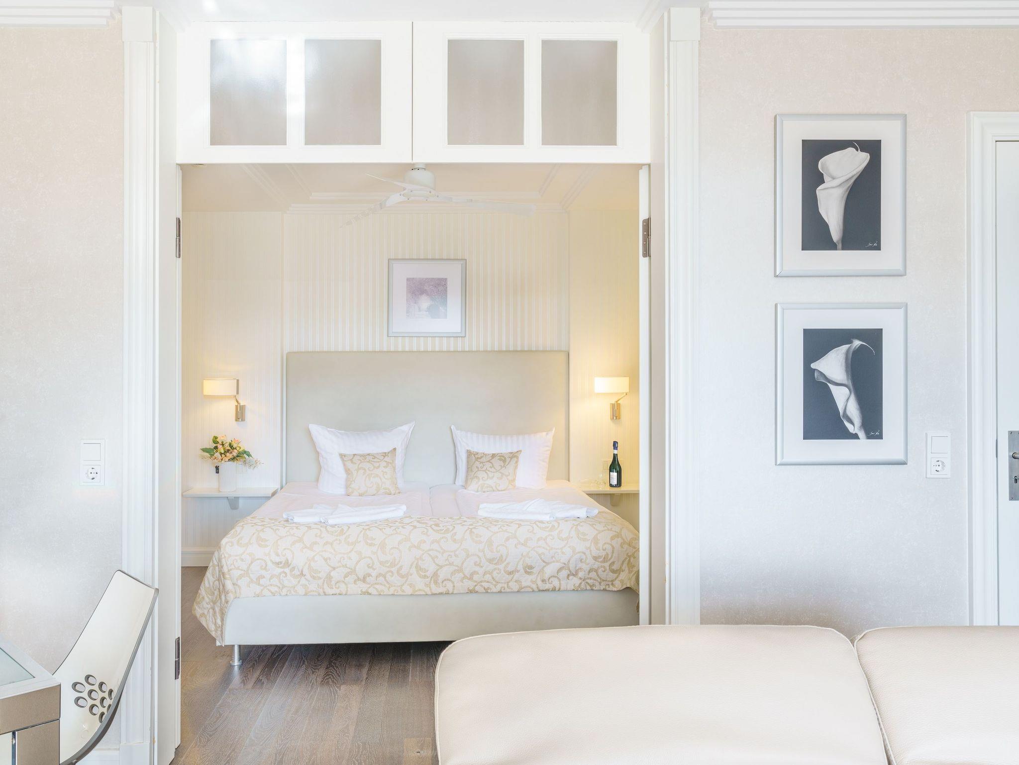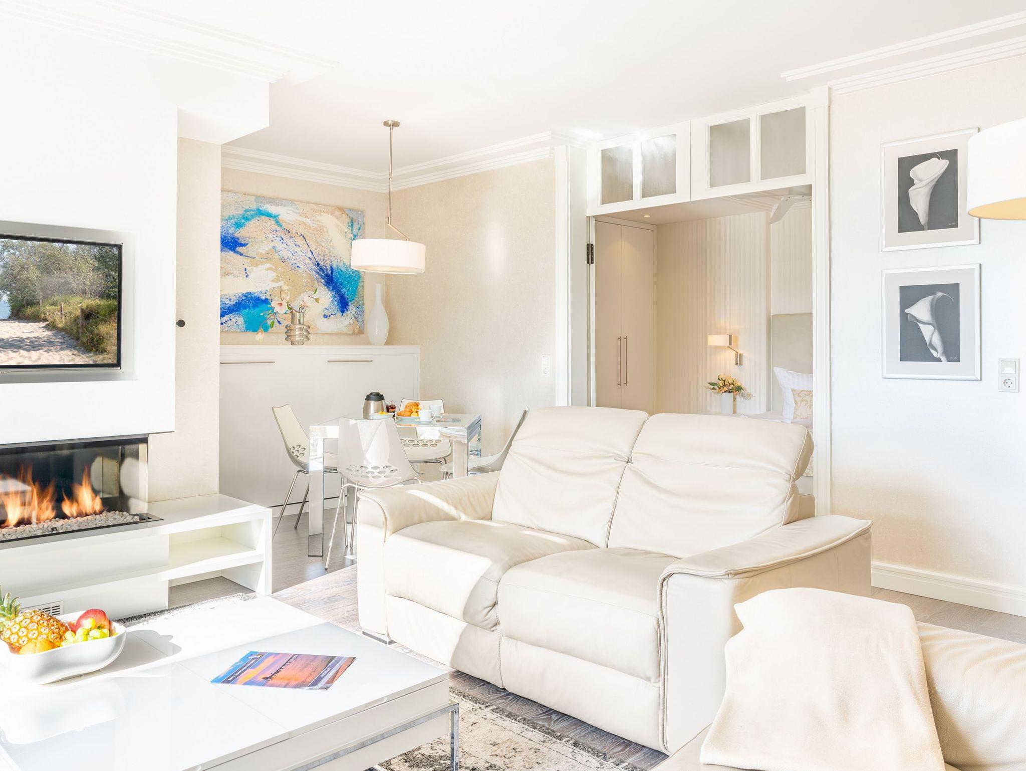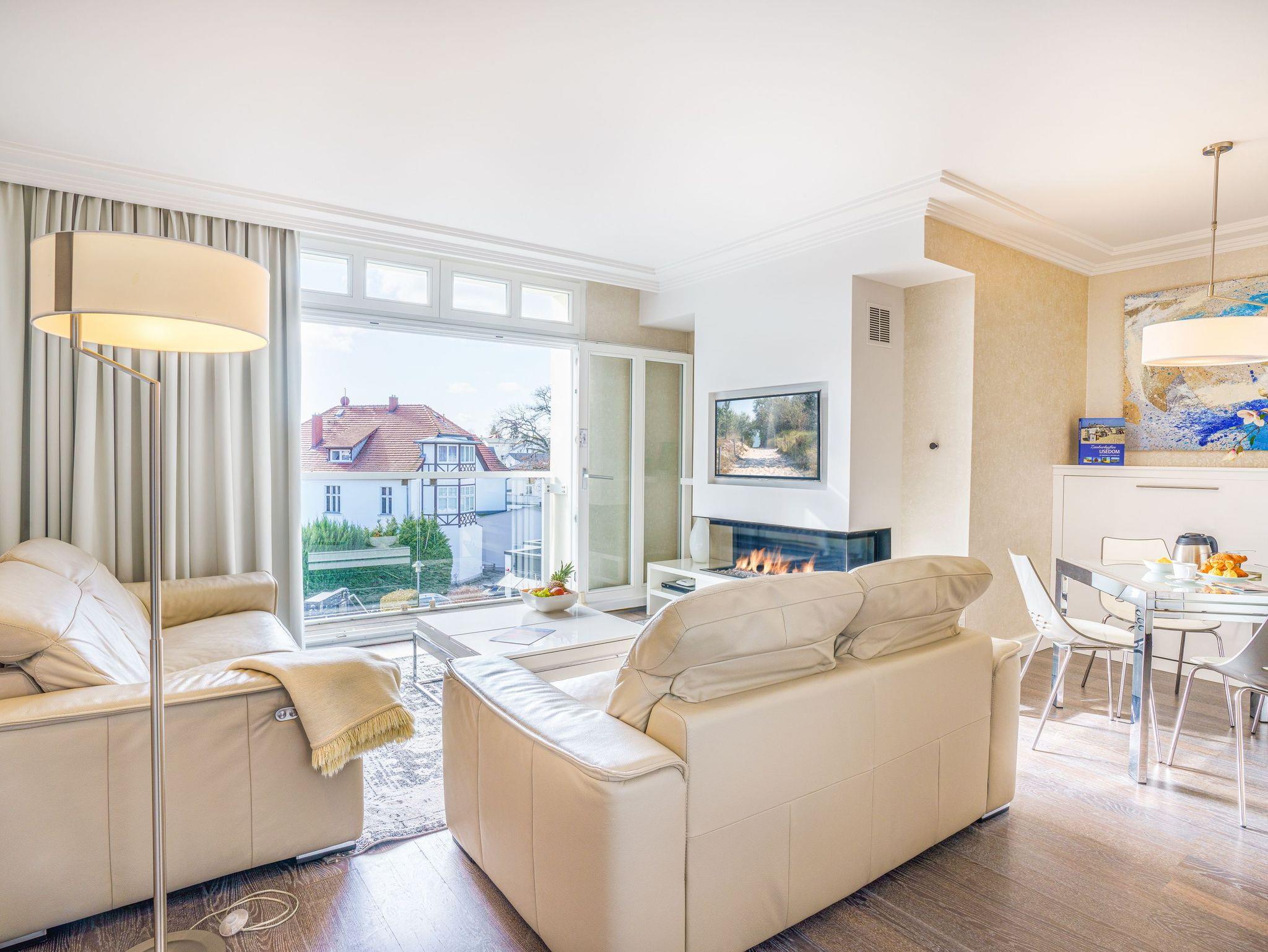 Das luxuriöse 2-Raum-Appartement mit einer Größe von 53 Quadratmetern im 1.Obergeschoss der Villa Gruner ist das perfekte Urlaubsdomizil für Paare oder Freunde. Dank der großen Fenster-Schiebetüren (mit zusätzlich integriertem Insektenschutz) wirkt das Wohnzimmer beim Öffnen dieser wie ein großzügig überdachter Balkon.