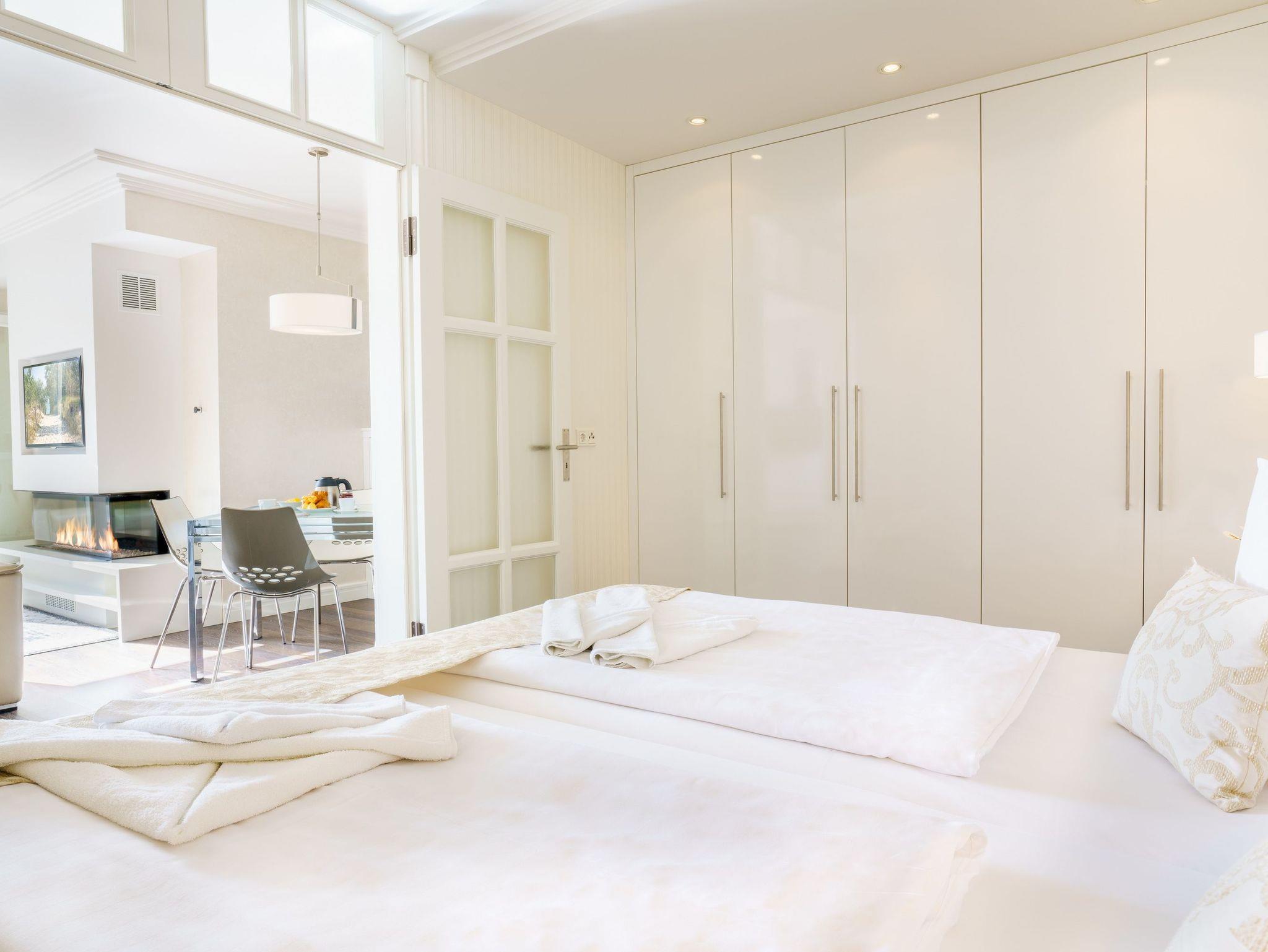 Der moderne Wohnbereich lädt mit einer Relaxcouch zum Verweilen vor dem Gaskamin oder dem Flat-TV ein. Die im Wohnraum integrierte Designerküche mit Kaffeevollautomat bietet jeglichen Komfort (Backofen, Kühlschrank mit Gefrierfach, Geschirrspüler, Wasserkocher, Toaster), den sich ein Kochliebhaber wünschen kann. Das Schlafzimmer ist mit einem komfortablen XXL-Boxspringbett (200 x 200cm / zwei getrennte Matratzen) ausgestattet.