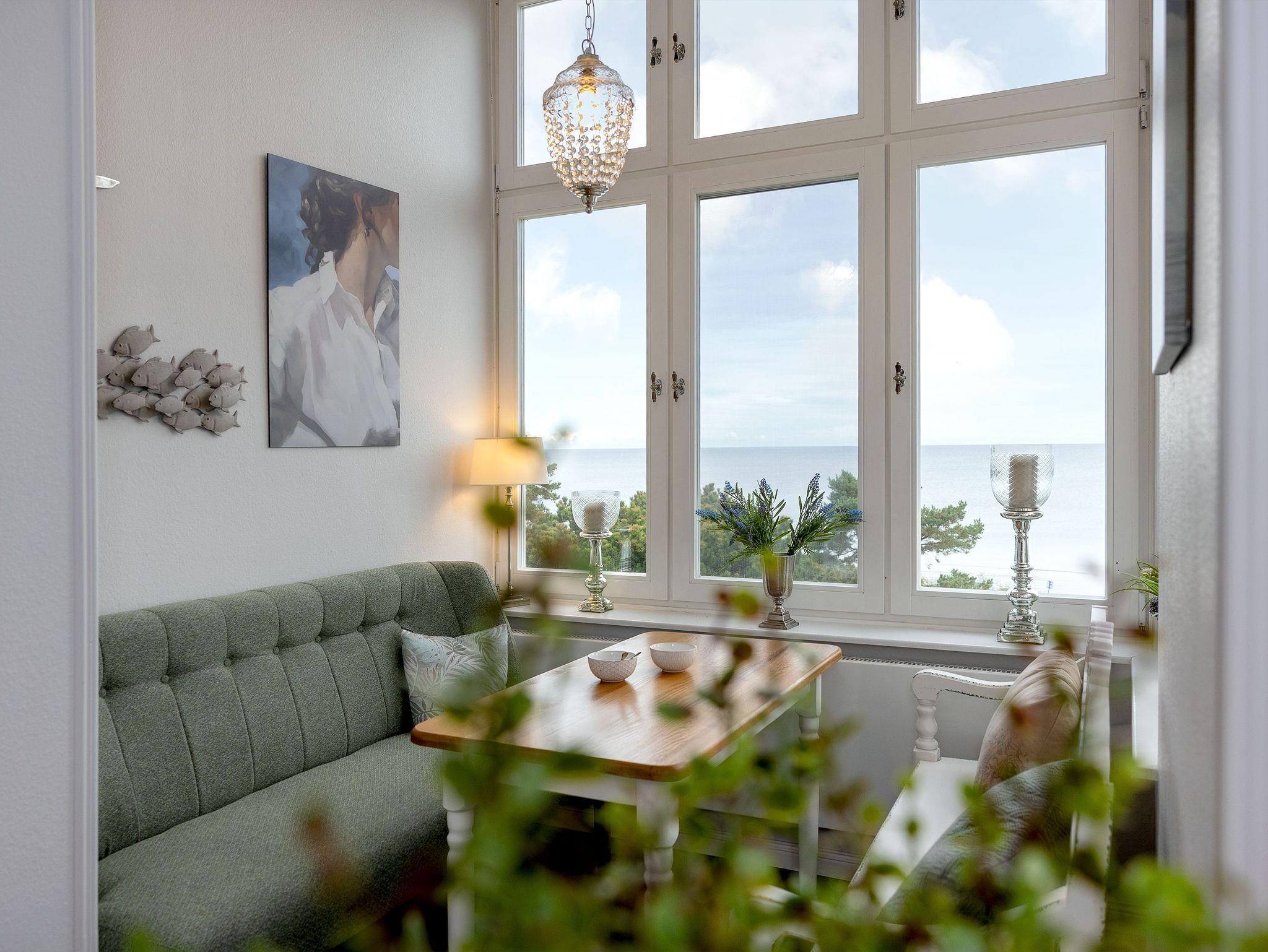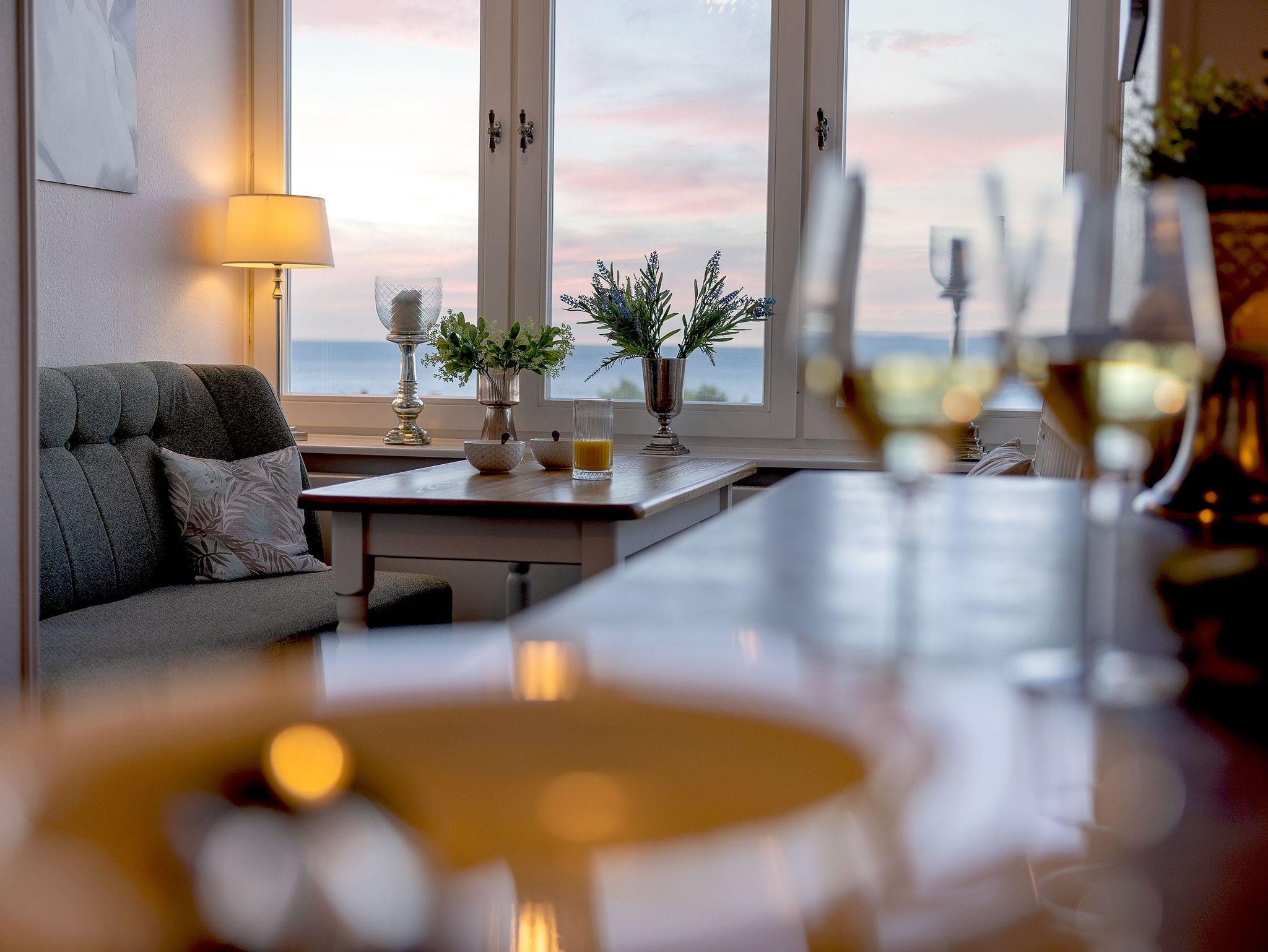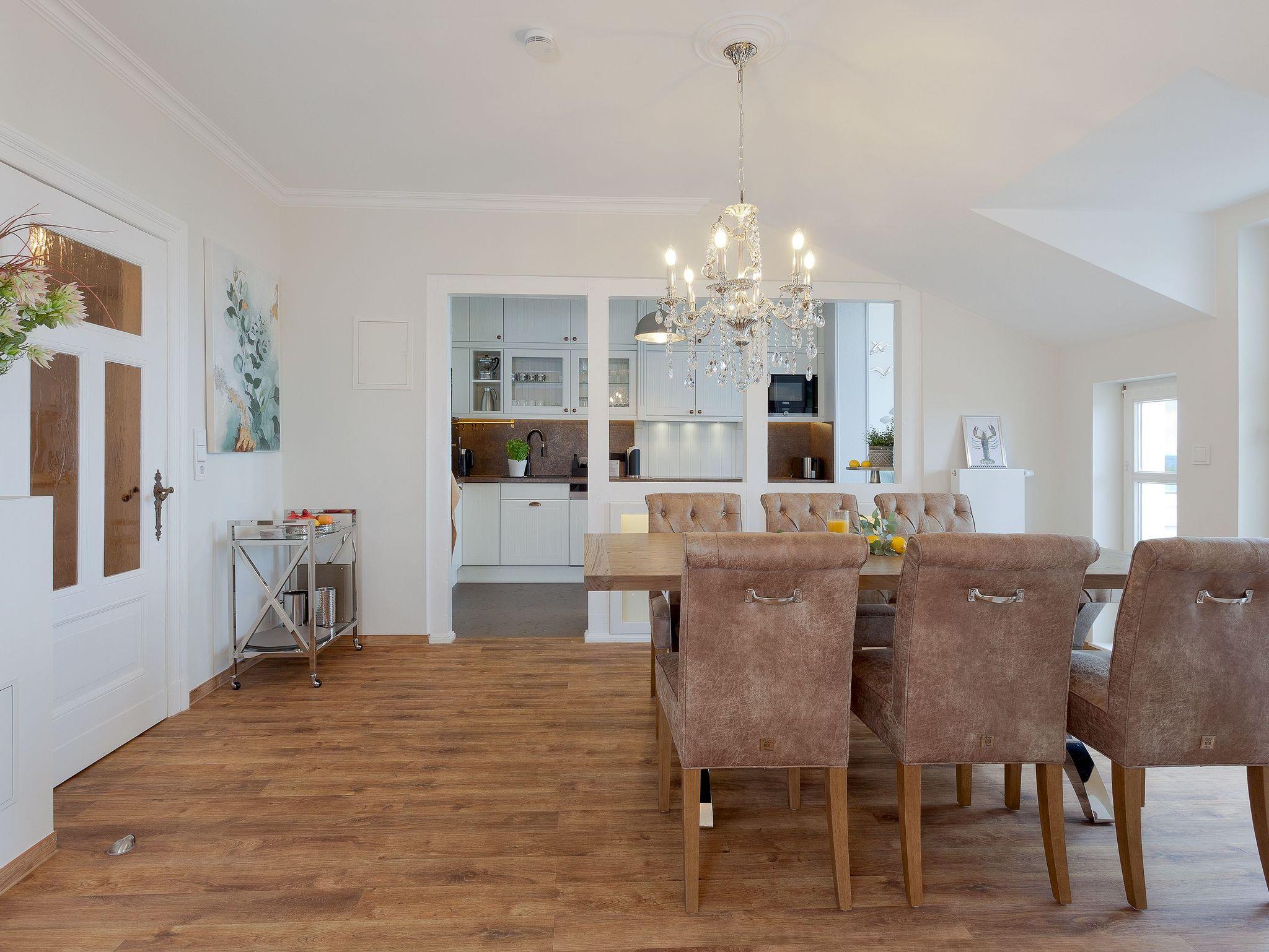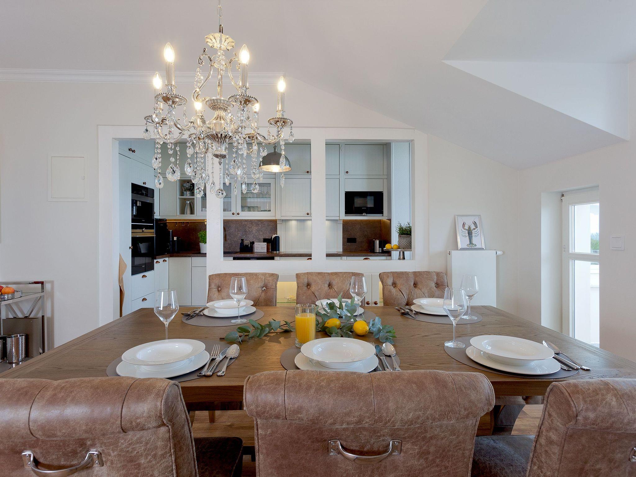 Die voll ausgestattete Küche ermöglicht Ihnen, kulinarische Träume in die Tat umzusetzen. Vom Induktionsfeld über den Geschirrspüler bis zum Toaster ist alles da, was Sie brauchen. Hier können Sie die Zutaten, die Sie in einem der nahegelegenen Supermärkte oder beim Fischer erstanden haben, in ein köstliches Abendessen verwandeln, während Sie die herrlichen Farben der untergehenden Sonne vom Balkon aus beobachten. Vielleicht nehmen Sie Ihr Glas Wein mit nach draußen, spüren die frische Brise und genießen diesen Moment der vollkommenen Entspannung. Sollte das Wetter einmal nicht mitspielen, lädt Sie die gemütliche Sitzecke in der Küche zu einem sagenhaften Blick auf die Ostsee ein. Ein weiterer großzügiger Esstisch wartet auf Sie und Ihre Lieben bei gemeinsamen Spieleabenden. Die offenen Wohn-, Koch- und Essbereiche sorgen dafür, dass Sie stets in Gesellschaft Ihrer Familie oder Freunden sind und die gemeinsame Zeit genießen können.