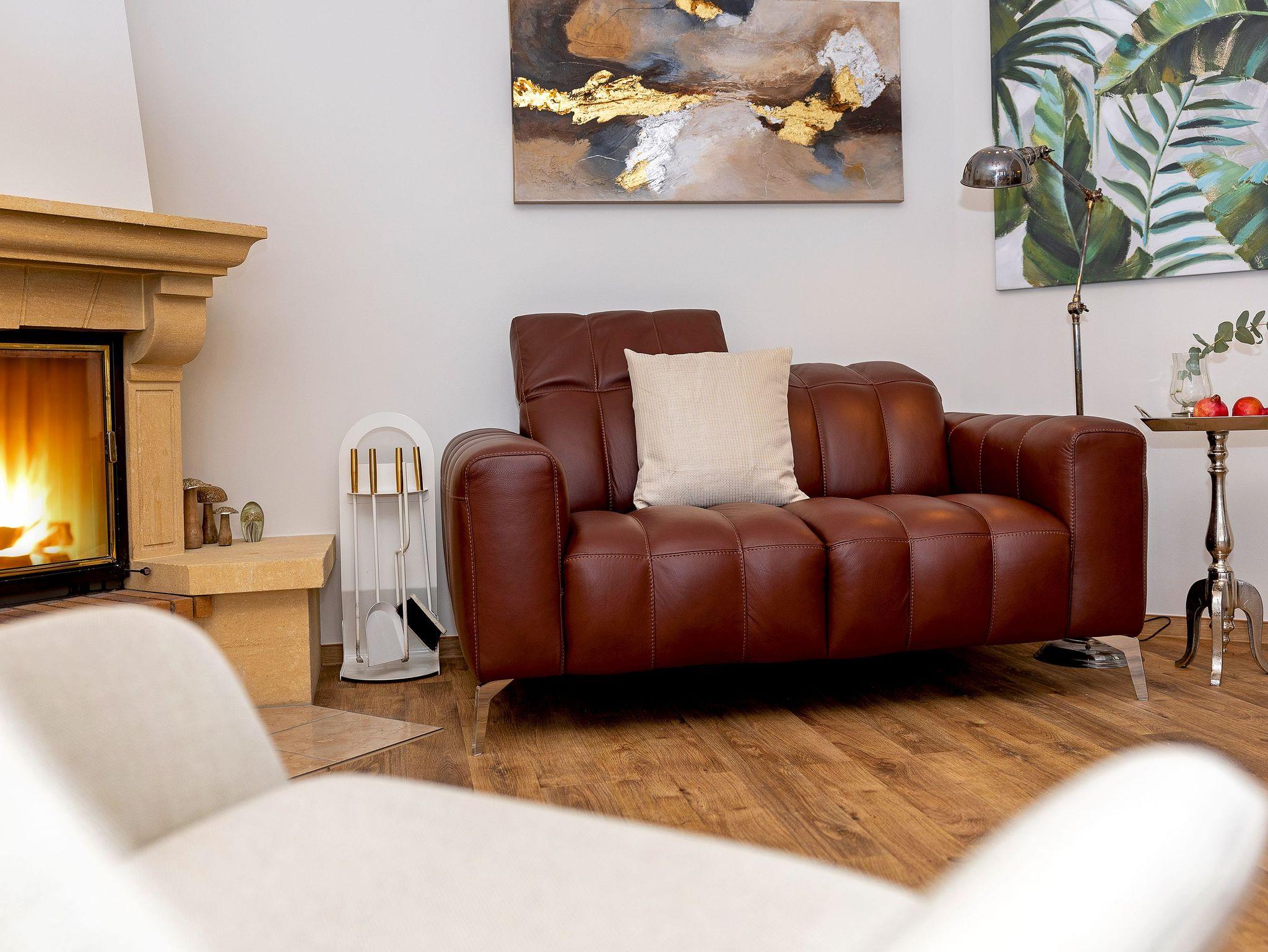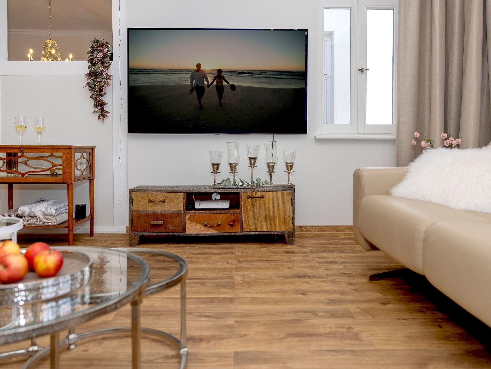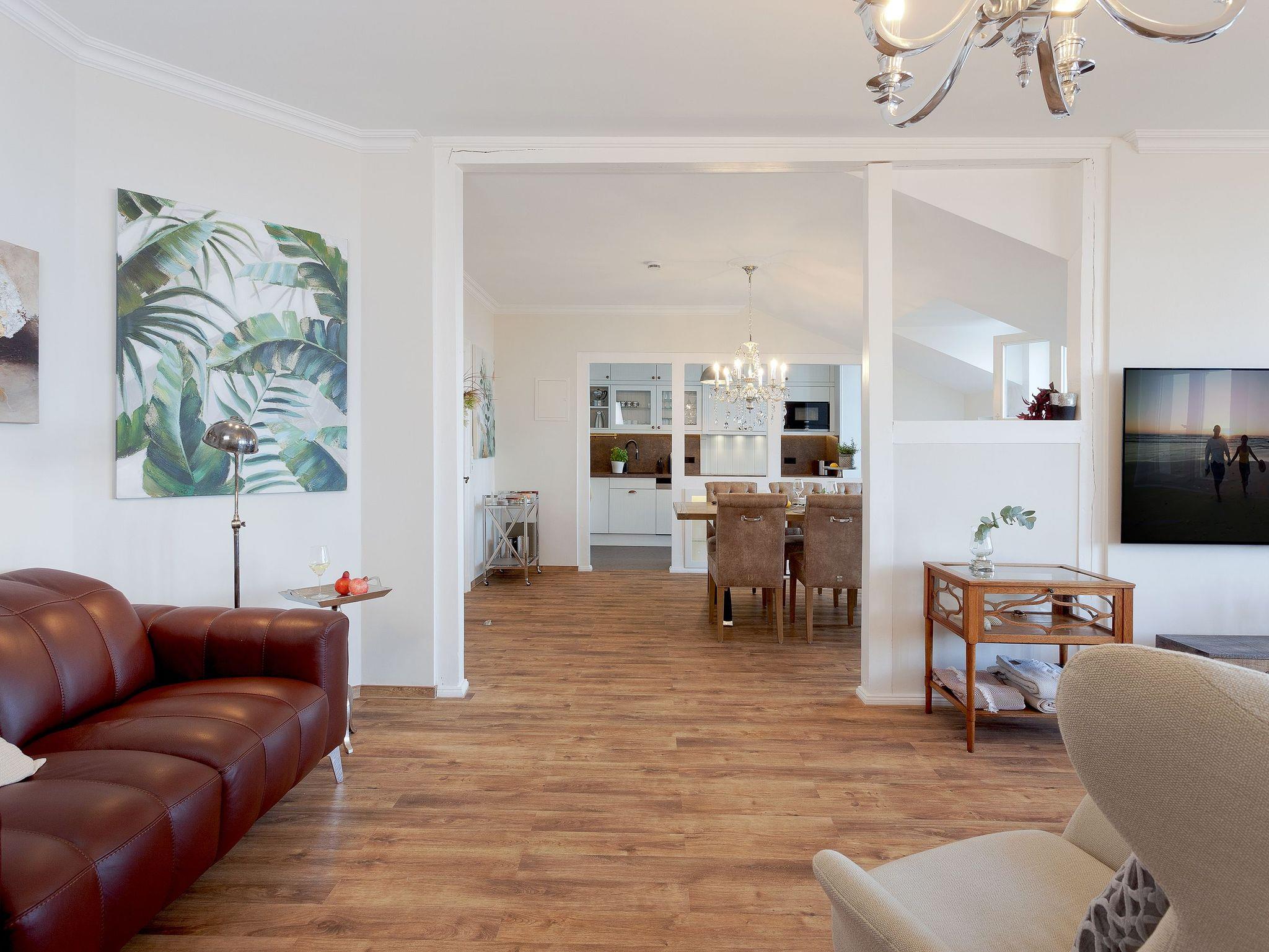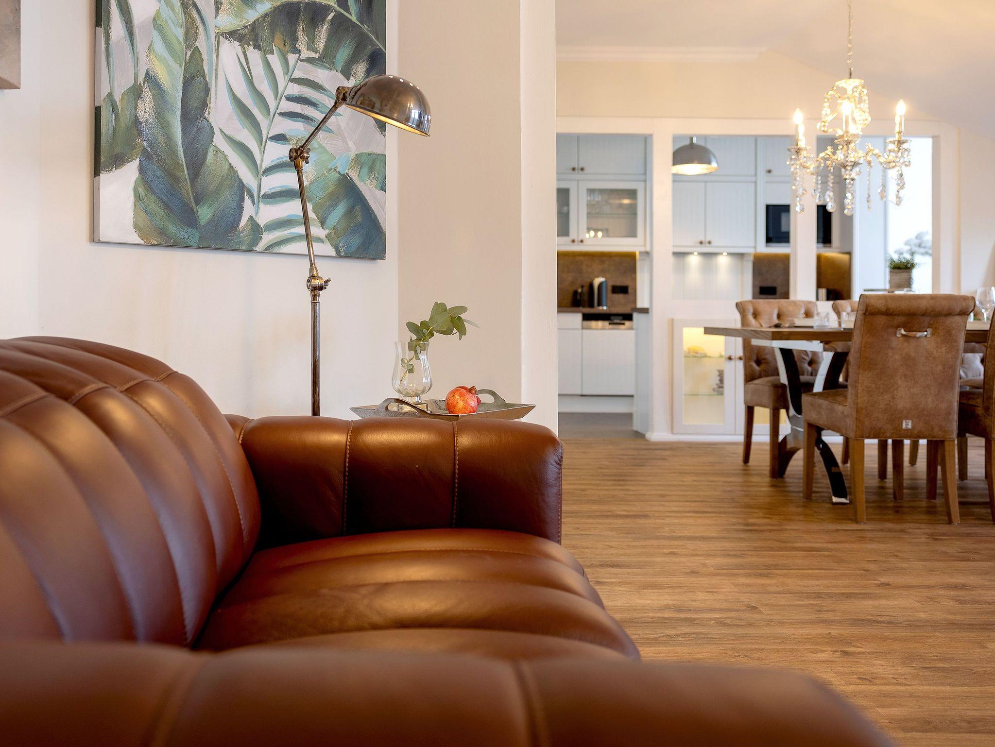 Der Wohnbereich der Seaside ist der perfekte Ort, um gemeinsam mit Familie oder Freunden zu entspannen. Zwei großzügige, stilvolle Ledersofas bieten reichlich Platz für alle, um nach einem Tag am Strand die Füße hochzulegen und zu genießen. Ob Sie sich mit einem guten Buch zurücklehnen, zusammen einen Film auf dem großen Smart-TV schauen oder eine gemütliche Yogastunde planen hier finden Sie Raum für Ihre kostbaren Momente.