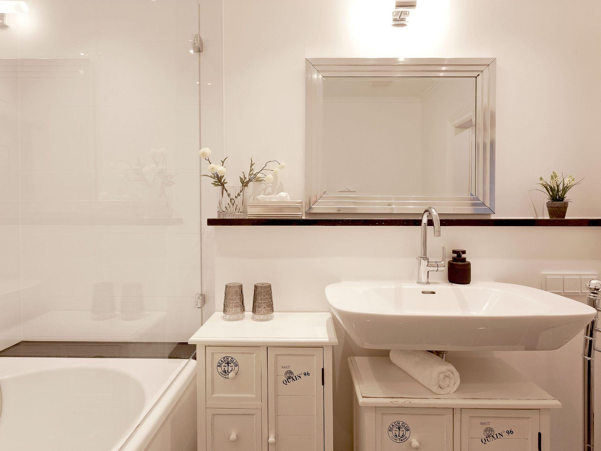 Zwei moderne Badezimmer sorgen für zusätzlichen Komfort: Ein Hauptbad mit Badewanne, Dusche, WC und Waschtrockner sowie ein weiteres mit Dusche und WC. Alles ist für Sie bereit ? vom flauschigen Handtuch bis zum frisch bezogenen Bett, damit Sie sich ab dem ersten Moment wie zu Hause fühlen.